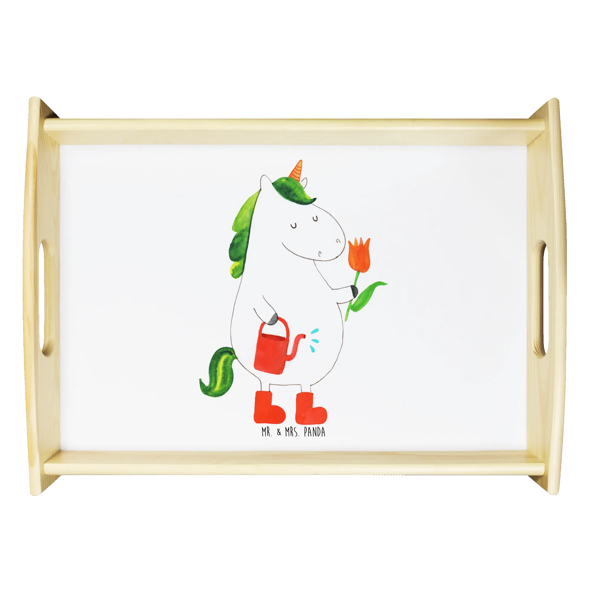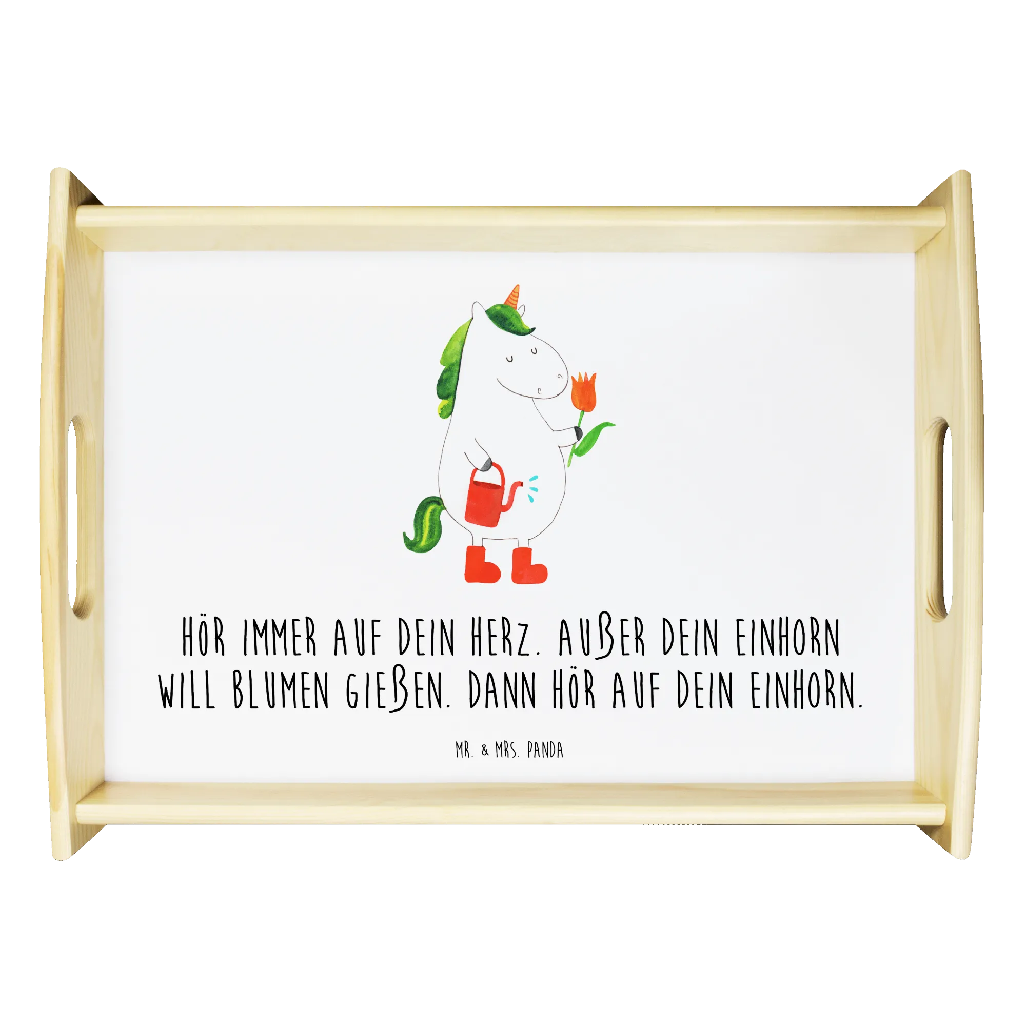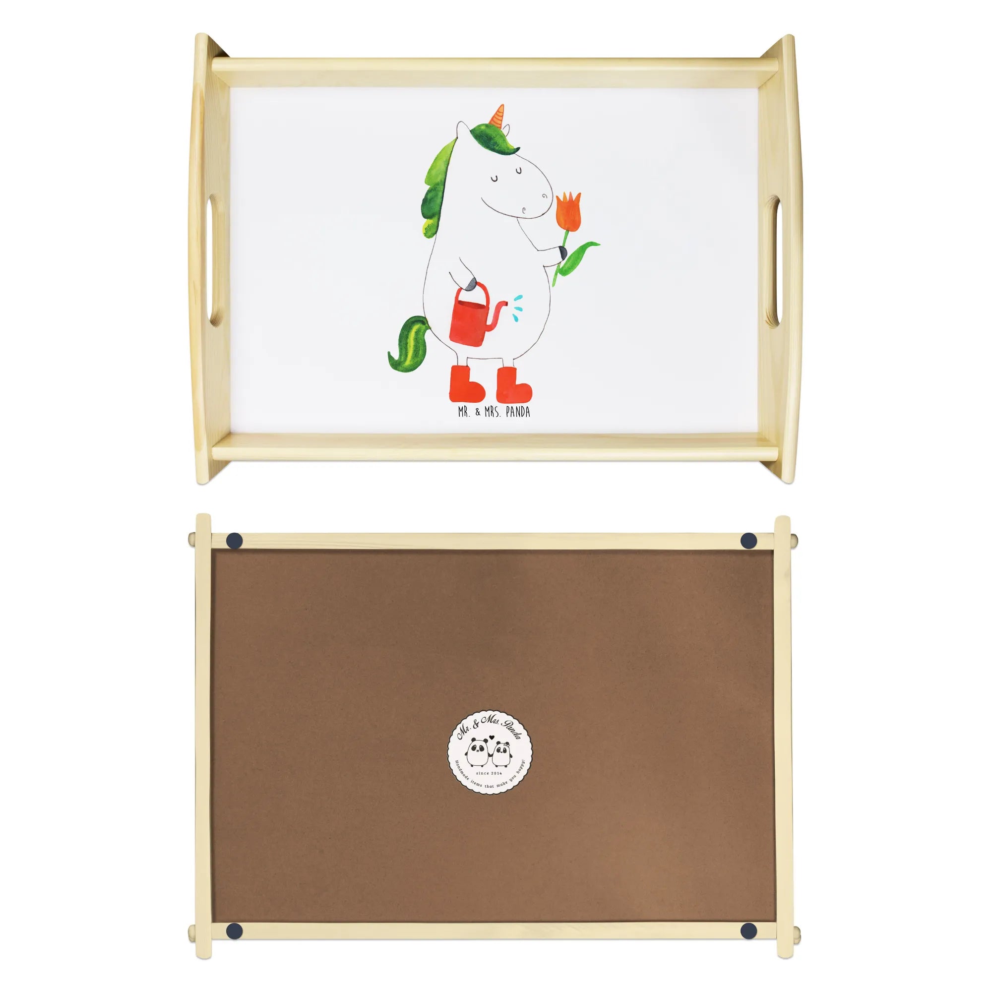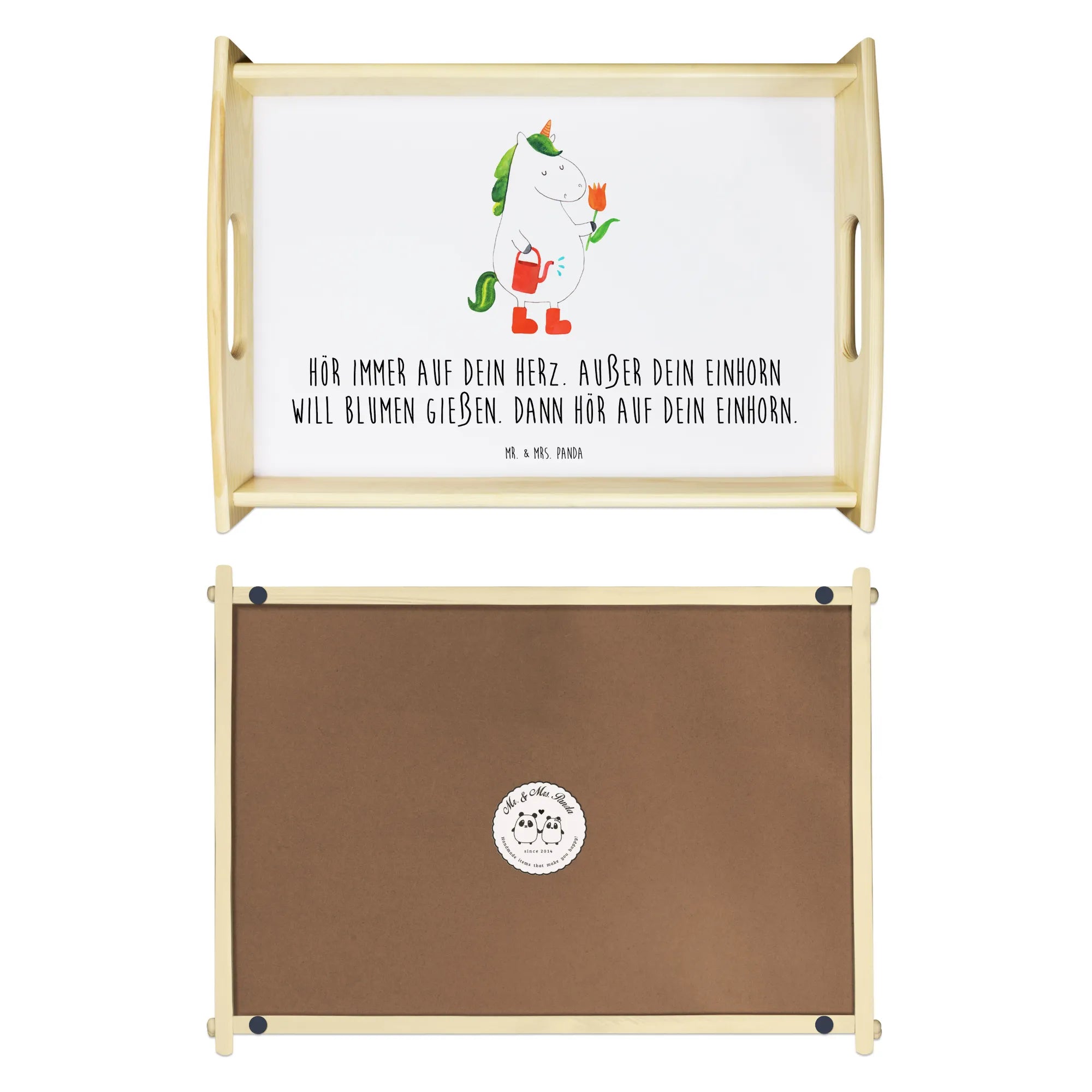 Das einzigartige Serviertablett von Mr. & Mrs. Panda wird dein Frühstücksbuffet zum Erlebnis machen! Mit seinen großzügigen Maßen von 480 mm x 480 mm x 65 mm und einem Gewicht von 925 g ist es die perfekte Kombination aus Funktionalität und Stil. Aus hochwertigem, lasiertem Echtholz gefertigt, verzückt das Tablett mit einem strahlenden Druck, der für gute Laune sorgt. Ob im Bett oder auf dem Sofa, die seitlichen Griffmulden garantieren ein angenehmes Handling. Die spezielle Anti-Rutsch Beschichtung sorgt dafür, dass alles sicher an seinem Platz bleibt. Dank der kratzfesten Oberfläche ist das Tablett sehr pflegeleicht – einfach mit einem feuchten Tuch und etwas Spülmittel abwischen. Bitte nicht einweichen! Denke daran, dass die Anfertigung wegen der hohen Qualität etwas Zeit in Anspruch nimmt.