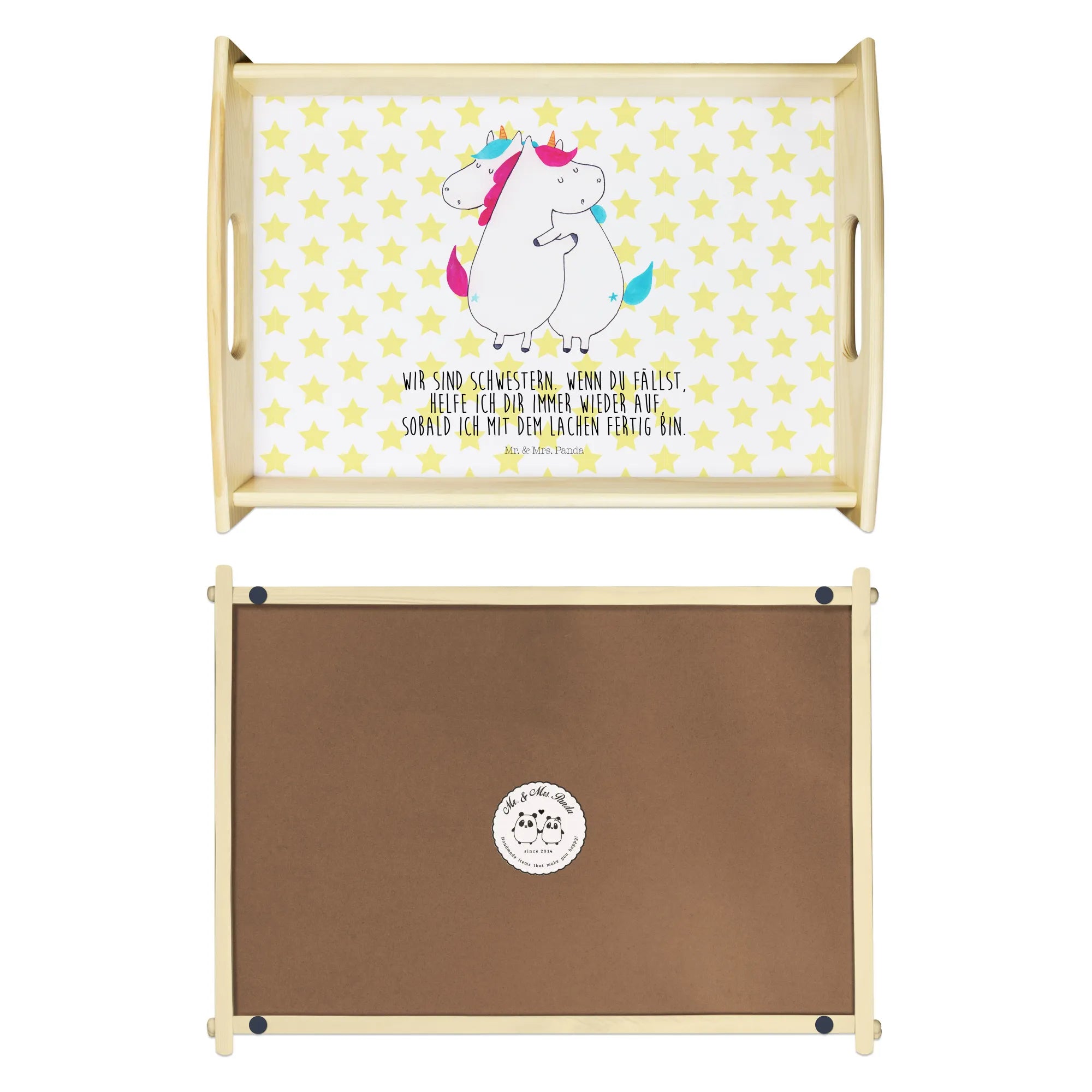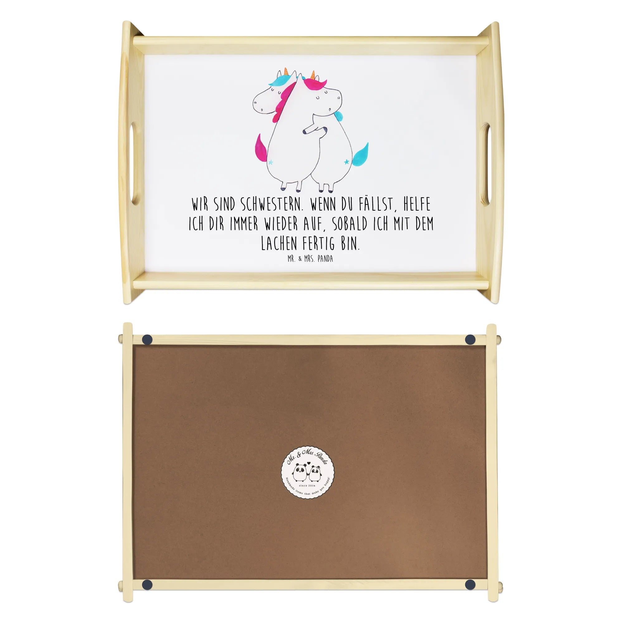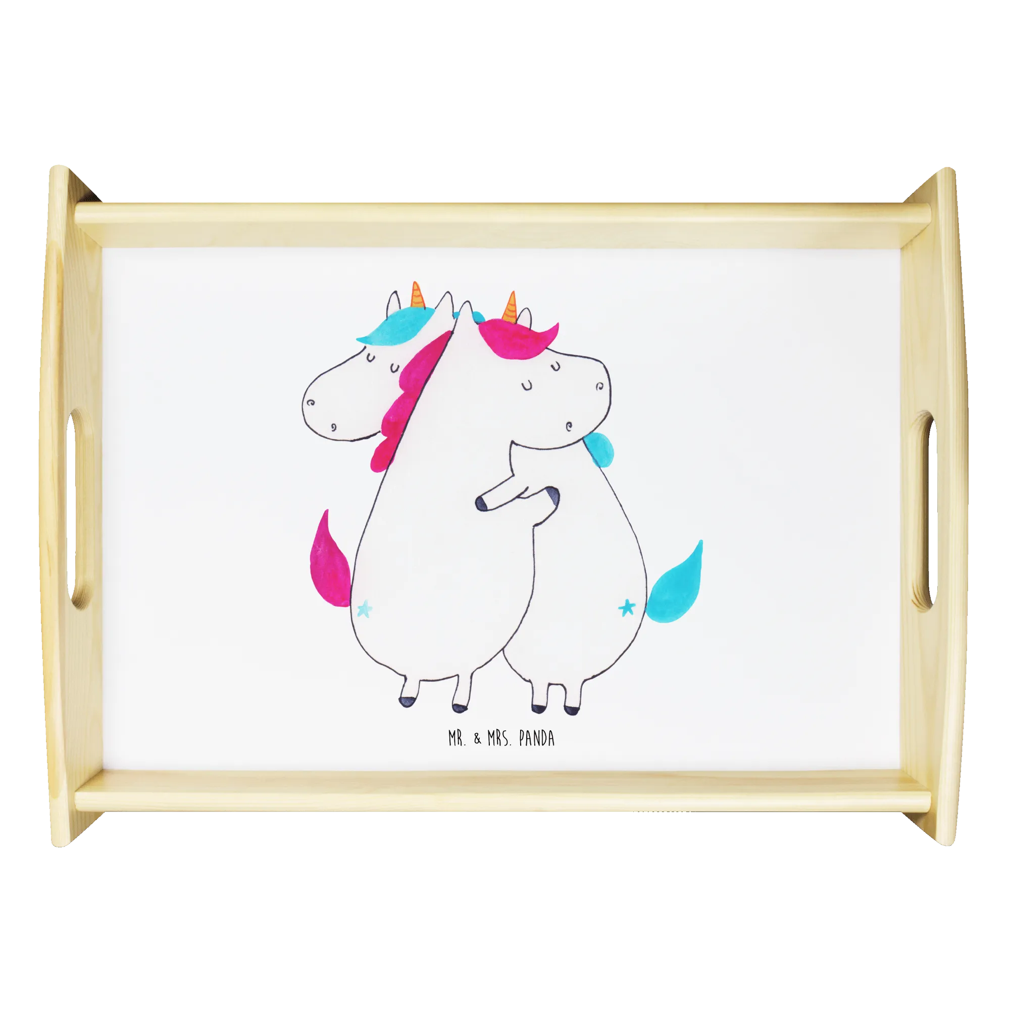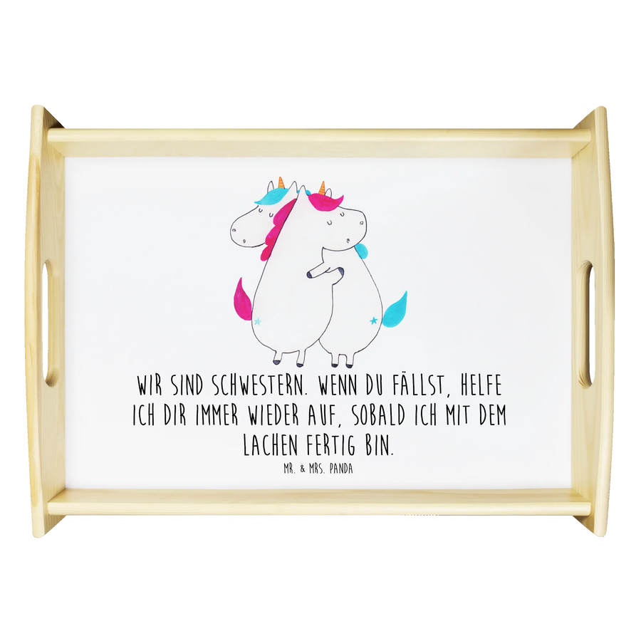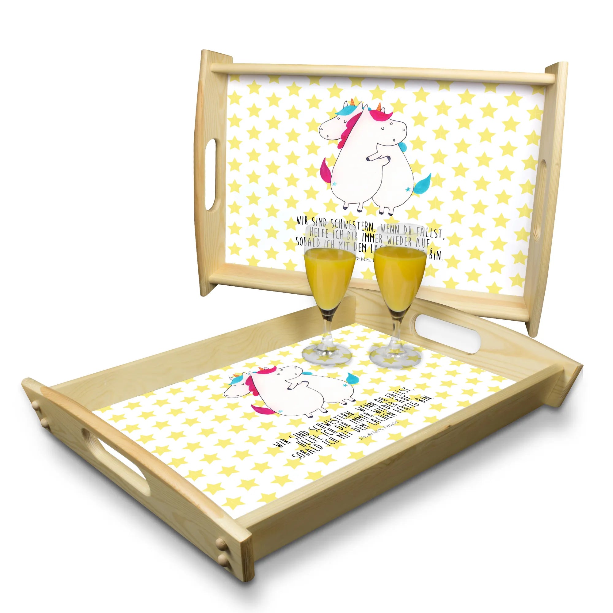 Das einzigartige Serviertablett von Mr. & Mrs. Panda wird dein Frühstücksbuffet zum Erlebnis machen! Mit seinen großzügigen Maßen von 480 mm x 480 mm x 65 mm und einem Gewicht von 925 g ist es die perfekte Kombination aus Funktionalität und Stil. Aus hochwertigem, lasiertem Echtholz gefertigt, verzückt das Tablett mit einem strahlenden Druck, der für gute Laune sorgt. Ob im Bett oder auf dem Sofa, die seitlichen Griffmulden garantieren ein angenehmes Handling. Die spezielle Anti-Rutsch Beschichtung sorgt dafür, dass alles sicher an seinem Platz bleibt. Dank der kratzfesten Oberfläche ist das Tablett sehr pflegeleicht – einfach mit einem feuchten Tuch und etwas Spülmittel abwischen. Bitte nicht einweichen! Denke daran, dass die Anfertigung wegen der hohen Qualität etwas Zeit in Anspruch nimmt.
