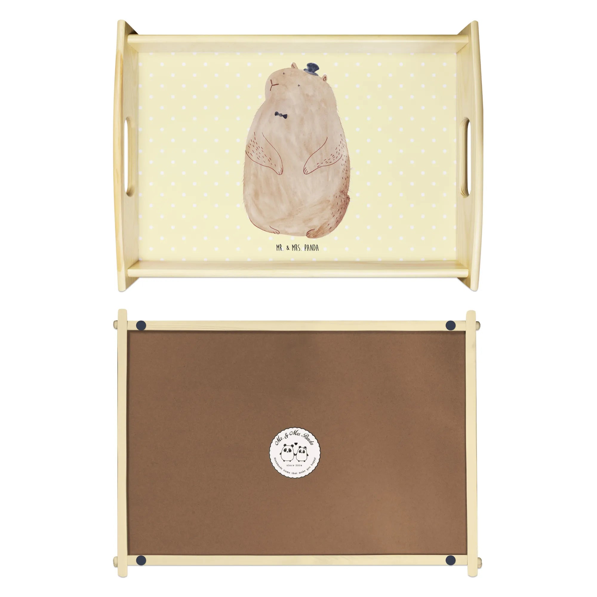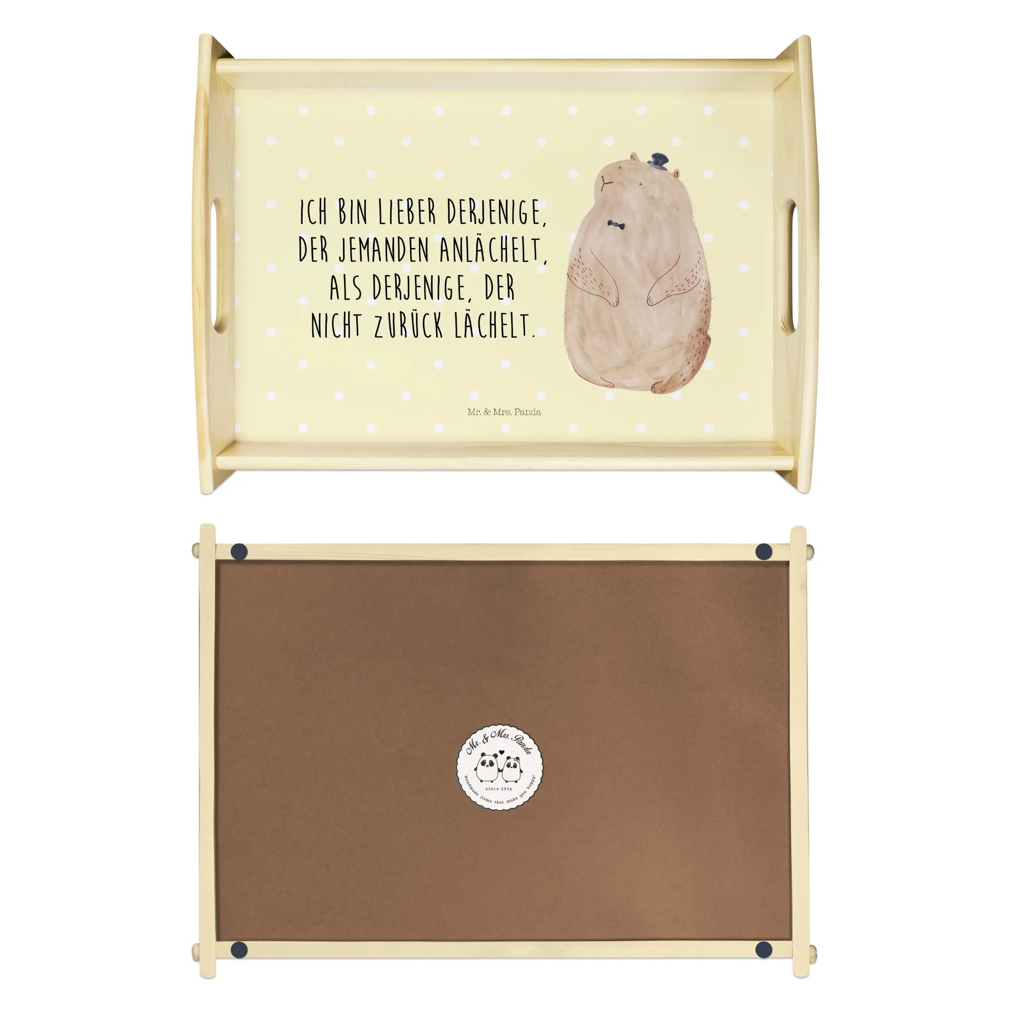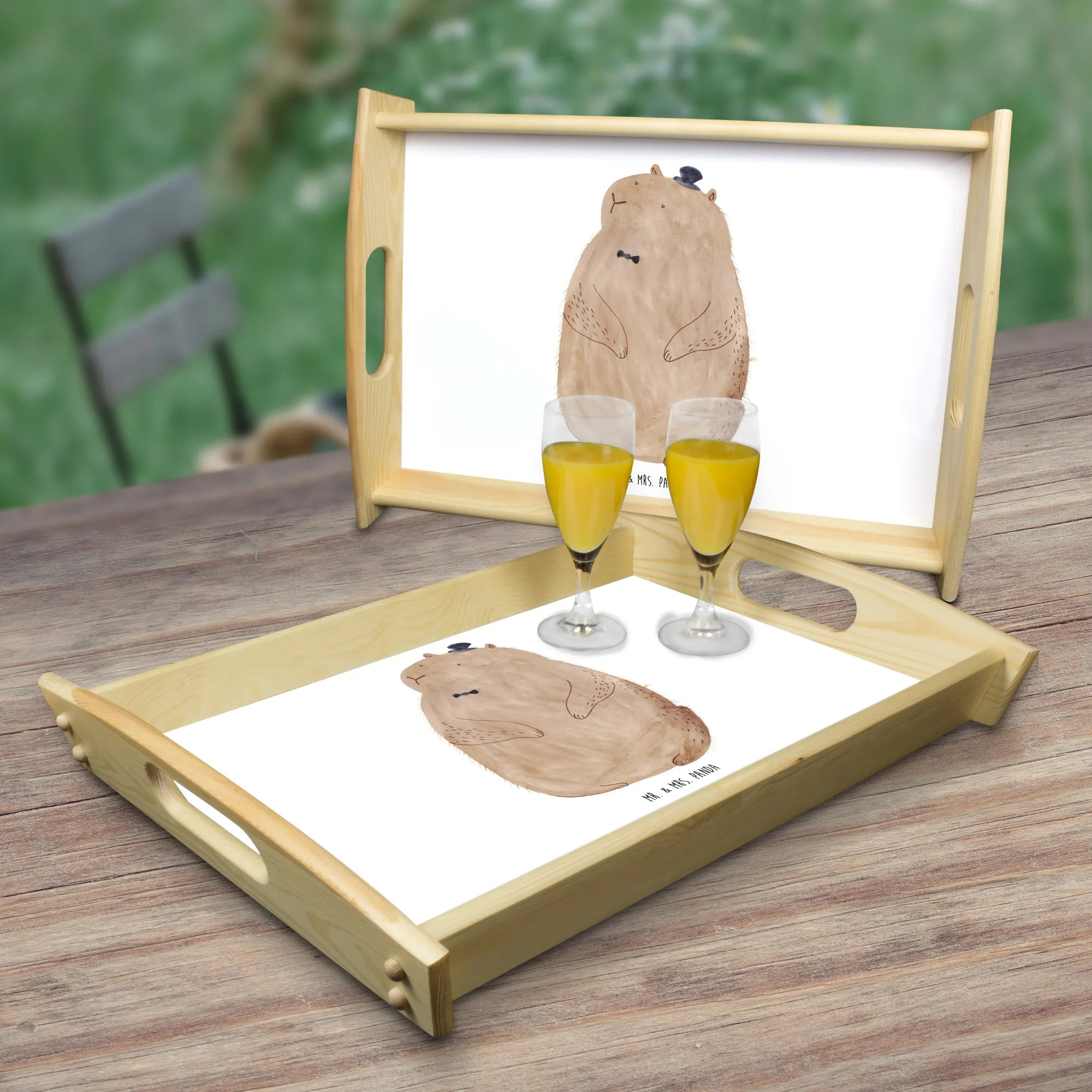 Verwöhne Deine Liebsten mit unserem bezaubernden Serviertablett von Mr. & Mrs. Panda! Mit den Maßen von 480 mm x 480 mm x 65 mm und einem gewicht von 925 g ist es nicht nur hübsch, sondern auch praktisch. Aus lasiertem Echtholz gefertigt, begeistert es mit einem lebendigen Druck, der gute Stimmung verbreitet. Egal ob beim Frühstück im Bett oder beim gemütlichen Abendessen auf dem Sofa – die seitlichen Griffmulden ermöglichen ein einfaches Tragen. Die Anti-Rutsch Pads auf der Unterseite sorgen dafür, dass alles sicher an seinem Platz bleibt. Dank der kratzfesten Oberfläche bleibt dein Tablett nach jeder Benutzung in bestem Zustand – einfach mit einem feuchten Tuch und Spülmittel abwischen, aber nicht einweichen! Beachte bitte die längere Anfertigungszeit aufgrund der besonderen Verarbeitung.