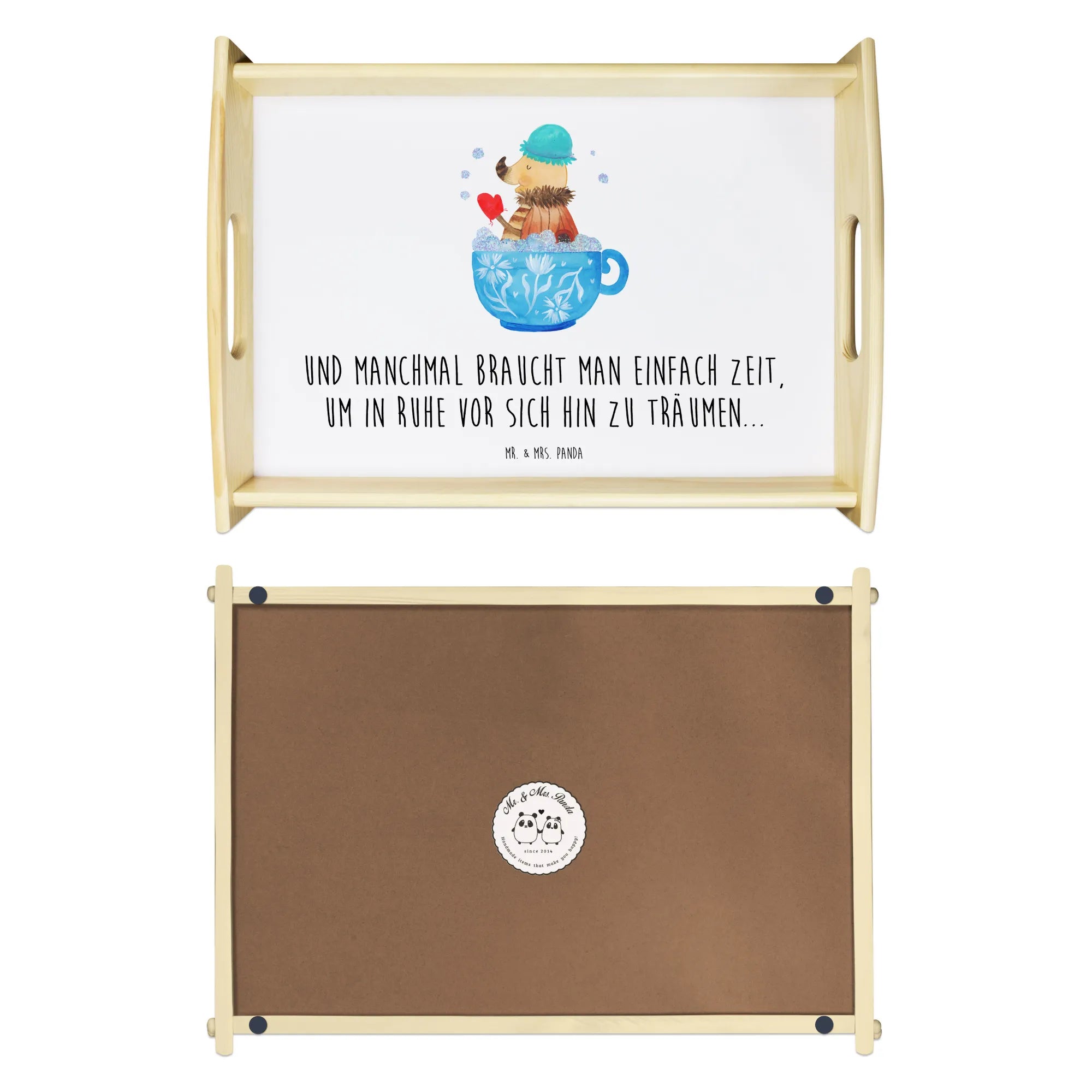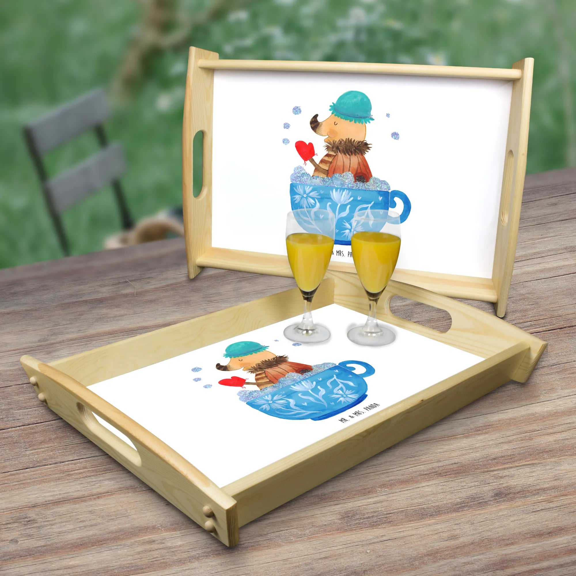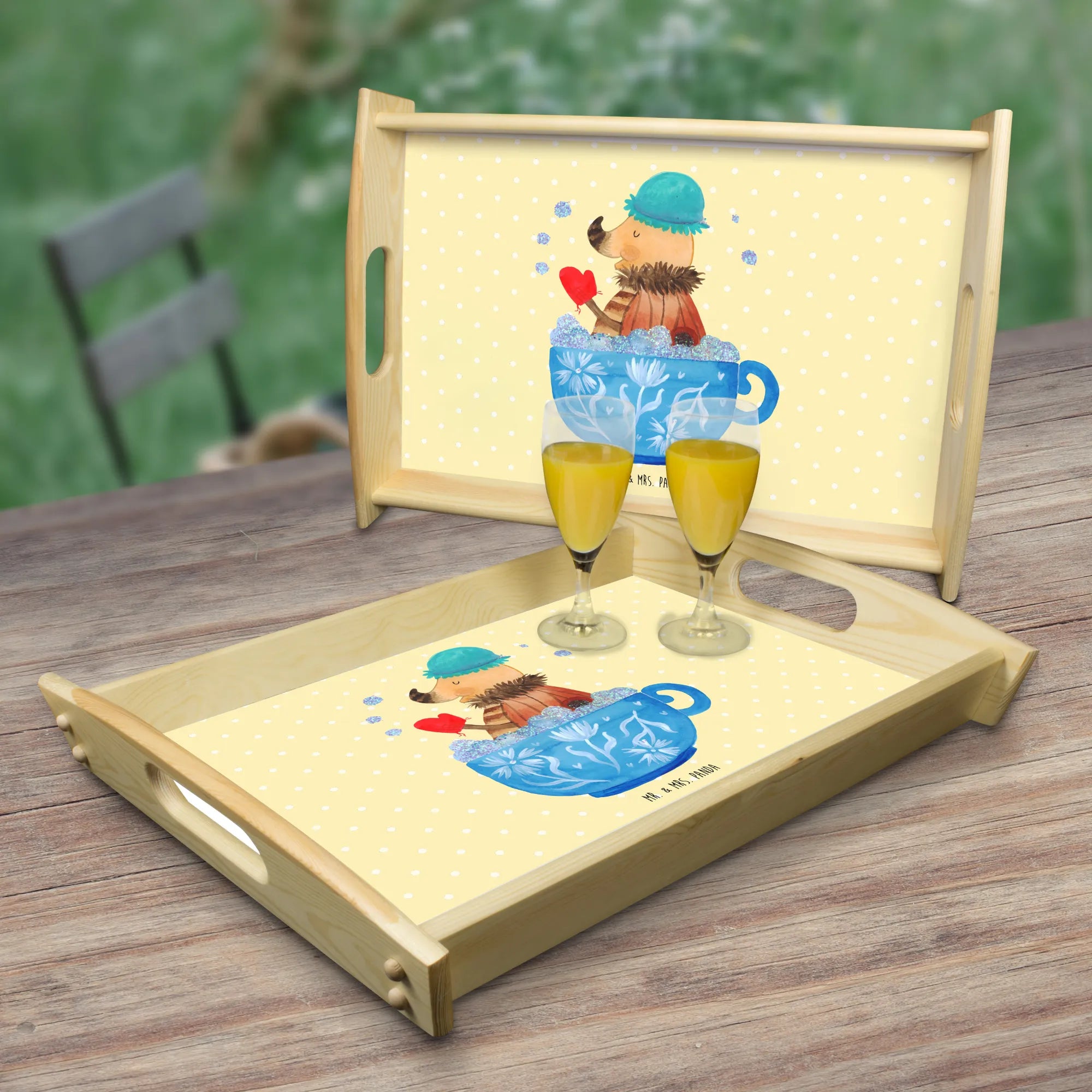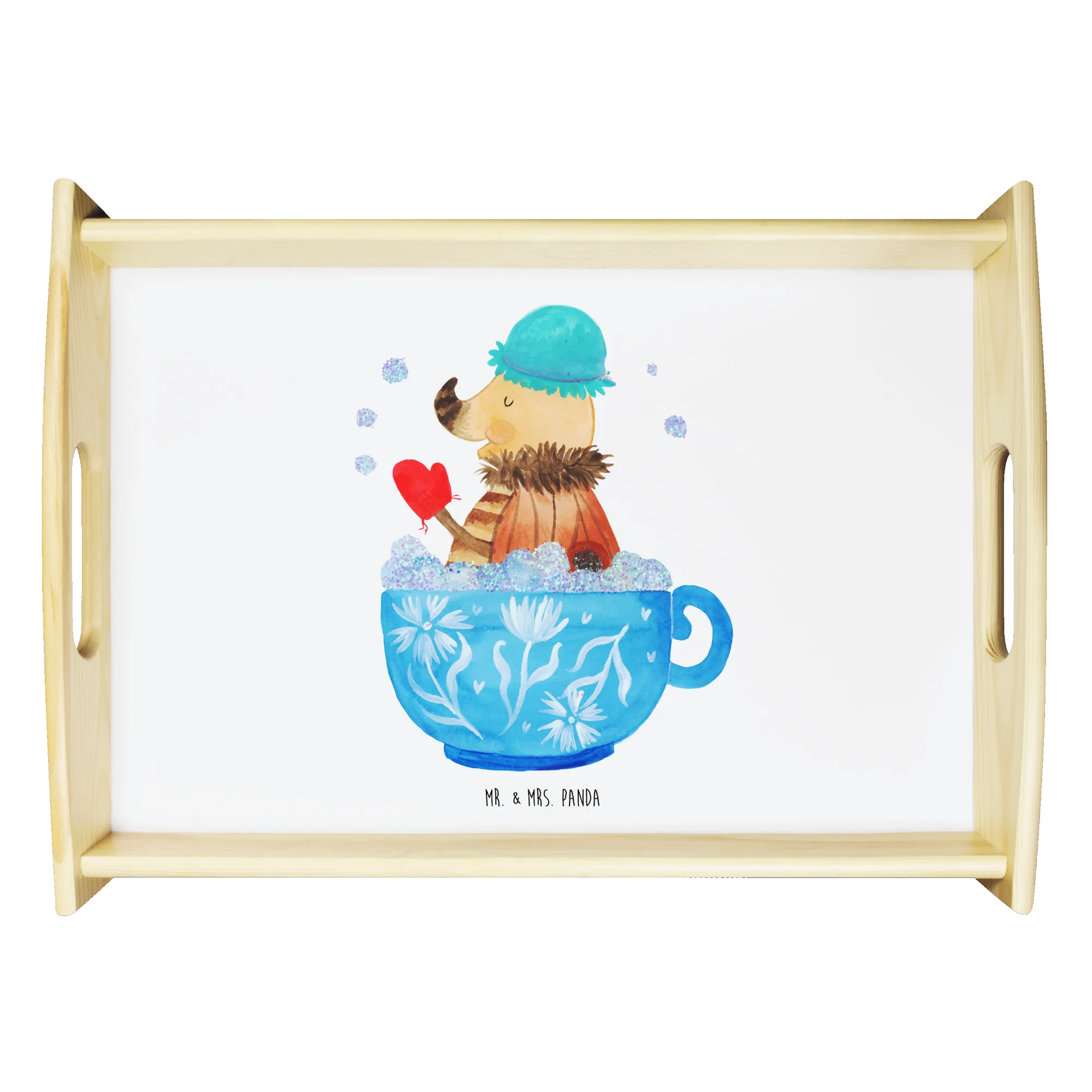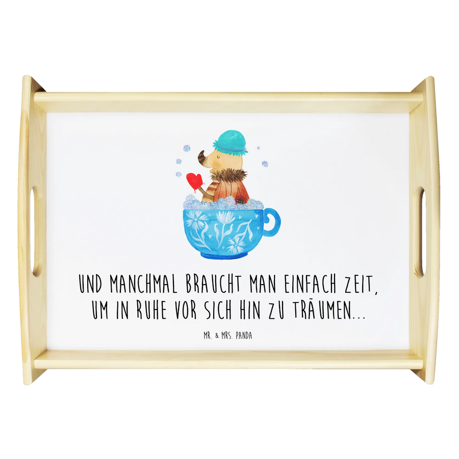Das einzigartige Serviertablett von Mr. & Mrs. Panda wird dein Frühstücksbuffet zum Erlebnis machen! Mit seinen großzügigen Maßen von 480 mm x 480 mm x 65 mm und einem Gewicht von 925 g ist es die perfekte Kombination aus Funktionalität und Stil. Aus hochwertigem, lasiertem Echtholz gefertigt, verzückt das Tablett mit einem strahlenden Druck, der für gute Laune sorgt. Ob im Bett oder auf dem Sofa, die seitlichen Griffmulden garantieren ein angenehmes Handling. Die spezielle Anti-Rutsch Beschichtung sorgt dafür, dass alles sicher an seinem Platz bleibt. Dank der kratzfesten Oberfläche ist das Tablett sehr pflegeleicht – einfach mit einem feuchten Tuch und etwas Spülmittel abwischen. Bitte nicht einweichen! Denke daran, dass die Anfertigung wegen der hohen Qualität etwas Zeit in Anspruch nimmt.