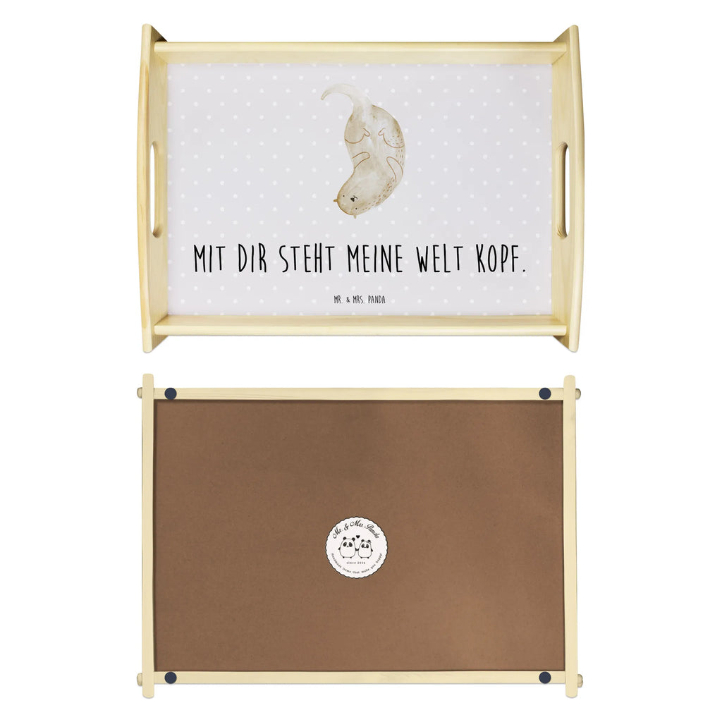 Qualität, die man sieht und fühlt: Der brillant strahlende Aufdruck zeigt das von Mrs. Panda handgezeichnete Aquarellmotiv in leuchtenden Farben. Die Oberfläche ist kratzfest und robust, sodass das Tablett im Alltag viel aushält. Der liebevolle Spruch „Mit Dir steht meine Welt Kopf.“ macht das Serviertablett Otter kopfüber zu einem besonders persönlichen Otter Geschenk.