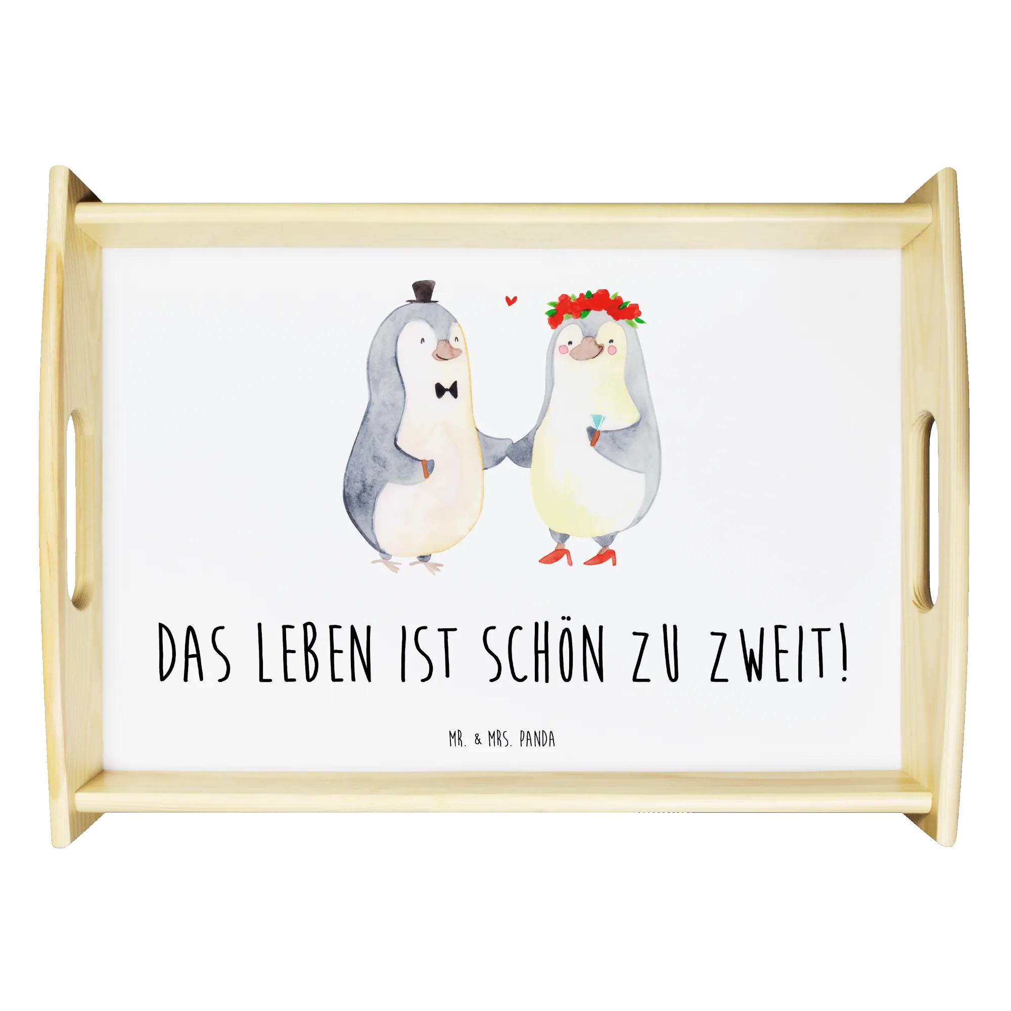 Das Serviertablett Pinguin Heirat aus der Liebe Kollektion von Mr. & Mrs. Panda ist das perfekte Geschenk für alle, die die Liebe feiern möchten. Mit seinem einzigartigen Design, das zwei stilisierte Pinguin-Figuren zeigt, die in feierlicher Kleidung aneinander gefügt sind, vermittelt es ein Gefühl von Zweisamkeit und Verbundenheit. Der Bräutigam mit Hut und Fliege und die Braut mit Blumenkranz strahlen festliche Eleganz aus. Mit dem Slogan 'Das Leben ist schön zu zweit!' ist dieses Tablett nicht nur ein praktisches Utensil, sondern auch eine süße Erinnerung an die Liebe, die wir miteinander teilen.