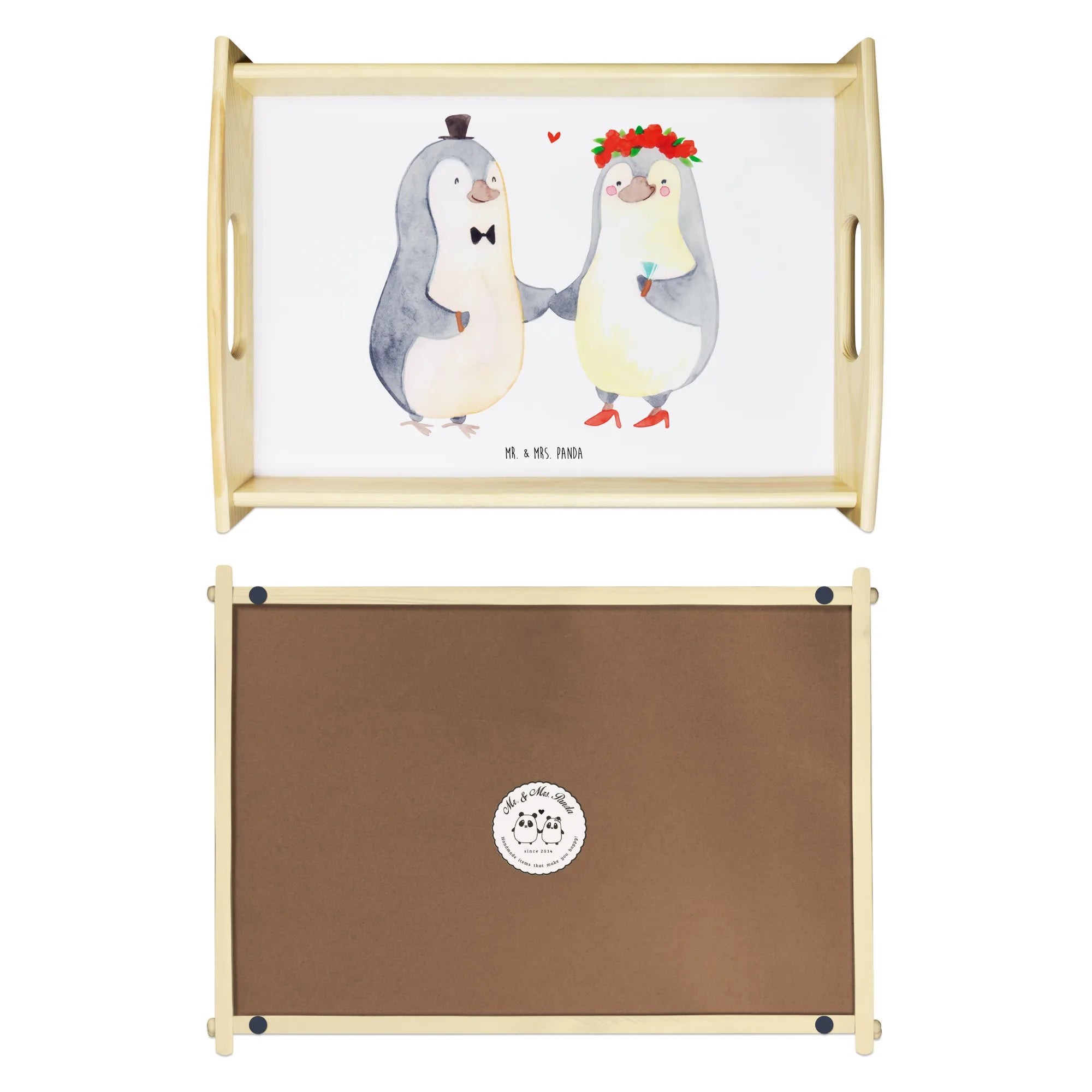 Verwöhne Deine Liebsten mit unserem bezaubernden Serviertablett von Mr. & Mrs. Panda! Mit den Maßen von 480 mm x 480 mm x 65 mm und einem gewicht von 925 g ist es nicht nur hübsch, sondern auch praktisch. Aus lasiertem Echtholz gefertigt, begeistert es mit einem lebendigen Druck, der gute Stimmung verbreitet. Egal ob beim Frühstück im Bett oder beim gemütlichen Abendessen auf dem Sofa – die seitlichen Griffmulden ermöglichen ein einfaches Tragen. Die Anti-Rutsch Pads auf der Unterseite sorgen dafür, dass alles sicher an seinem Platz bleibt. Dank der kratzfesten Oberfläche bleibt dein Tablett nach jeder Benutzung in bestem Zustand – einfach mit einem feuchten Tuch und Spülmittel abwischen, aber nicht einweichen! Beachte bitte die längere Anfertigungszeit aufgrund der besonderen Verarbeitung.