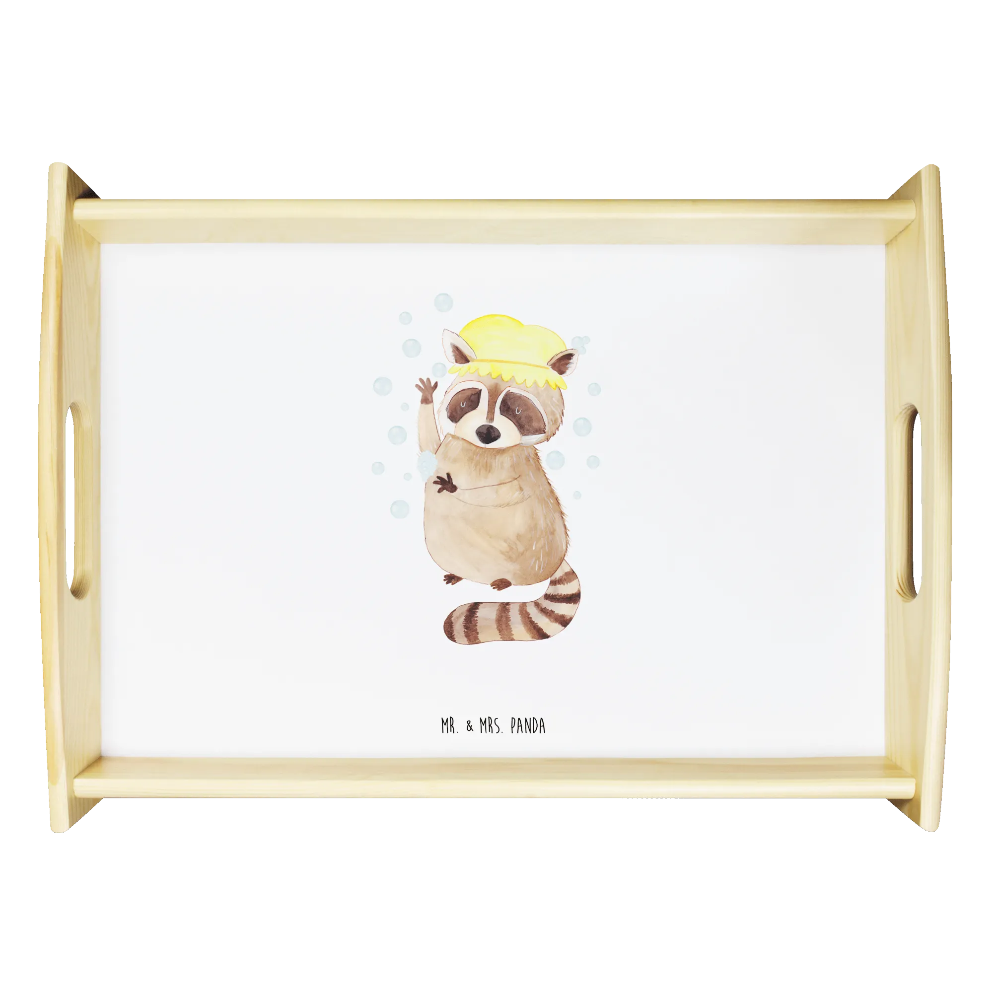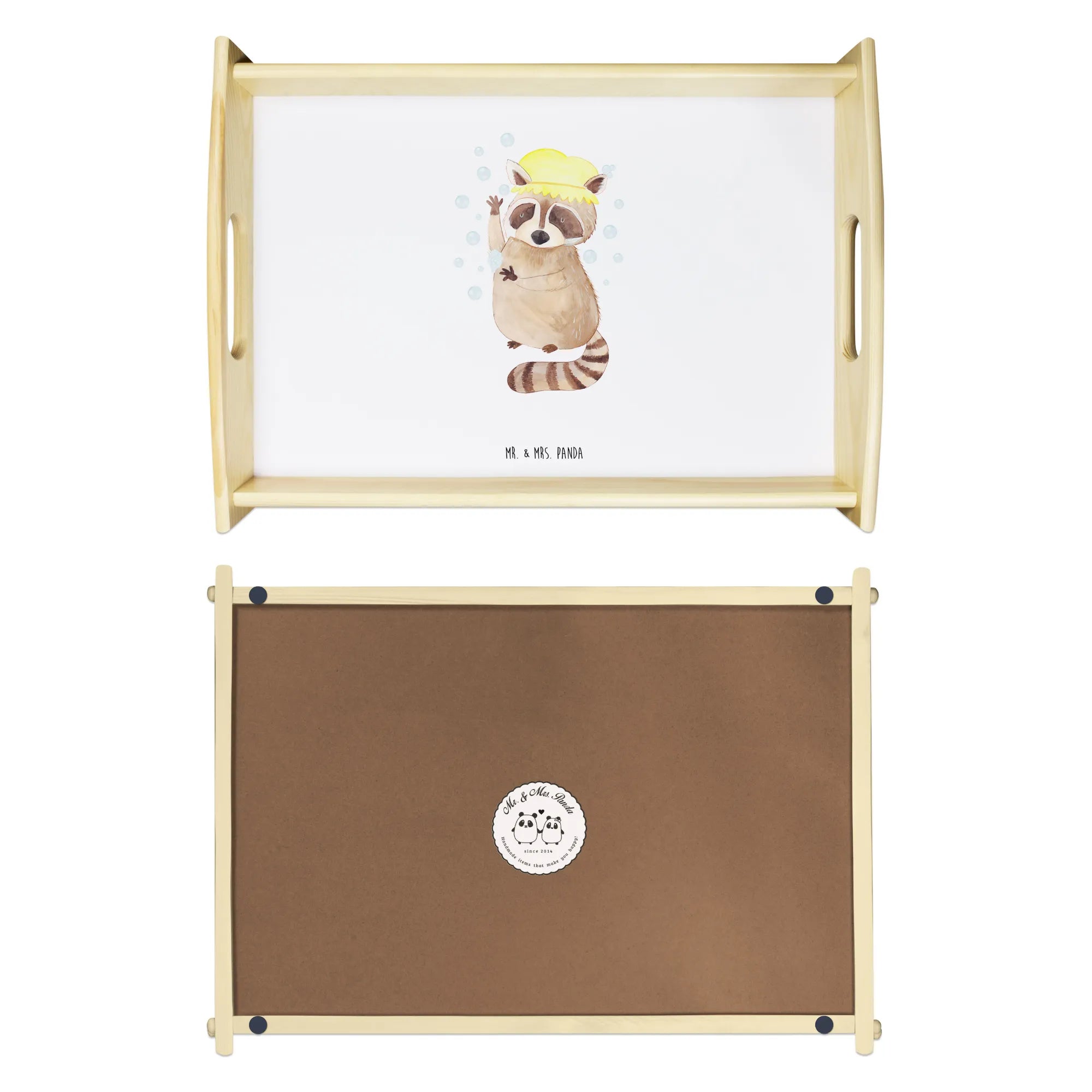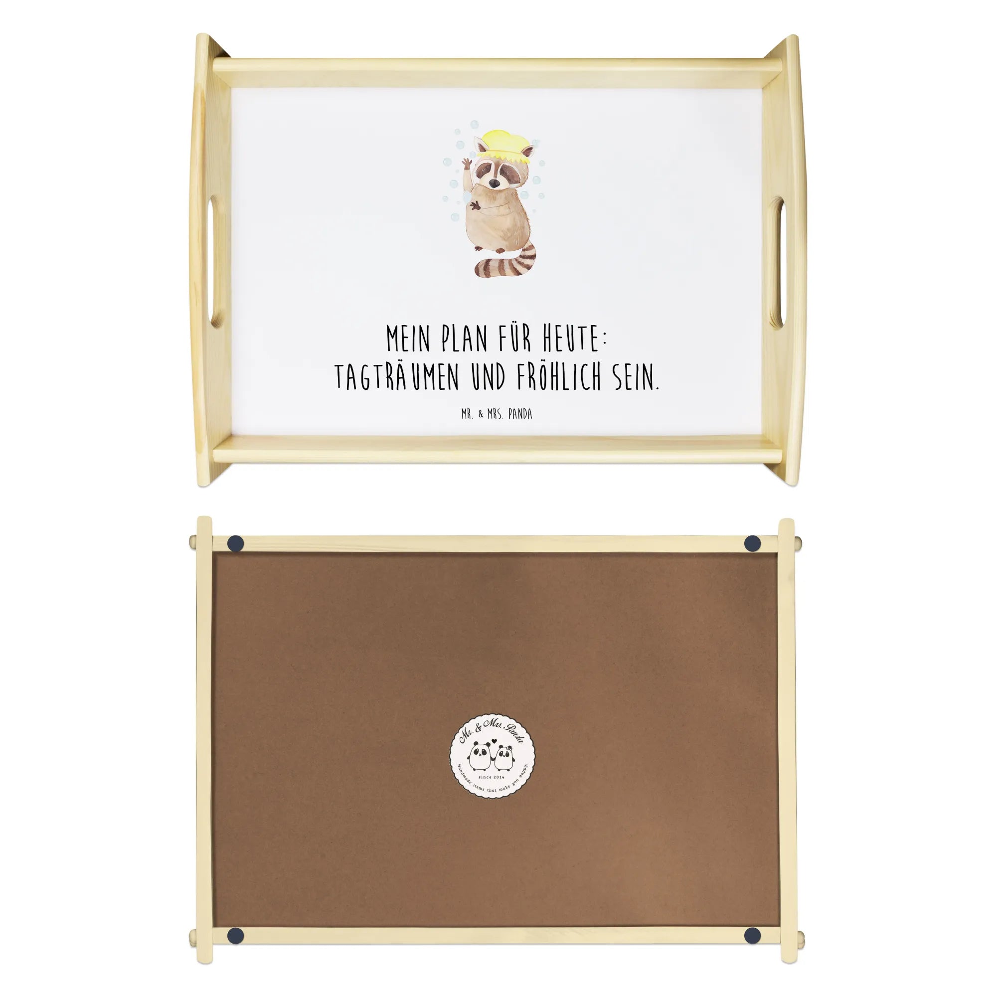 Entdecke das zauberhafte Serviertablett mit dem süßen Waschbär-Motiv aus der Small World Kollektion von Mr. & Mrs. Panda! Dieses wunderschöne und einzigartige Serviertablett ist nicht nur ein Blickfang, sondern auch extrem praktisch. Stelle dir vor, du genießt dein Frühstück im Bett oder auf dem Sofa, umgeben von einem fröhlichen Design, das sofort gute Laune verbreitet.