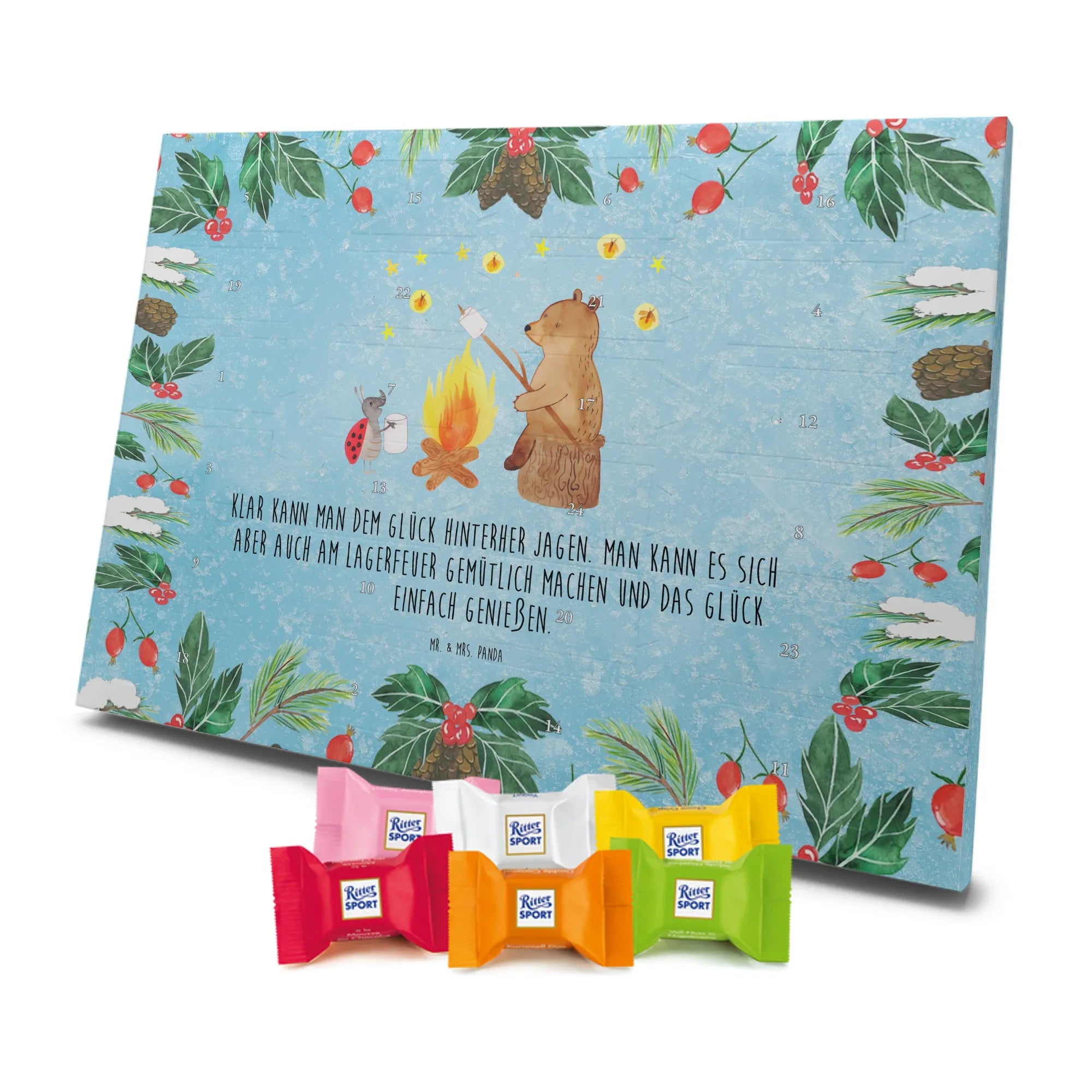 Unser entzückender Schokoladen Adventskalender von Mr. & Mrs. Panda ist das perfekte Highlight für die Adventszeit. Bedruckt mit wunderschönen Motiven & Sprüchen von Mr. & Mrs. Panda zaubert er dir ein Lächeln an jedem Tag im Dezember. Der Kalender ist nicht personalisierbar, überzeugt aber durch brillante Druckqualität mit seidenmatter Oberflächenveredelung und sorgsame bedruckte Seitenflächen. Die stabile Verarbeitung macht ihn zu einem dekorativen Hingucker. Maße: 325 mm x 225 mm x 27 mm. Besonders praktisch: Er kann aufgehängt oder aufgestellt werden, ganz nach deinem Geschmack und Platzangebot. Gefüllt ist der Adventskalender mit Ritter Sport Schokowürfeln – in verführerischen Sorten wie Mousse au Chocolat, Schoko Crisp, Voll-Nuss in Nougatcreme, Karamell Duo, Joghurt und Erdbeer-Joghurt. Wichtiger Hinweis: Es handelt sich um einen Kalender gefüllt mit Ritter Sport Schokolade, nicht um einen Kalender der Marke Ritter Sport. Schenk ihn Freunden, der Familie oder gönn dir selbst eine süße Vorfreude: kleine Schokoladenmomente, liebevoll verpackt von Mr. & Mrs. Panda.