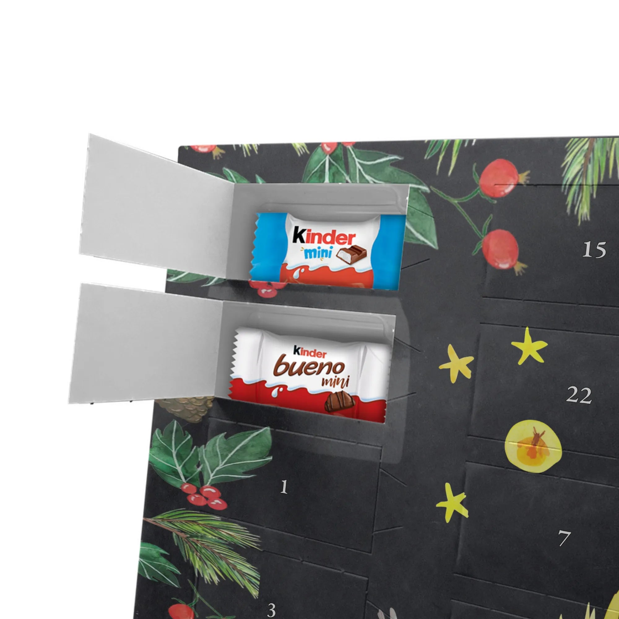 Adventskalender mit Schokolade – liebevoll gestaltet von Mr. & Mrs. Panda. Dieser niedliche Kalender ist bedruckt mit wunderschönen Motiven & Sprüchen von Mr. & Mrs. Panda und trotzdem nicht personalisierbar. Du bekommst brillante Druckqualität mit seidenmatter Oberflächenveredelung sowie bedruckte Seitenflächen, die dem Kalender ein hochwertiges Finish verleihen. Maße: 355 mm x 245 mm x 11 mm. Ein tolles Extra: kann aufgehängt oder aufgestellt werden, sodass du ihn flexibel platzieren kannst. Gefüllt mit Markenname Schokolade: Adventskalender gefüllt mit kinder® Schokolade. Inhalt: kinder® Schoko-Bons, kinder® Bueno mini und kinder® Schokolade mini. Die 24 Türchen sind liebevoll befüllt und sorgen jeden Tag für ein Lächeln – ideal für Kinder, Paare oder als kleines Geschenk für Freunde. Robust und dekorativ zugleich, bringt dieser Adventskalender süße Vorfreude in dein Zuhause. Verschenke oder genieße eine adventliche Zeit voller kleiner, schokoladiger Überraschungen!