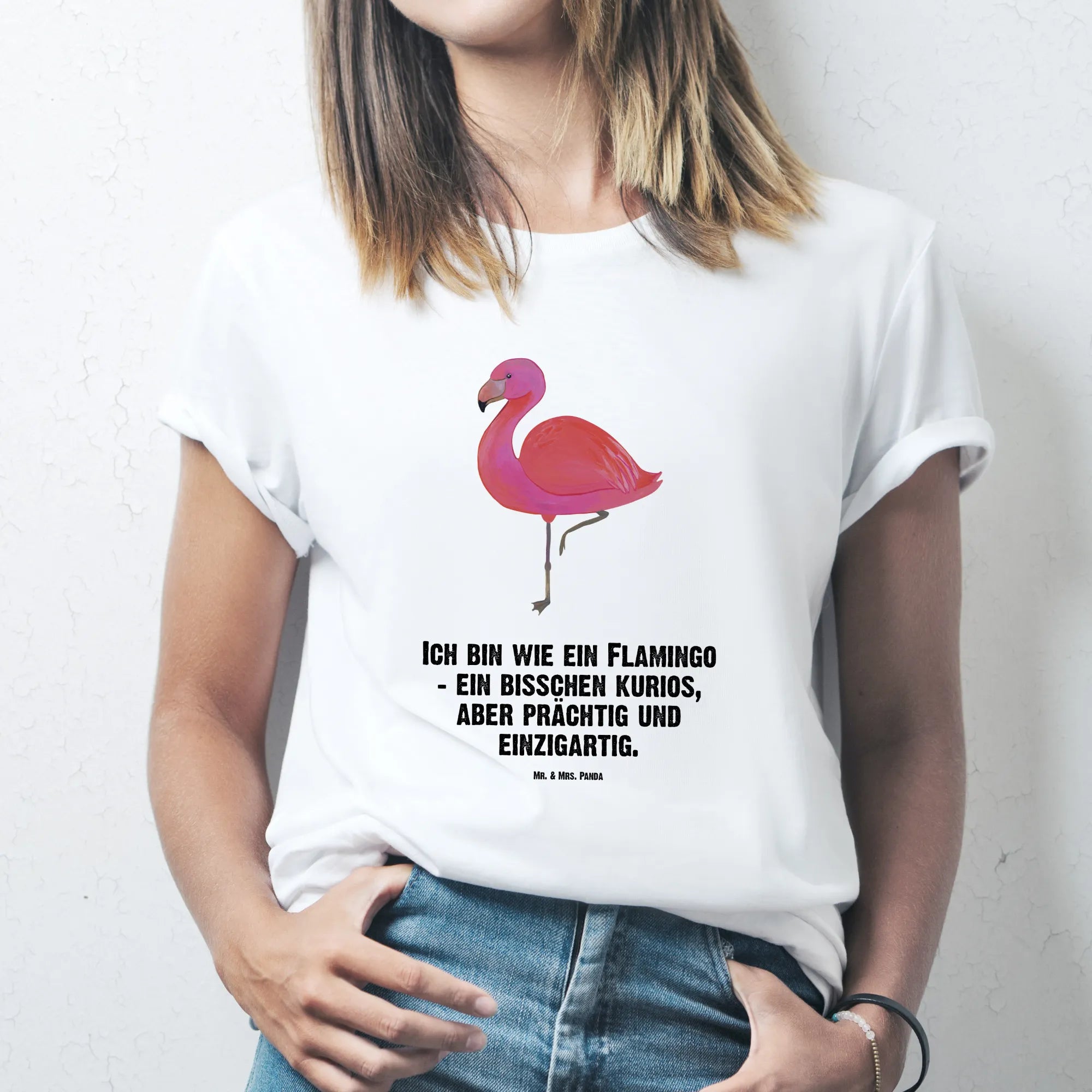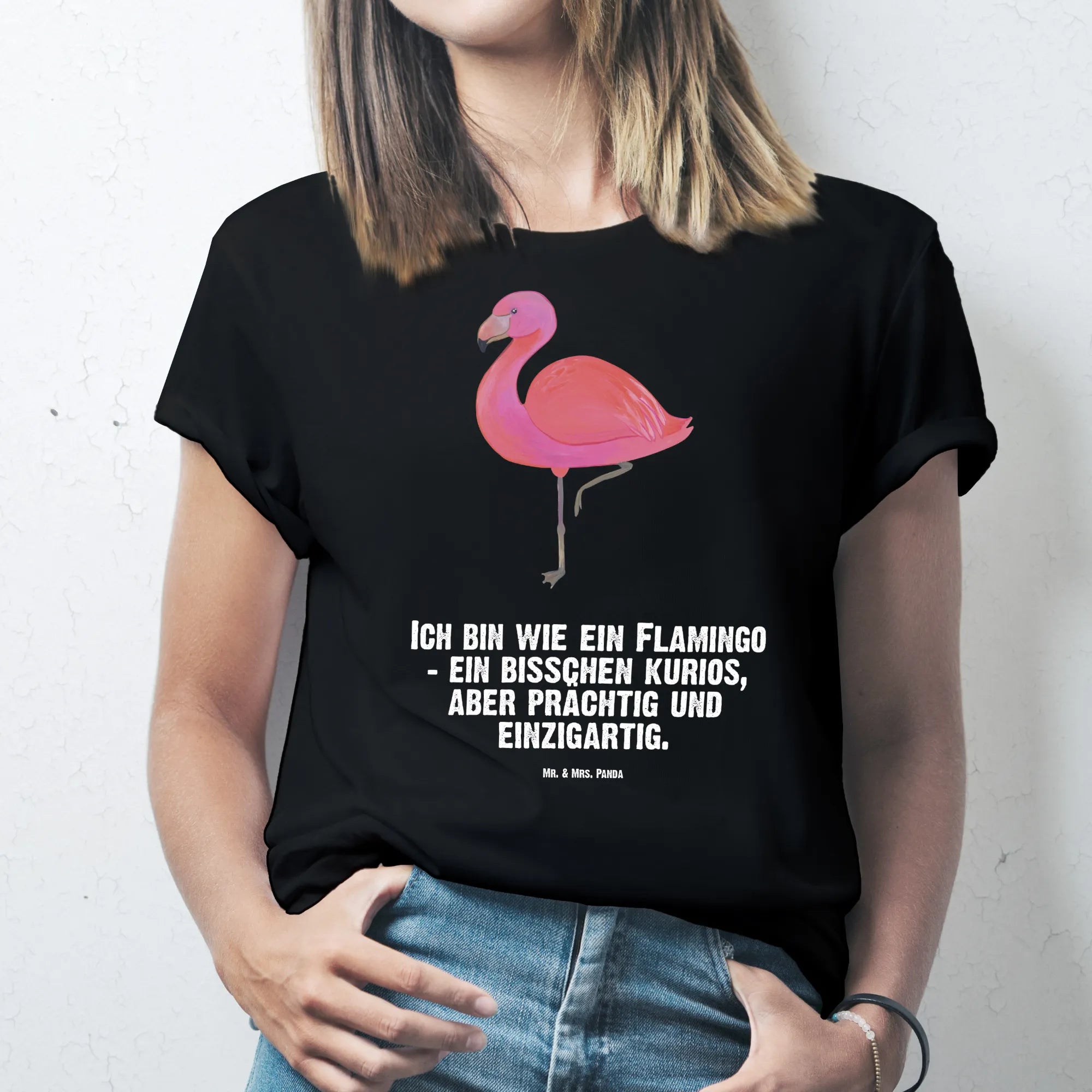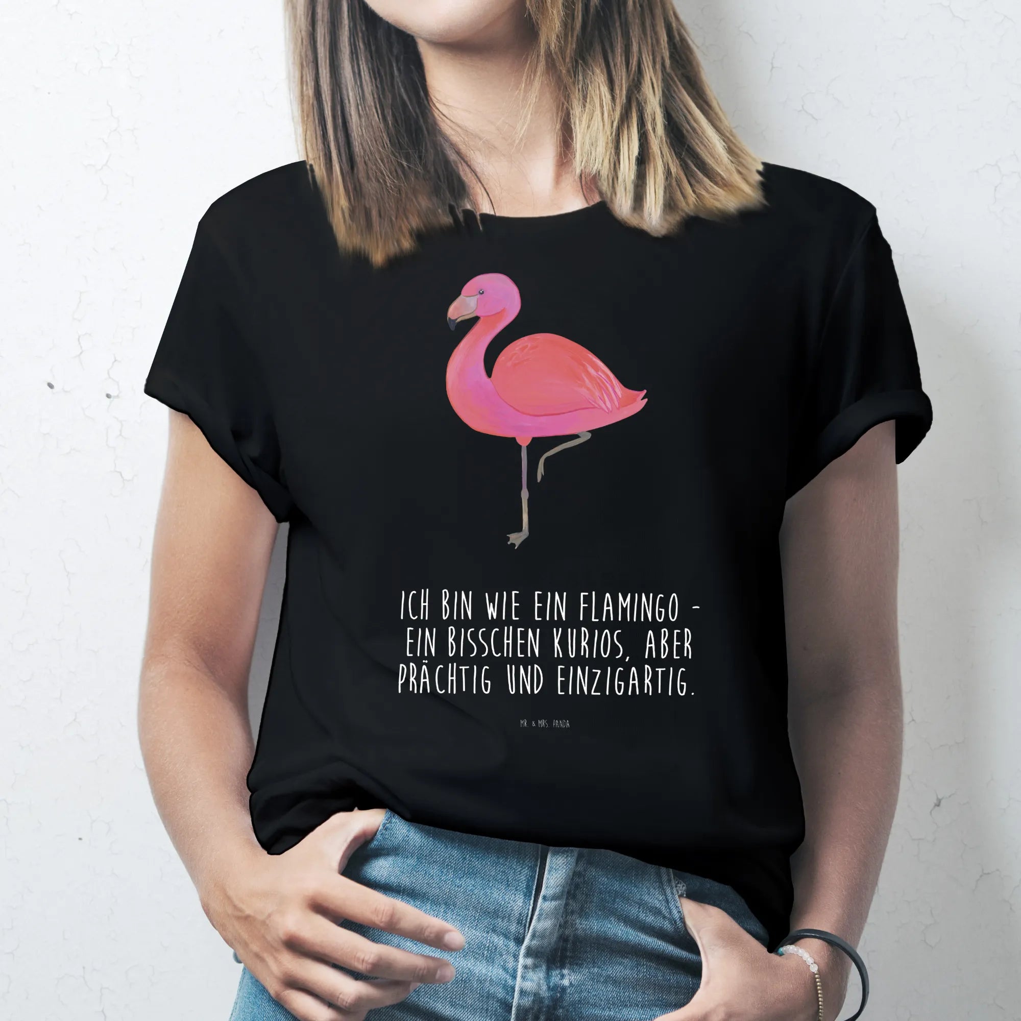 "Ich bin wie ein Flamingo - ein bisschen kurios, aber prächtig und einzigartig." Dieser Spruch ist nicht nur witzig, sondern feiert auch das Anderssein und die Selbstliebe. Unser Flamingo ist ein echtes Kunstwerk, handgezeichnet von Mrs. Panda. Die sanften Farben und die liebevolle Ausarbeitung machen es zu einem besonderen Teil jeder Garderobe.