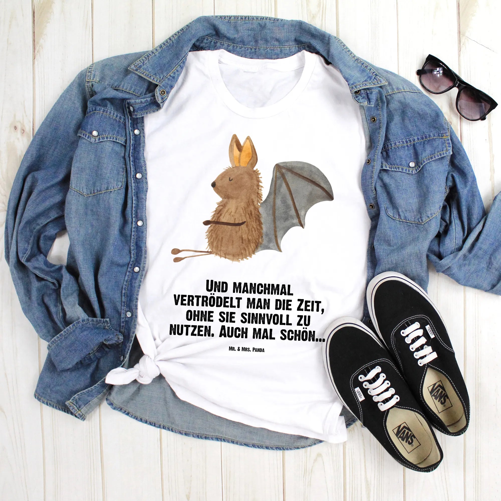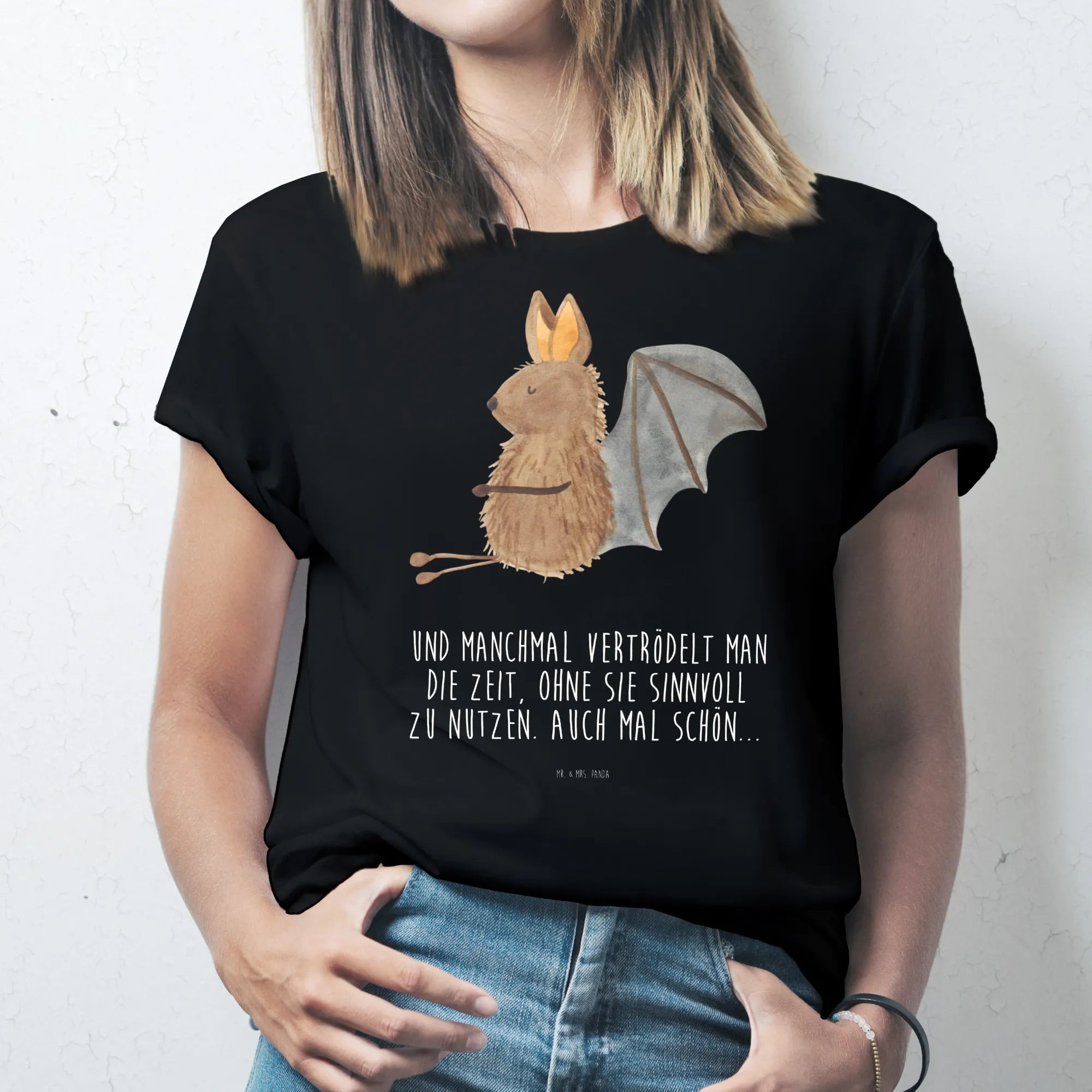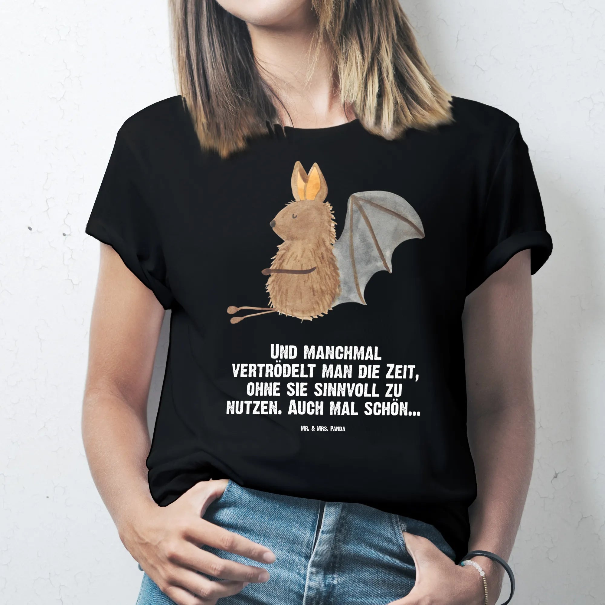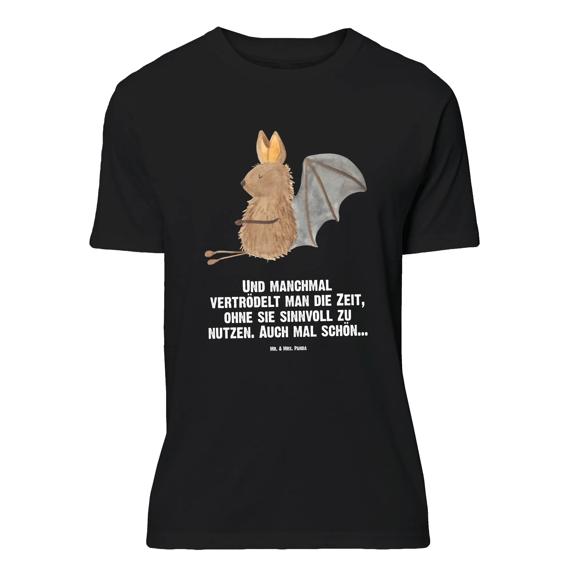 Dieses liebevoll gestaltete T-Shirt von Mr. & Mrs. Panda bringt Freude in jeden Kleiderschrank. Auf schwarzem Hintergrund sitzt eine süße Fledermaus und lächelt dich an – ein Motiv, das sofort gute Laune macht. Der eingearbeitete Spruch „Und manchmal vertrödelt man die Zeit, ohne sie sinnvoll zu nutzen. Auch mal schön...“ verleiht dem Shirt eine entspannte und charmante Botschaft.