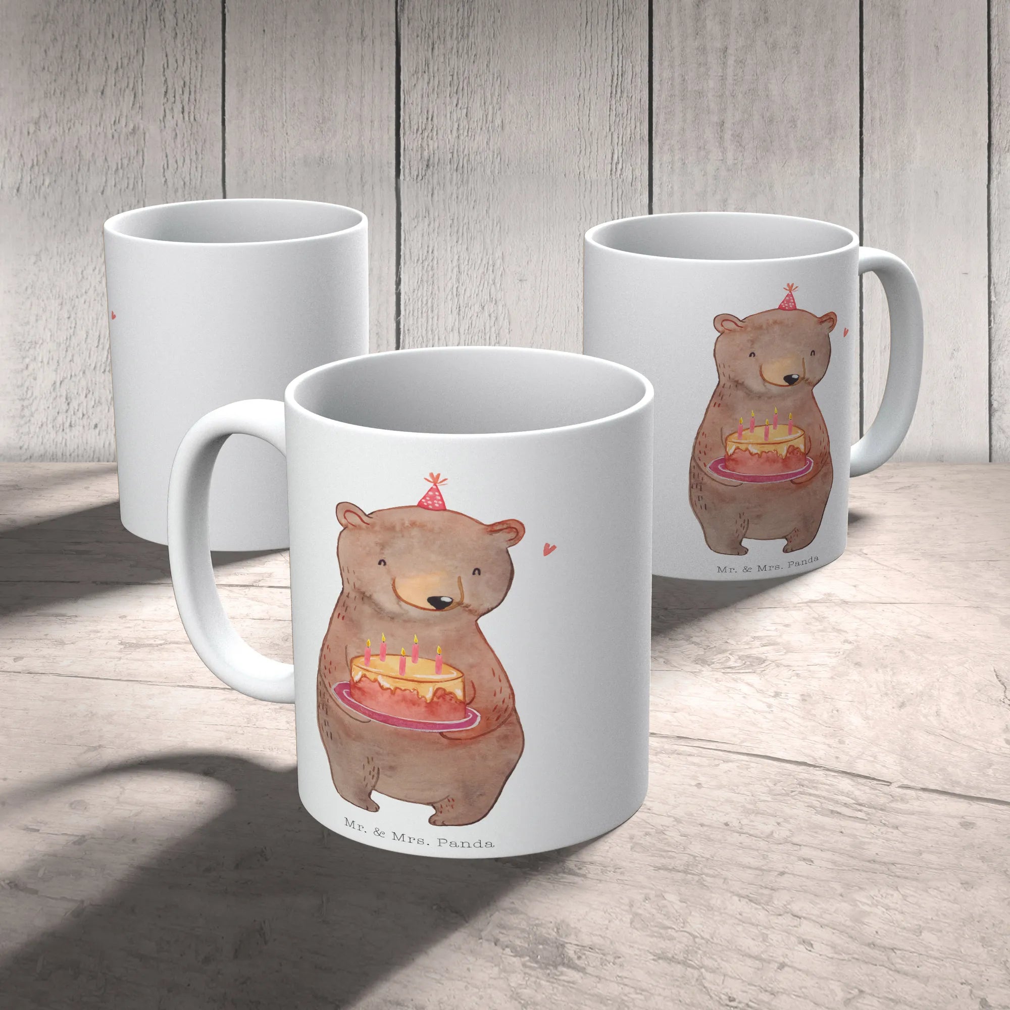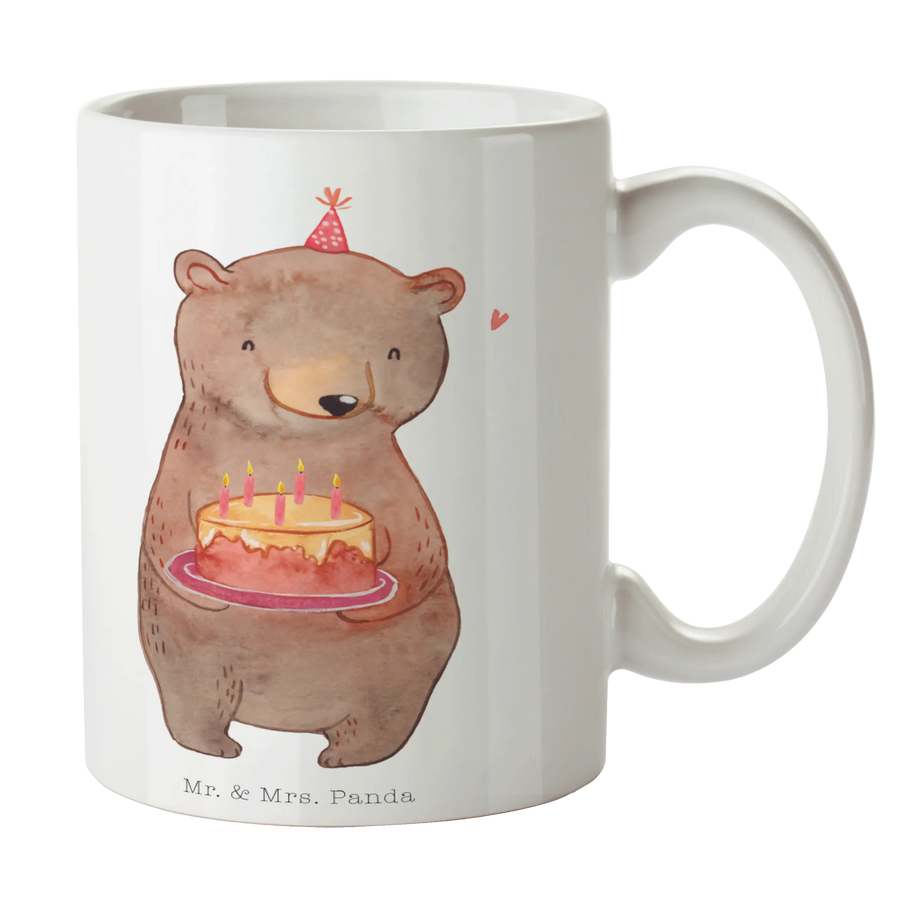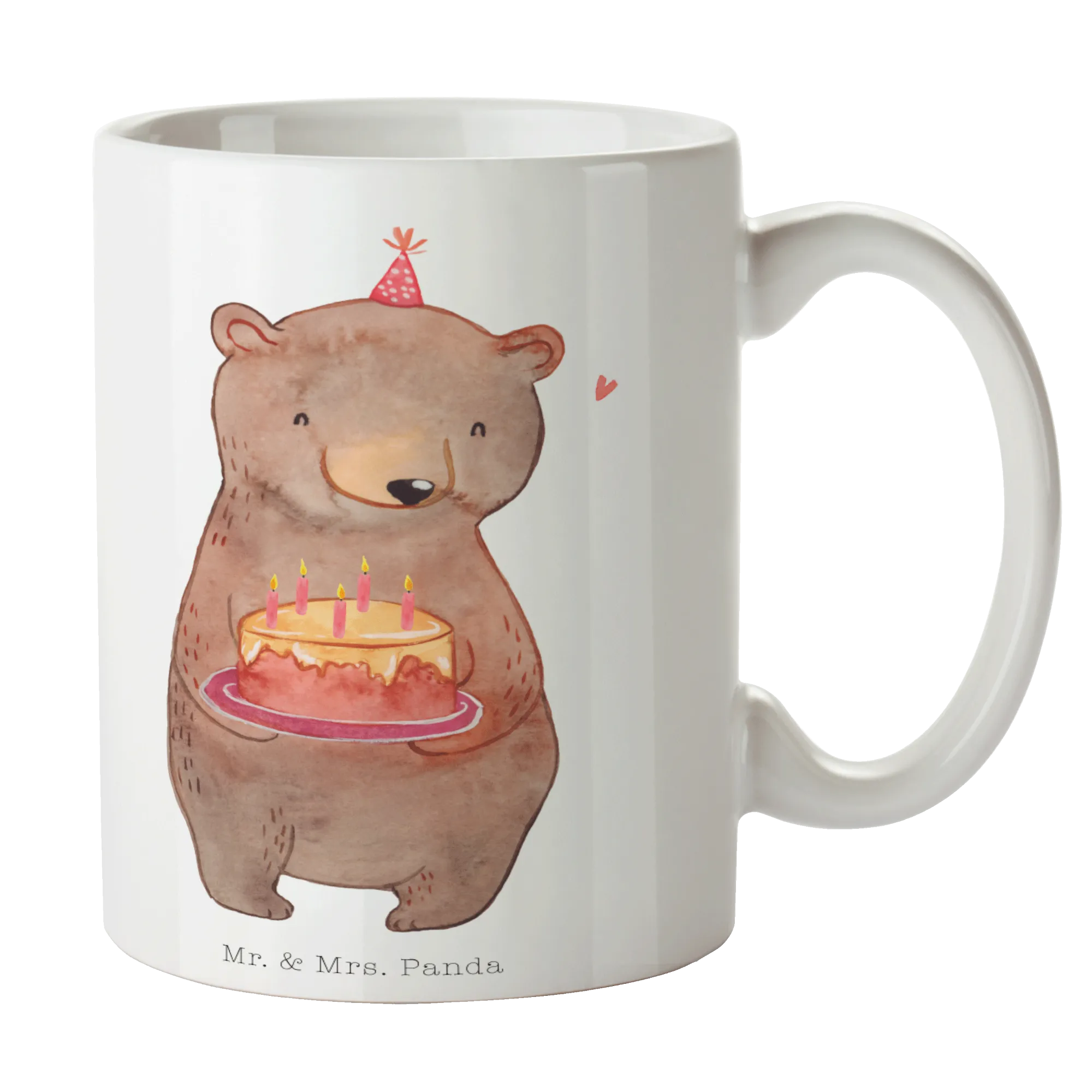 Der niedliche Bär mit dem Partyhütchen und der süßen Torte in der Hand wird jeden Kaffeegenuss zu einem besonderen Erlebnis machen. Die Tasse hat die perfekte Größe von 325 ml, ideal für deinen Lieblingstee oder -kaffee. Hergestellt aus hochwertiger Keramik, ist sie nicht nur extrem langlebig, sondern auch mikrowellengeeignet und spülmaschinenfest. Das bedeutet, dass sie bis zu 2000 Waschgänge in der Spülmaschine aushält, ohne dabei ihre strahlende Oberfläche zu verlieren.