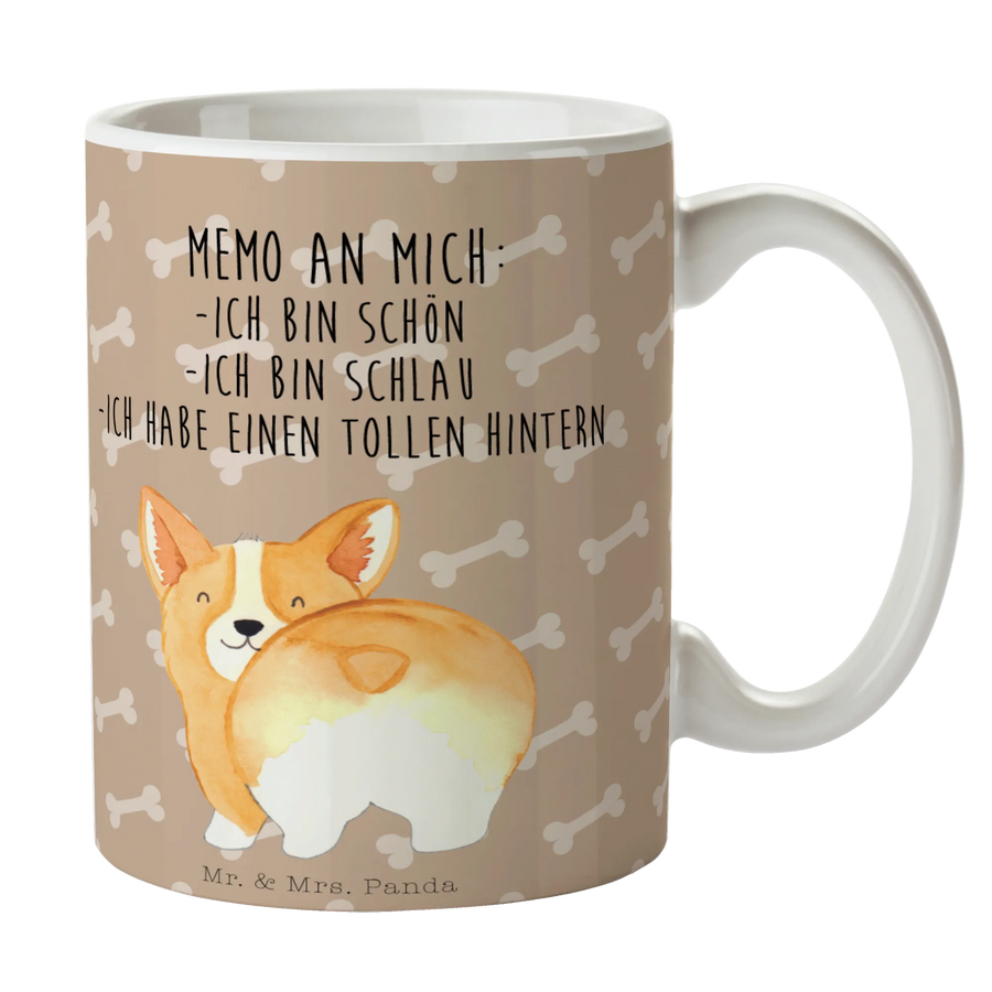 Du liebst Hunde und suchst nach dem perfekten Geschenk für Dich selbst oder einen Hundeliebhaber? Unsere bezaubernde Tasse "Corgie Po" aus der Hunde Kollektion von Mr. & Mrs. Panda ist genau das Richtige! Diese stilvolle Keramiktasse bringt nicht nur einen Hauch von Freude in deinen Alltag, sondern bietet auch einen liebevollen Blick auf deinen Lieblingshund. Der niedliche Corgi, der stolz seinen Po in die Kamera hält, sorgt für ein Lächeln bei jedem Schluck. Das liebevoll gestaltete Motiv wird kombiniert mit dem motivierenden Spruch: "Memo an mich: ich bin schön, ich bin schlau, ich habe einen tollen Hintern." Damit bist Du bestens gerüstet für einen spritzigen Start in den Tag!