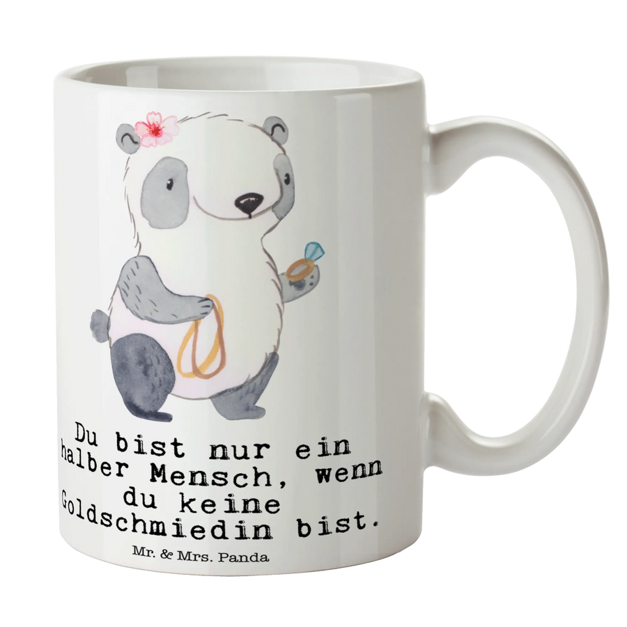 Mit dem liebevollen Motiv einer süßen Goldschmiedin, die mit Stolz ihren Schmuck präsentiert, entfaltet die Tasse eine ganz besondere Atmosphäre. Das liebevoll gestaltete Motiv wurde von Mrs. Panda handgezeichnet und zeigt eine kreative, lebendige Darstellung einer Goldschmiedin im Einsatz. Dazu gibt es den witzigen Spruch: "Du bist nur ein halber Mensch, wenn du keine Goldschmiedin bist." – ein perfekter Icebreaker für jeden Tag im Büro!