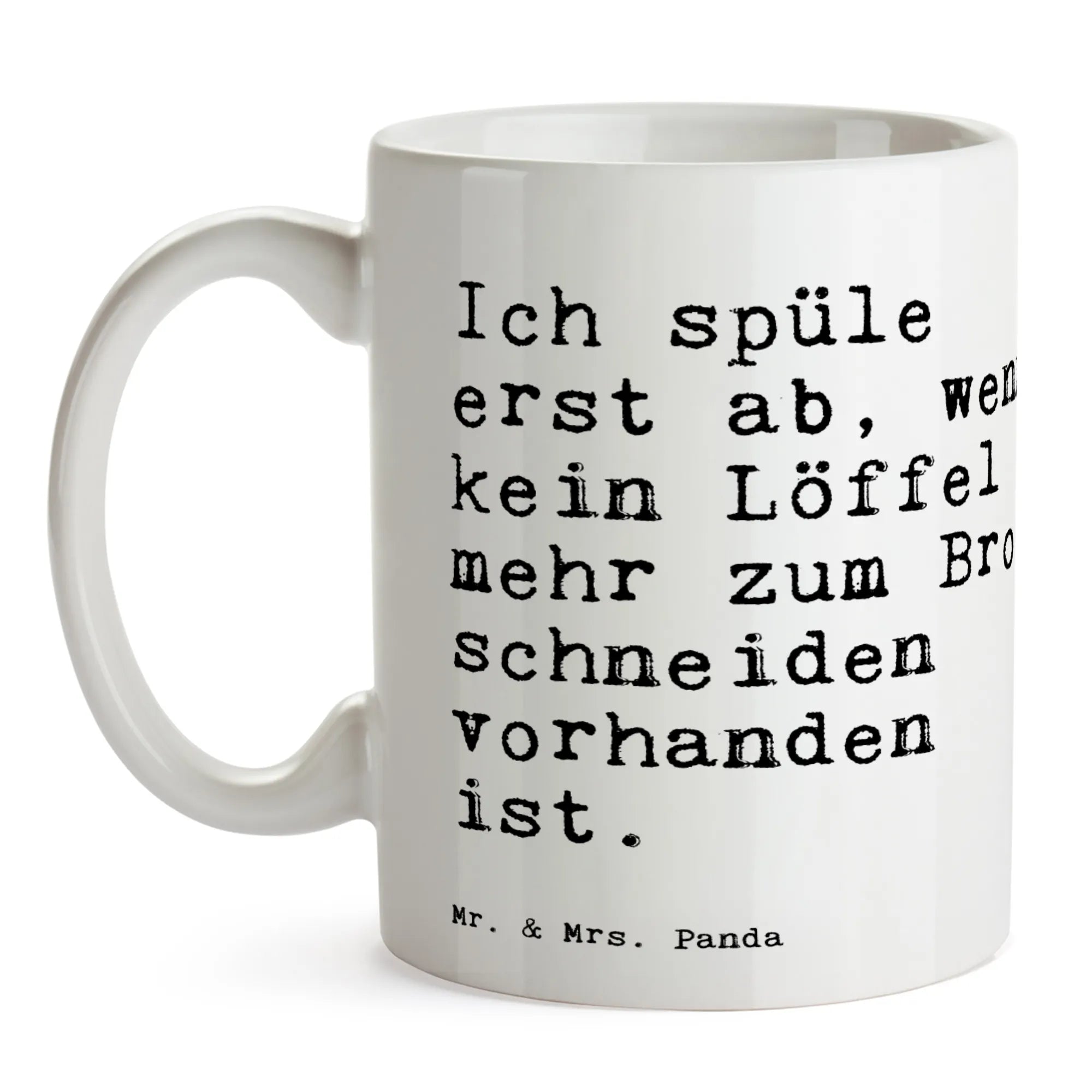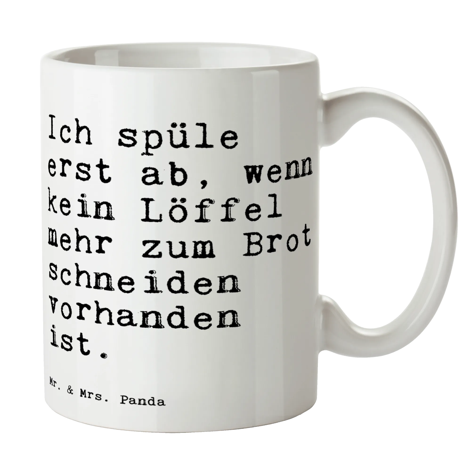 Entdecke die perfekte Kaffeetasse von Mr. & Mrs. Panda mit dem witzigen Spruch 'Ich spüle erst ab, wenn kein Löffel mehr zum Brot schneiden vorhanden ist.'
