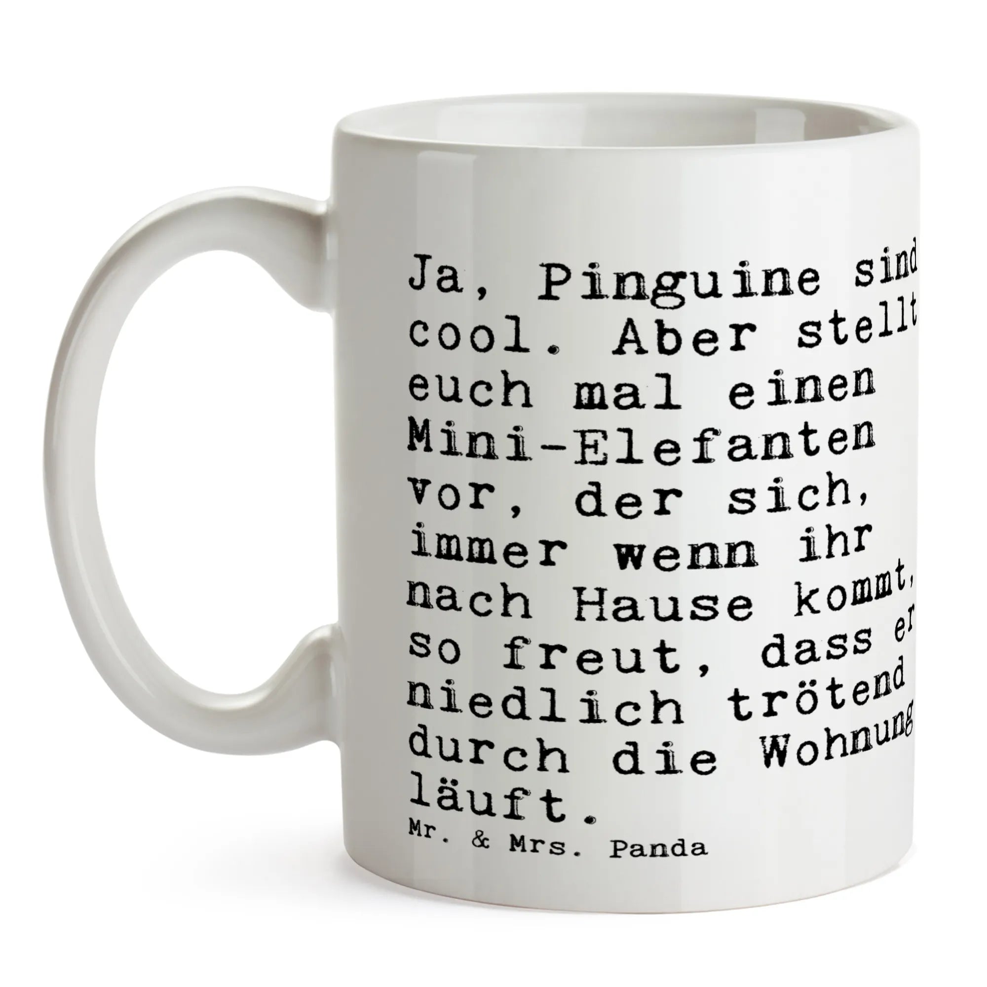 Die Tasse "Ja, Pinguine sind cool. Aber stellt euch mal einen Mini-Elefanten vor, der sich, immer wenn ihr nach Hause kommt, so freut, dass er niedlich trötend durch die Wohnung läuft." ist nicht nur eine einfache Kaffeetasse, sondern ein Ausdruck von Lebensfreude und Kreativität. Mit einem einzigartigen Design und einem charmanten Spruch aus der Kollektion von Mr. & Mrs. Panda, wird diese Keramiktasse schnell zum Blickfang in jedem Büro oder Zuhause.