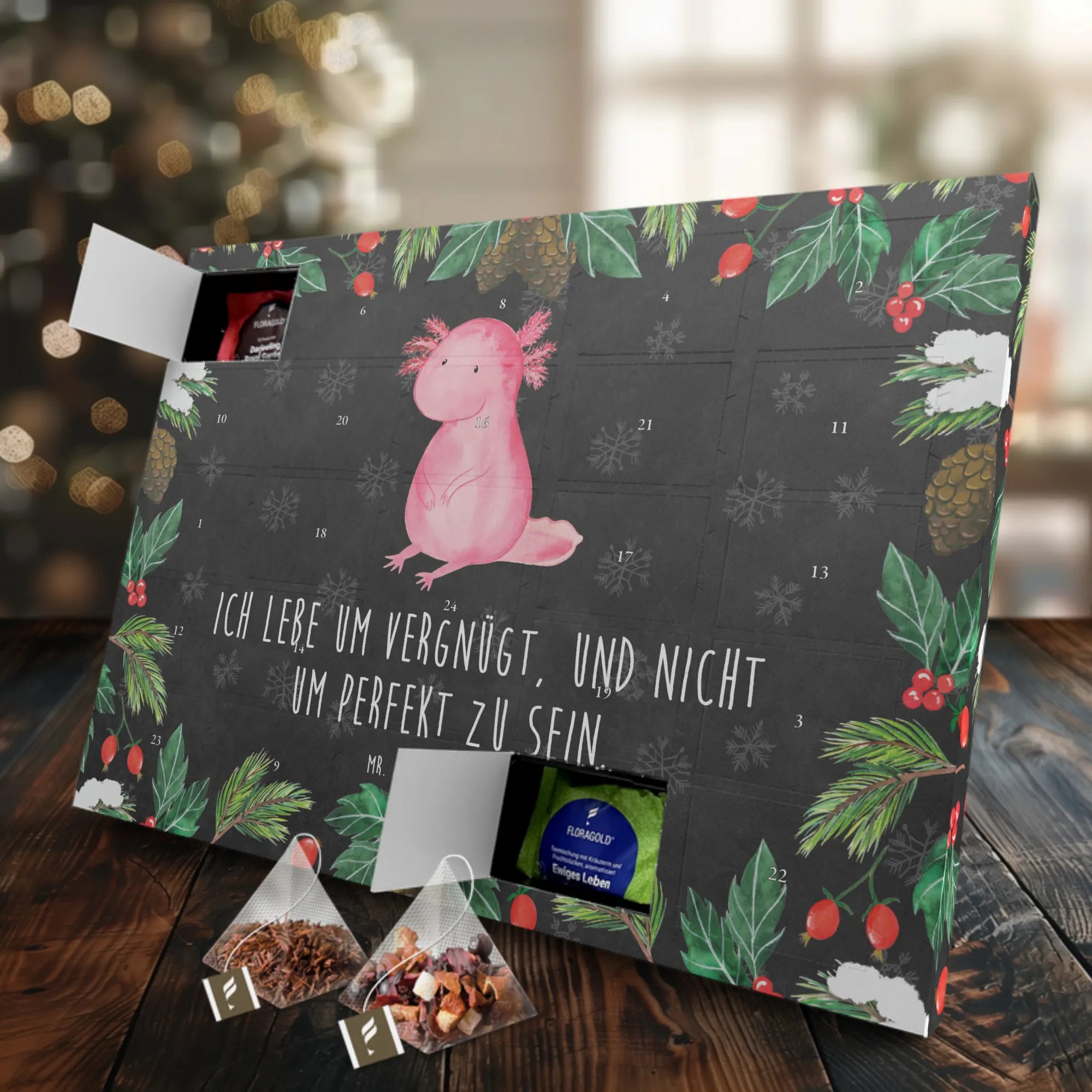 Jeder der 24 Pyramidenbeutel enthält eine exquisite Teesorte, die vom fruchtigen Früchtetee bis hin zu aromatischem Schwarztee reicht. Dank der exquisiten Grafik des knuddeligen Axolotls in Kombination mit dem Slogan „Ich lebe um vergnügt, und nicht um perfekt zu sein“ verbreitet der Kalender nicht nur Freude beim Öffnen, sondern auch bei jedem Schluck des köstlichen Tees.