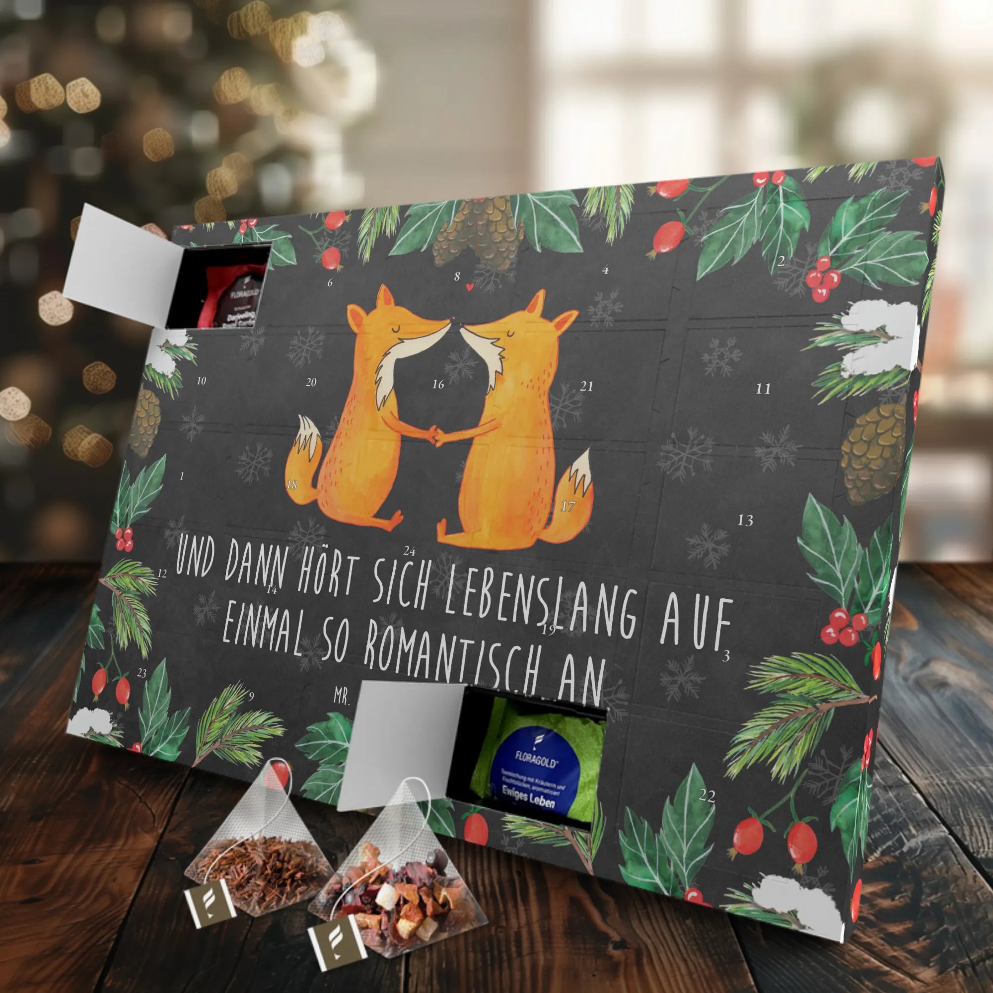 Der wunderbare Tee Adventskalender "Füchse Liebe" von Mr. & Mrs. Panda ist das perfekte Geschenk für alle Teeliebhaber und romantischen Seelen. Wenn du dich nach einem liebevollen Advents-Begleiter sehnst, dann ist dieser Kalender genau das Richtige für dich. Mit einem bezaubernden Motiv, das zwei niedliche Füchse zeigt, die Hand in Hand sitzen, bringt dieser Adventskalender eine warme und zauberhafte Stimmung in dein Zuhause. Der Slogan "Und dann hört sich lebenslang auf einmal so romantisch an" unterstreicht die Zuneigung und das Glück, das in der Luft liegt.