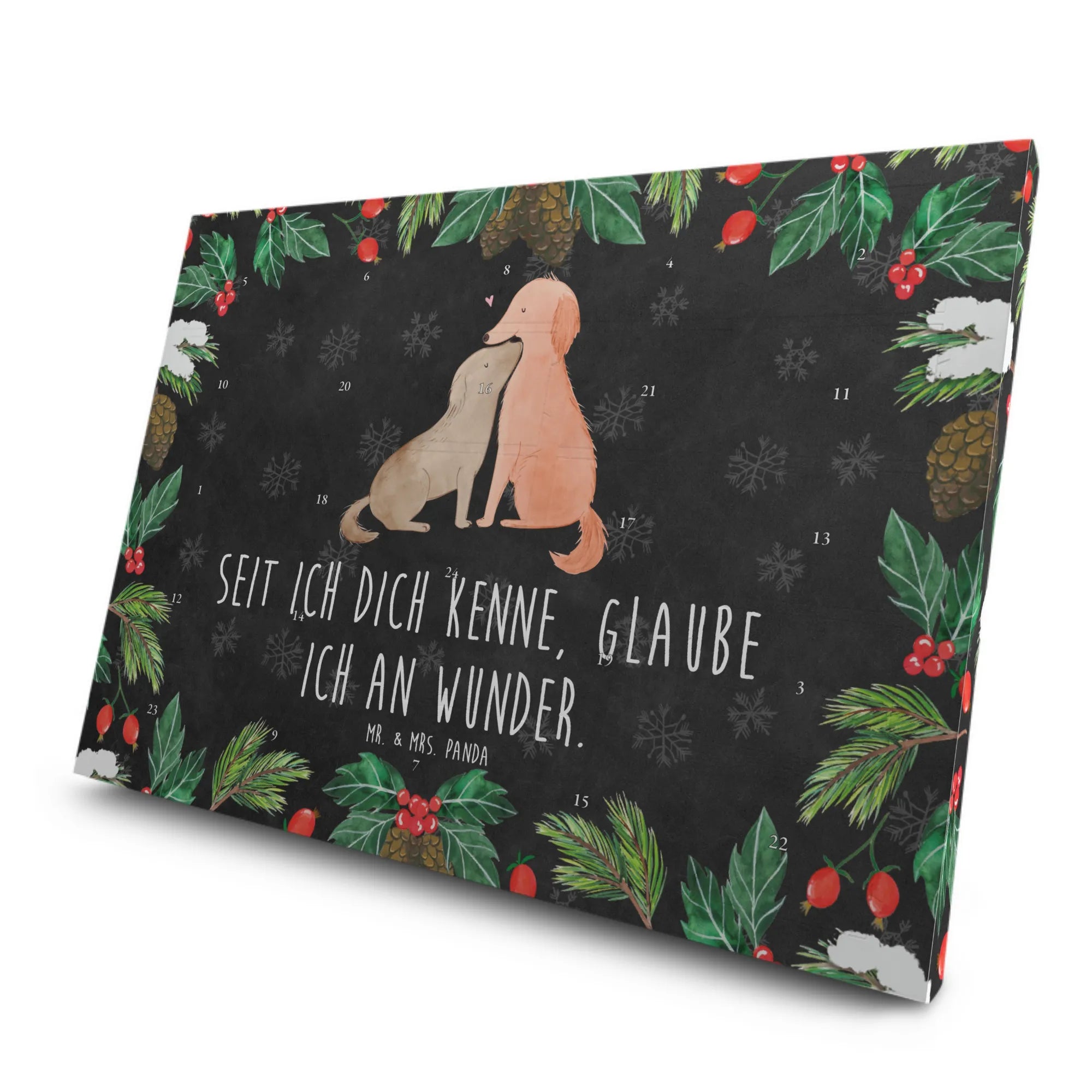 Das Motiv "Hunde Liebe" wird von dem herzerwärmenden Slogan "Seit ich dich kenne, glaube ich an Wunder." begleitet, der die besondere Verbindung zwischen Mensch und Hund perfekt beschreibt. Diese sentimentalen Worte sowie die liebevoll handgezeichneten Motive von Mrs. Panda machen diesen Adventskalender zu einem ganz besonderen Geschenk.