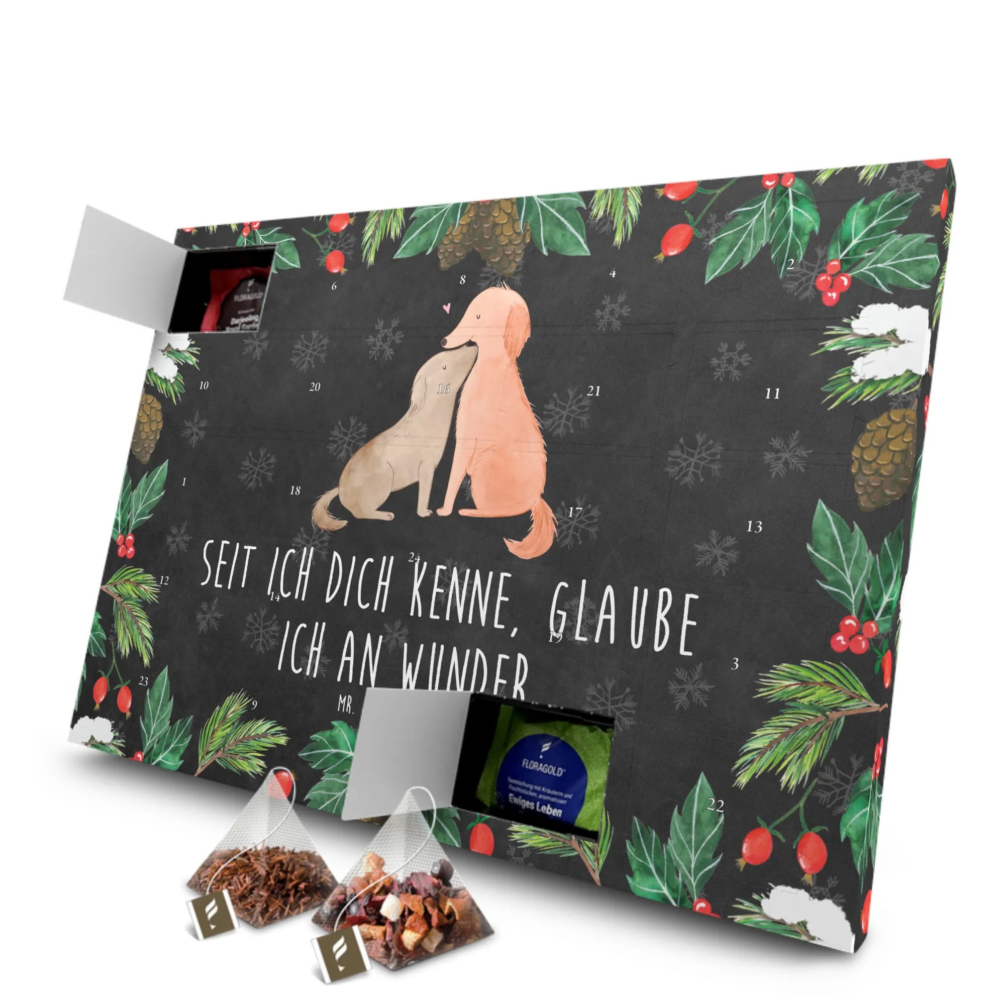 Der Tee Adventskalender "Hunde Liebe" von Mr. & Mrs. Panda ist das perfekte Geschenk für alle Hundeliebhaber und Hundebesitzer. Jeder, der die bedingungslose Liebe und das Vertrauen seines Hundes schätzt, wird diesen Adventskalender mit Freude öffnen. Mit den niedlichen Motiven von zwei kuschelnden Hunden bringt er die Herzchen zum Schmelzen und sorgt für eine entspannte Vorweihnachtszeit. Zudem trägt er den zauberhaften Spruch: "Seit ich dich kenne, glaube ich an Wunder!" - eine Botschaft, die die besondere Verbindung zwischen Mensch und Tier feiert.