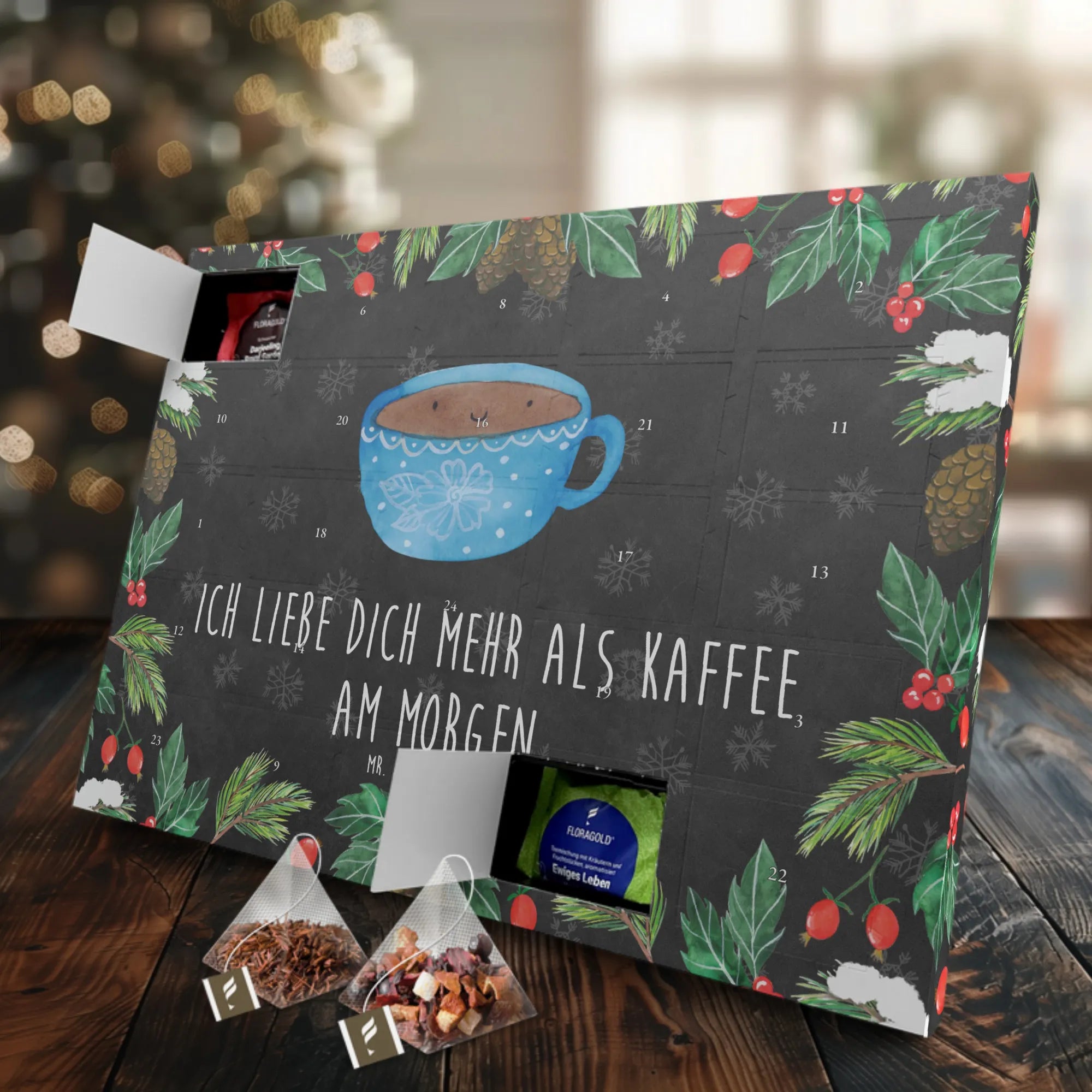 Entdecke den wunderbaren Tee Adventskalender mit dem Motiv Kaffee Tasse aus der kleinen Welt von Mr. & Mrs. Panda! Dieser bezaubernde Adventskalender ist nicht nur ein fröhlicher Begleiter durch die besinnliche Vorweihnachtszeit, sondern auch ein ideales Geschenk für alle Teeliebhaber und Kaffee-Fans.
