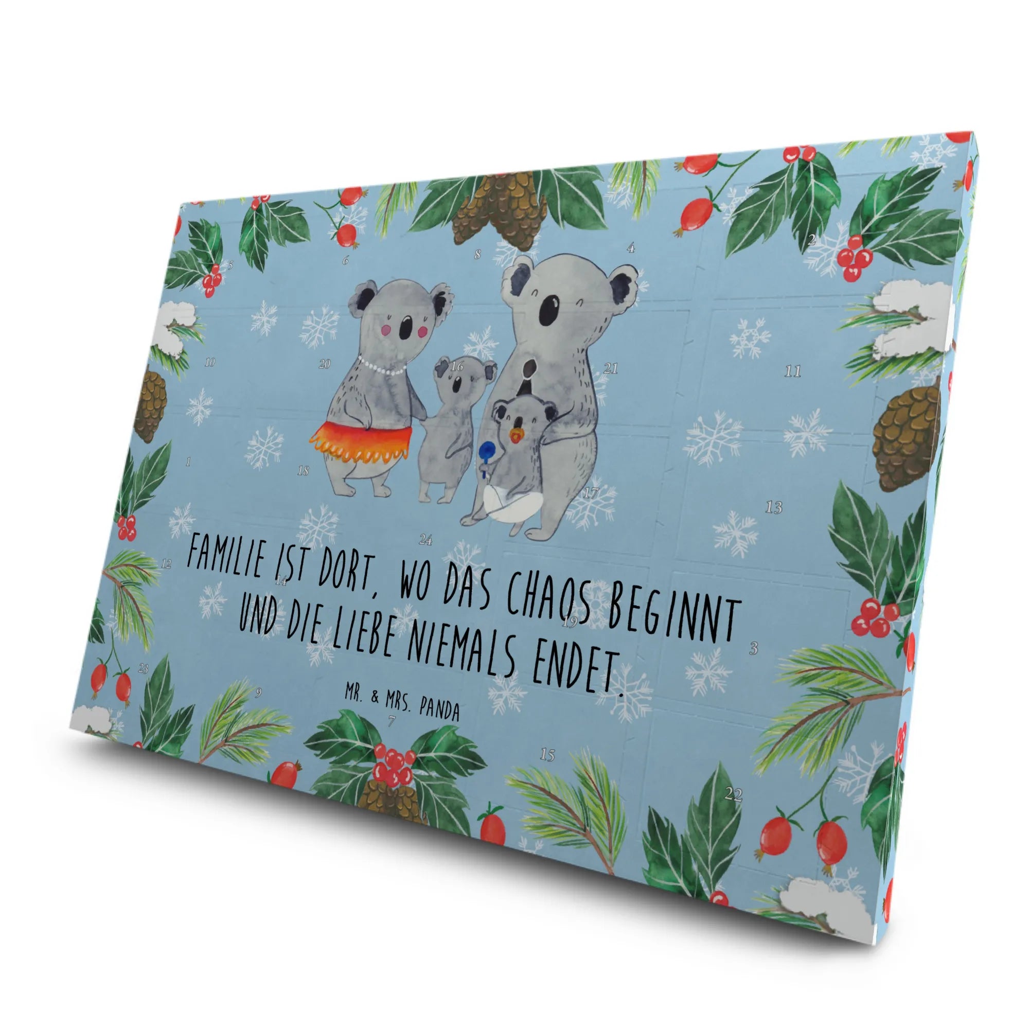 Der wunderschöne Tee Adventskalender von Mr. & Mrs. Panda ist das perfekte Geschenk für alle Familienmitglieder und Tee-Liebhaber. Mit dem niedlichen Motiv der Koala Familie, die aus zwei größeren und zwei kleineren Koalas besteht, versprüht dieser Adventskalender viel Freude und Wärme. Der Slogan "Familie ist dort, wo das Chaos beginnt und die Liebe niemals endet" macht ihn nicht nur zu einem hübschen Deko-Artikel, sondern auch zu einem ganz besonderen Botschafter für familiäre Verbundenheit.