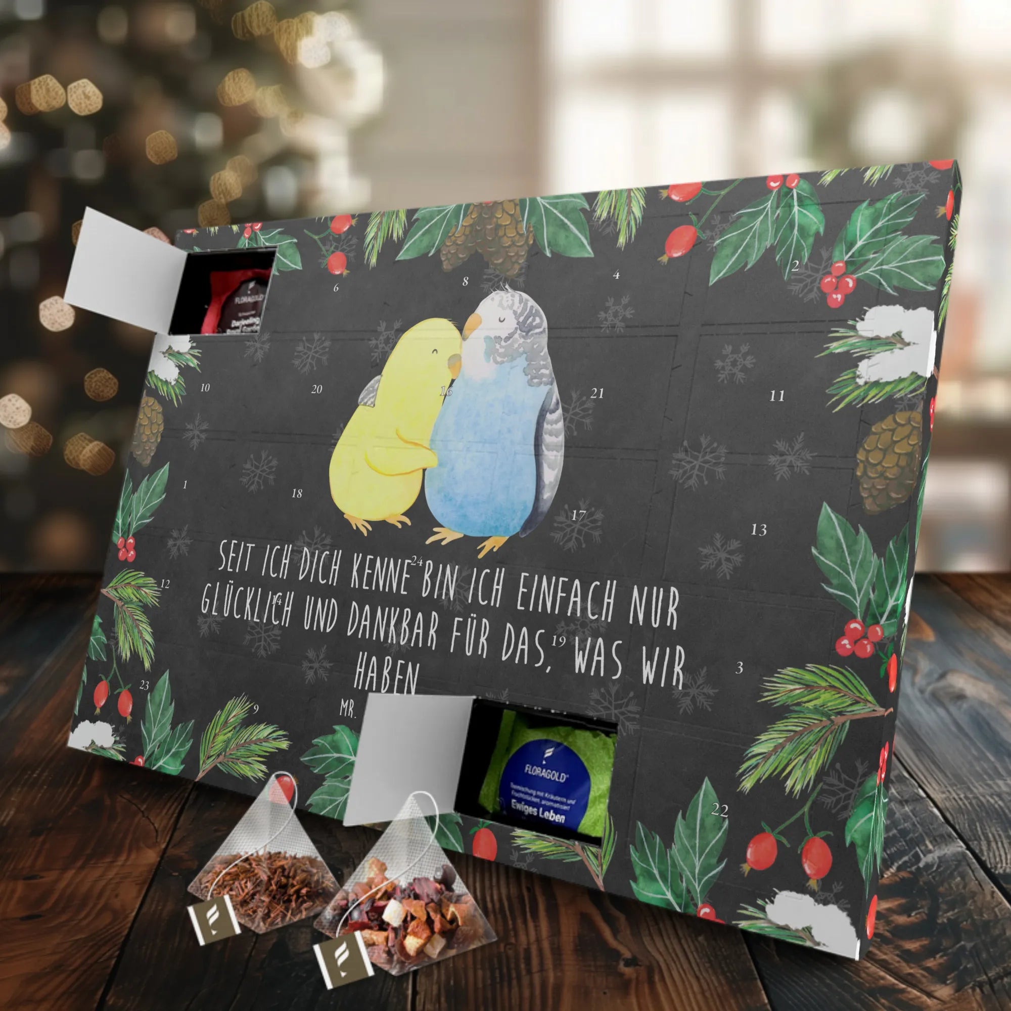 Der Kalender ist mit dem herzerwärmenden Slogan „Seit ich dich kenne bin ich einfach nur glücklich und dankbar für das, was wir haben...“ bedruckt und macht ihn zu einem idealen Geschenk für deinen Partner oder deine Partnerin, sei es zum Jahrestag, Hochzeitstag oder einfach als kleines Liebesgeschenk. Verliebt sein bedeutet Nähe und Vertrauen, und der Tee Adventskalender „Wellensittich Liebe“ verkörpert genau das.