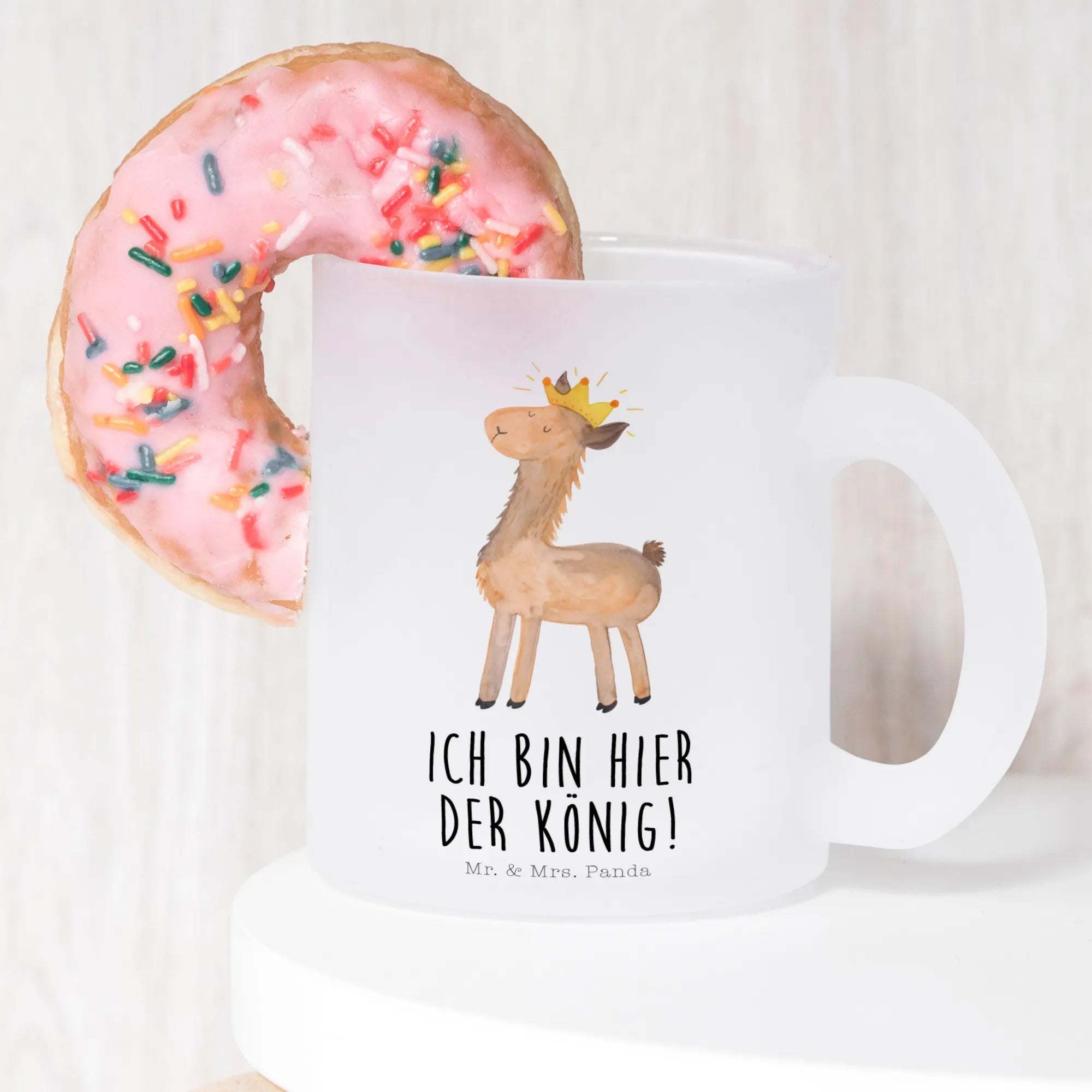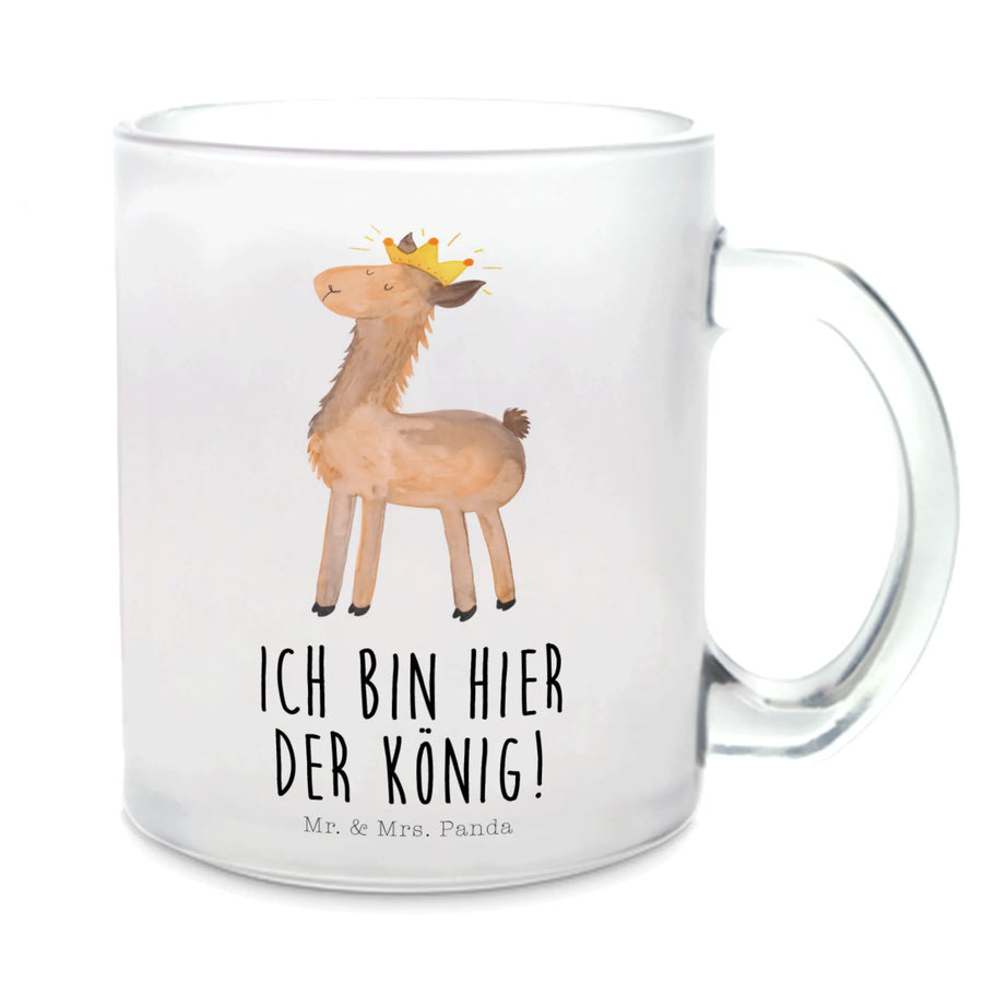 Die Teetasse Lama König aus der einzigartigen Lama-Kollektion von Mr. & Mrs. Panda ist das perfekte Geschenk für alle Lama-Liebhaber und Teegenießer! Stell dir vor, du hältst diese wunderschöne, handgezeichnete Teetasse in den Händen, die nicht nur durch ihr süßes Lama-Motiv besticht, sondern auch mit dem charmanten Slogan "Ich bin hier der König!" versehen ist. Diese Tasse aus robustem Premiumglas hat eine edle, matte Oberfläche und ist perfekt für Heißgetränke jeder Art – ob du jetzt lieber Tee, Glühwein oder Kaffee trinkst.