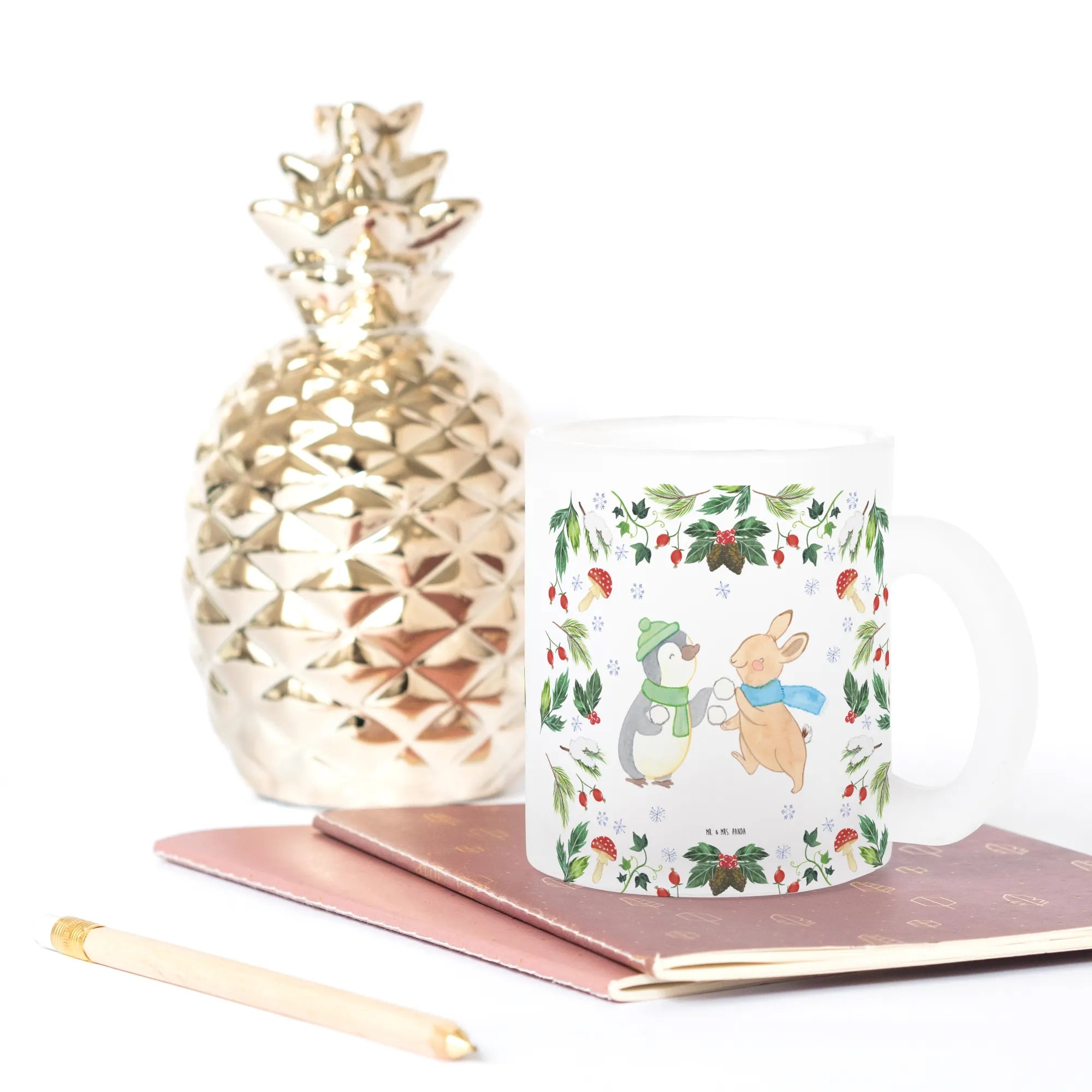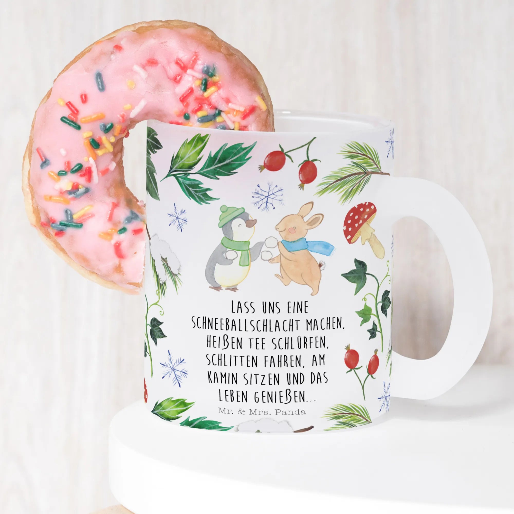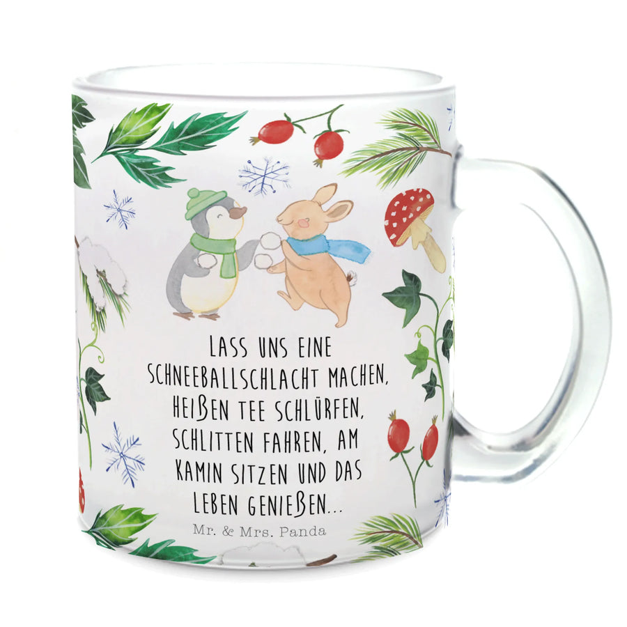 Mit einem liebevoll gestalteten Motiv, das einen süßen Hase und einen fröhlichen Pinguin zeigt, die eine muntere Schneeballschlacht veranstalten, spiegelt sie die Magie des Winters wider. Diese wunderschöne Teetasse aus robustem, extra starkem Premiumglas ist perfekt für alle Heißgetränke – sei es Tee, Glühwein oder Kaffee. Der hitzebeständige Aufdruck bleibt auch bei heißem Inhalt strahlend schön!