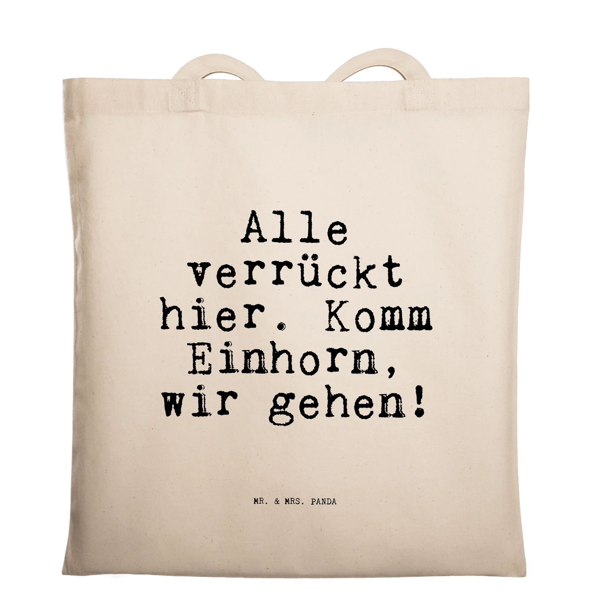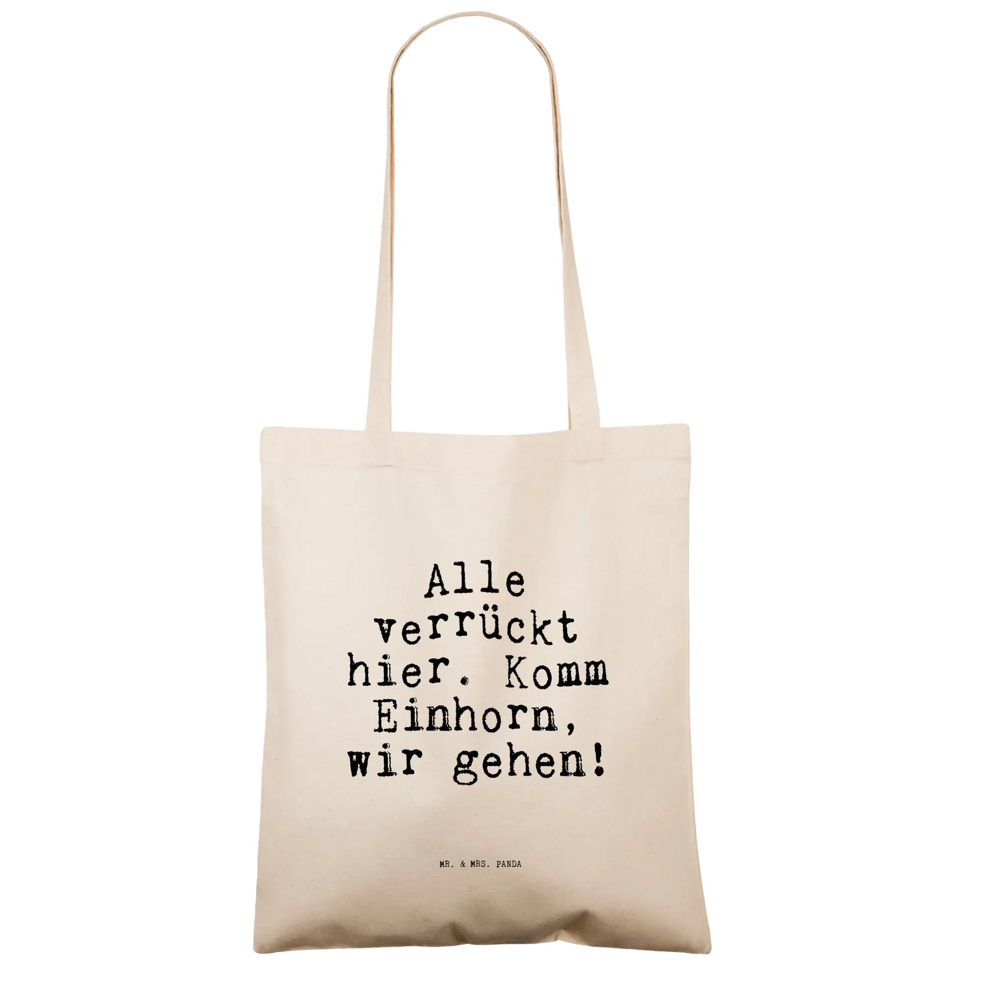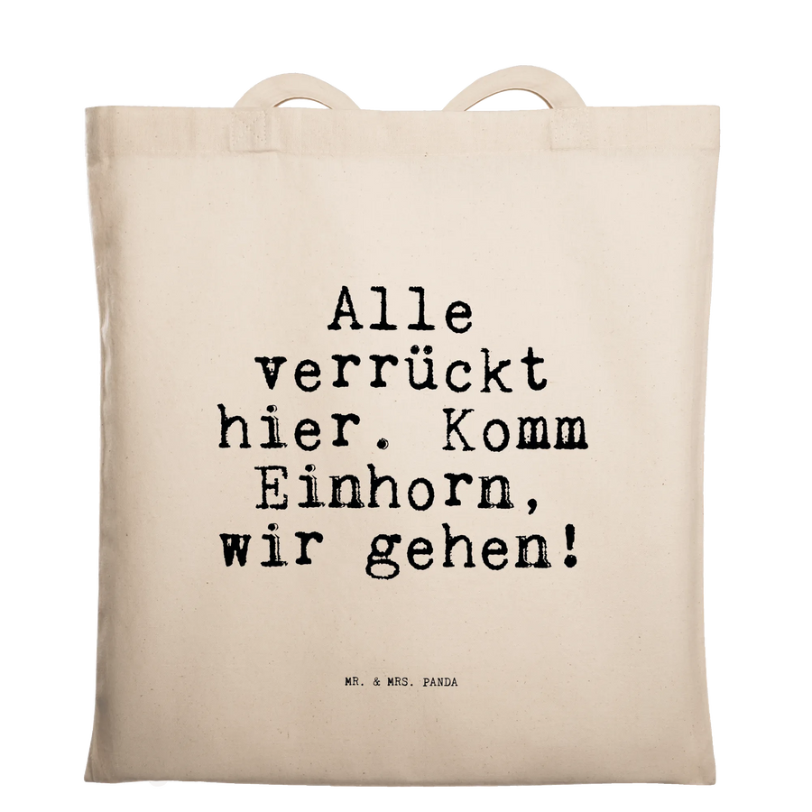 Entdecke die perfekte Tragetasche von Mr. & Mrs. Panda! Mit dem witzigen Spruch "Alle verrückt hier. Komm Einhorn, wir gehen!" ist diese Tragetasche nicht nur ein praktisches Accessoire, sondern auch ein echter Hingucker. Sie besteht aus 100% Baumwolle und bietet mit ihren Maßen von 420 mm x 380 mm ausreichend Platz für deine Einkäufe, Strandbesuche oder den täglichen Weg zur Arbeit.