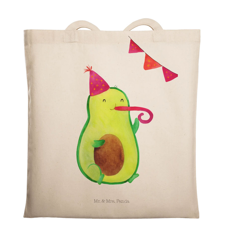 Avocado Party Tragetasche von Mr. & Mrs. Panda – die fröhliche Geschenkidee für Avocado-Fans, Veggies und Feierfreudige! Die niedliche Avocado mit Partyhut und Partypfeife wurde liebevoll von Mrs. Panda handgezeichnet und verbreitet gute Laune bei jedem Einsatz. Perfekt als Geschenk Geburtstag, Mitbringsel zur Party oder nachhaltige Einkaufstasche.