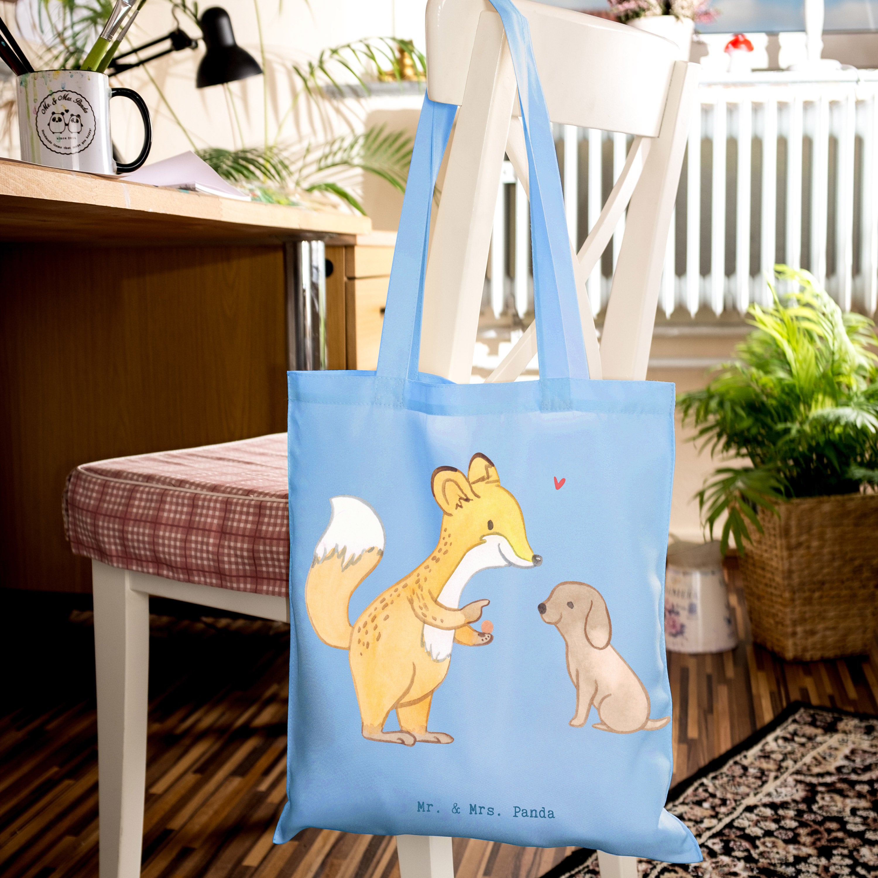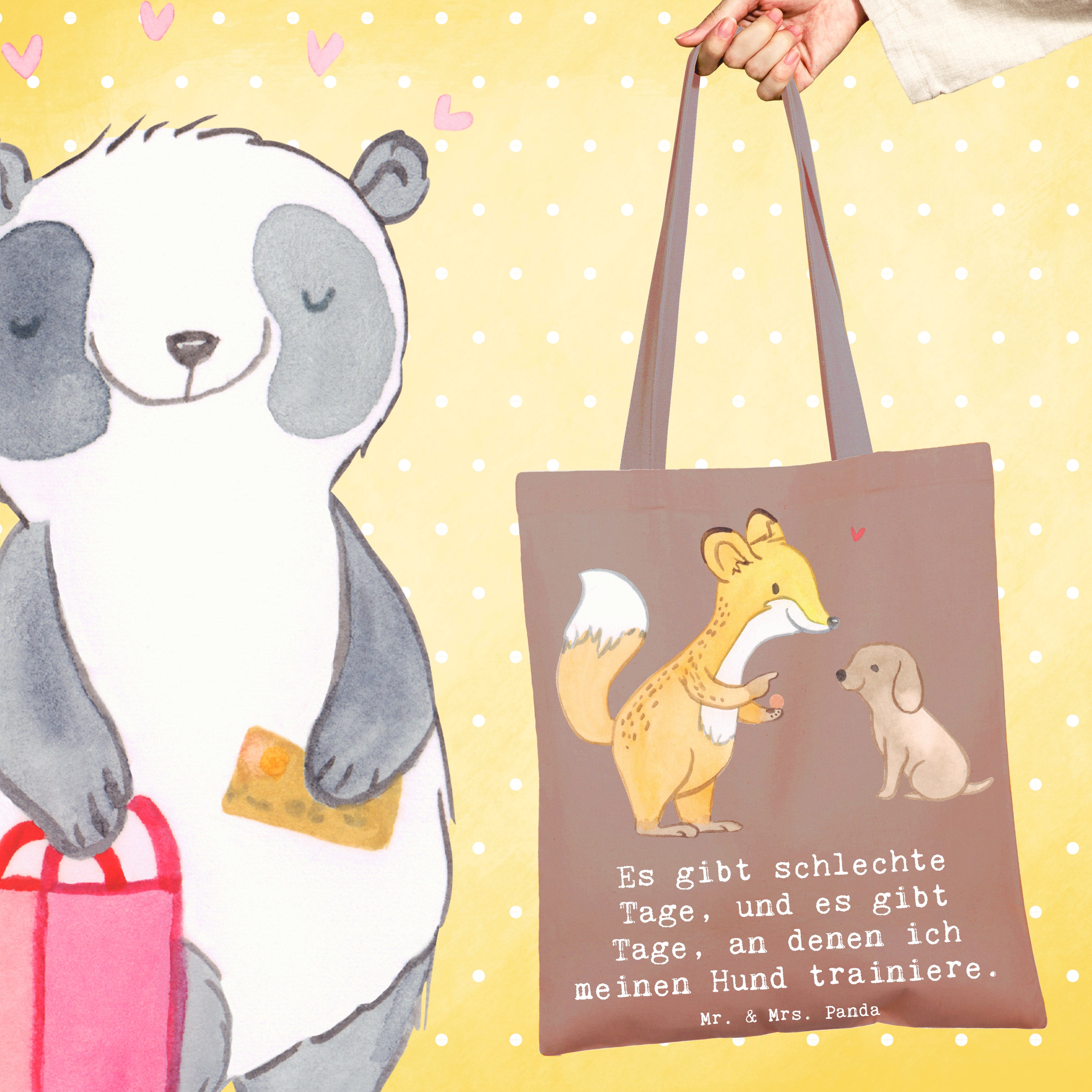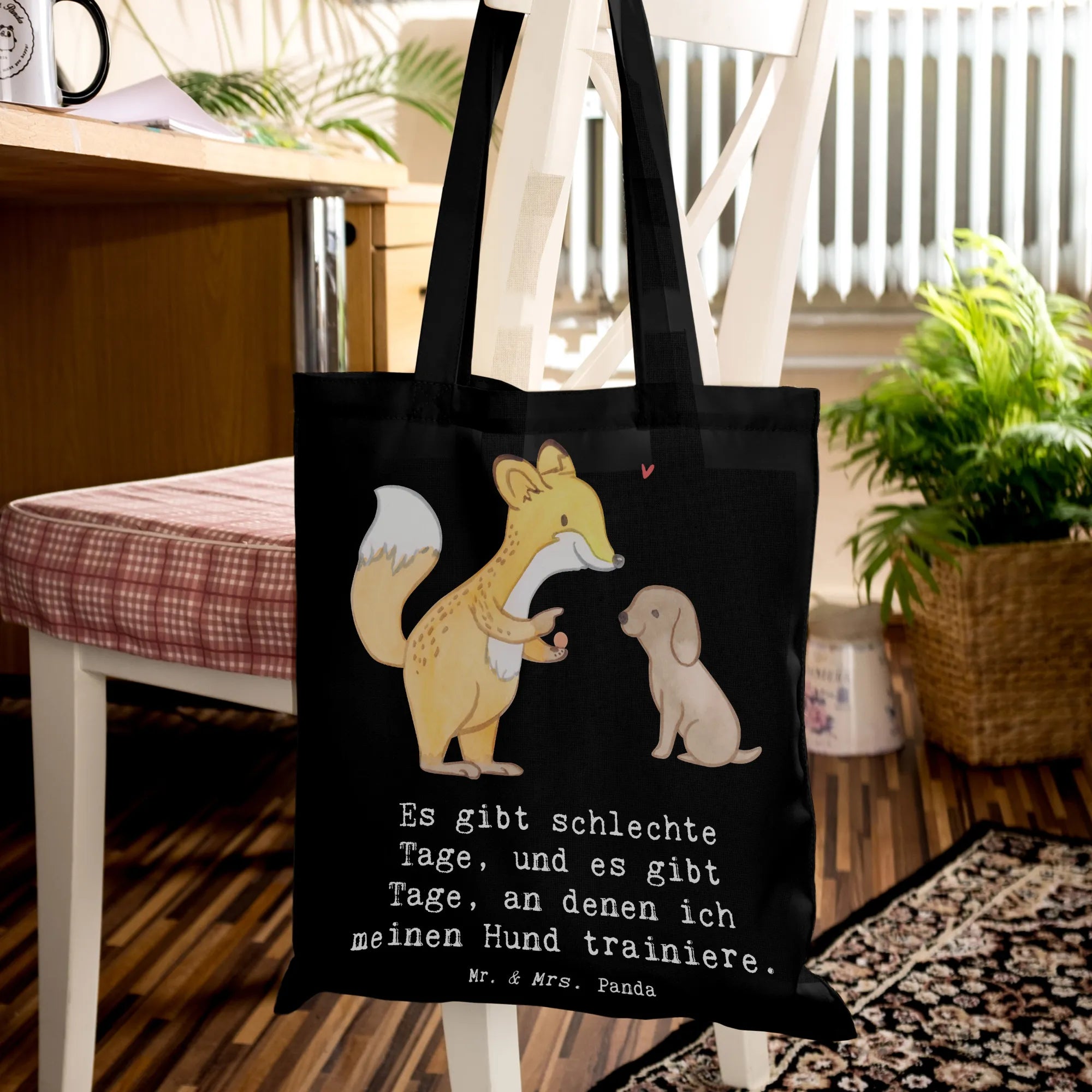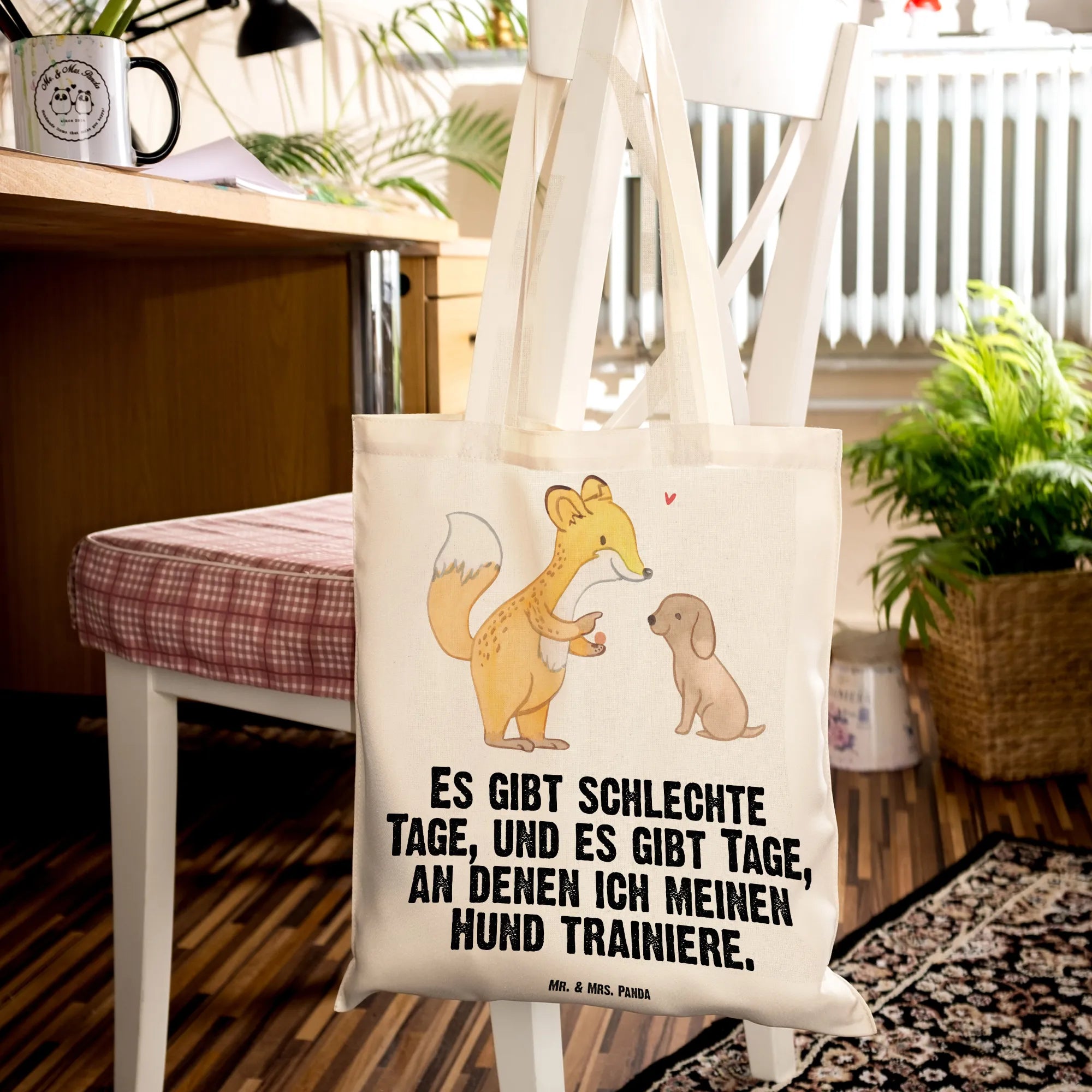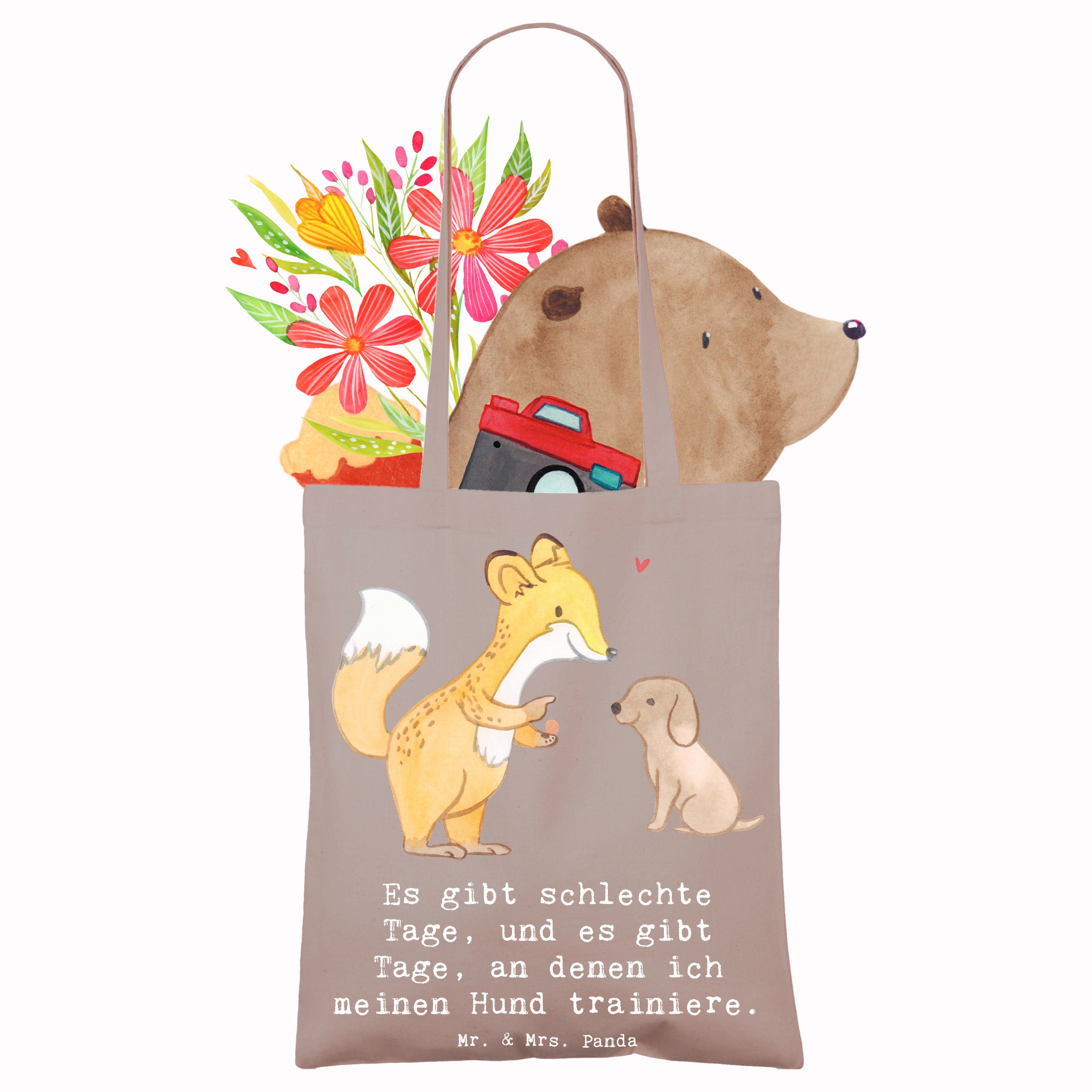 Entdecke die niedliche Tragetasche mit dem Motiv 'Fuchs Hundetraining Tage' von Mr. & Mrs. Panda! Diese wunderschöne Tragetasche ist nicht nur ein praktisches Accessoire, sondern auch das perfekte Geschenk für Hundeliebhaber und Sportbegeisterte. Der süße Fuchs, der einem kleinen Hund Kommandos gibt, bringt Freude und Motivation für alle, die sich mit Hundetraining beschäftigen. Egal, ob du deinen Hund zur Hundeschule bringst oder einfach nur mit ihm spielst, diese Tragetasche ist ideal, um alles Nötige mitzunehmen.