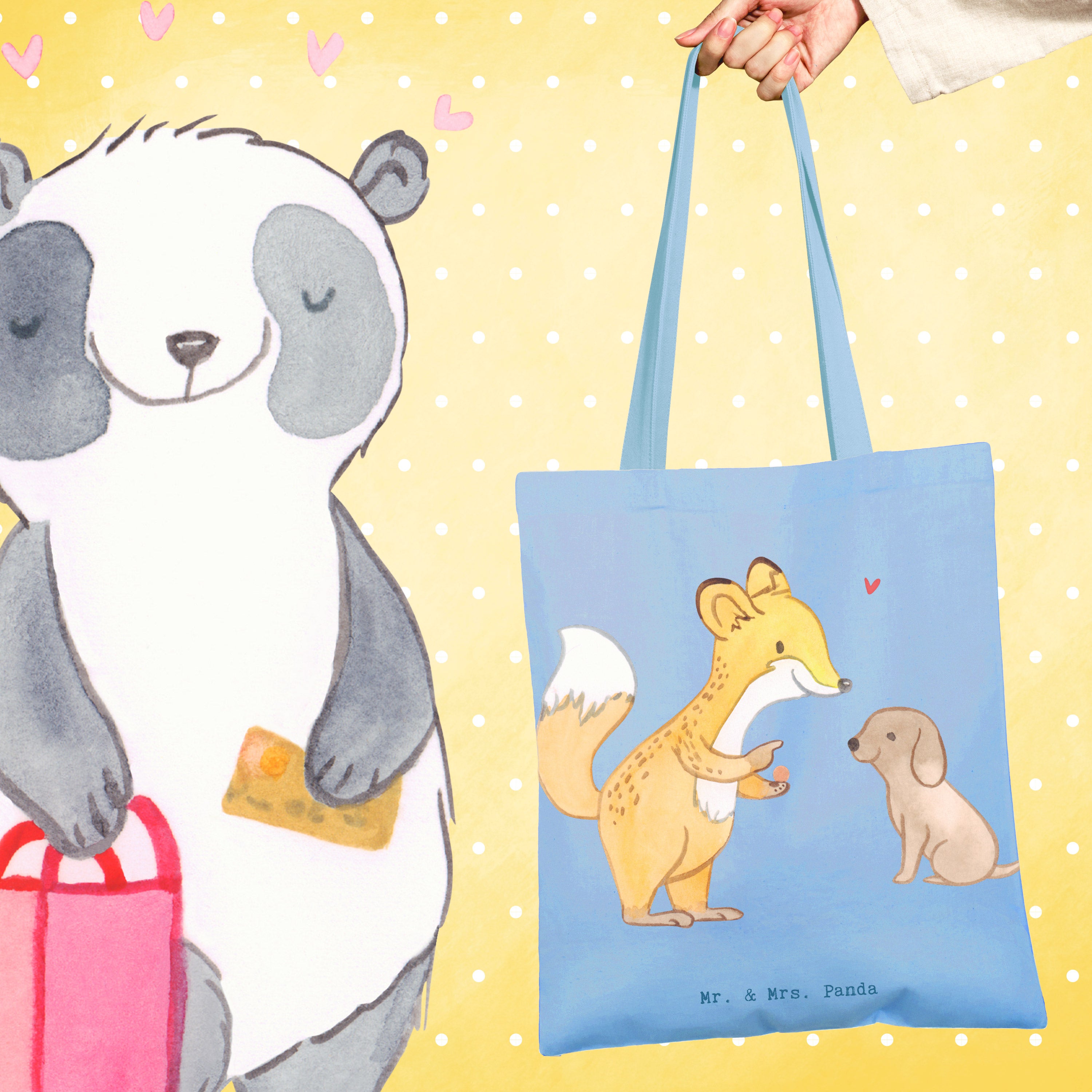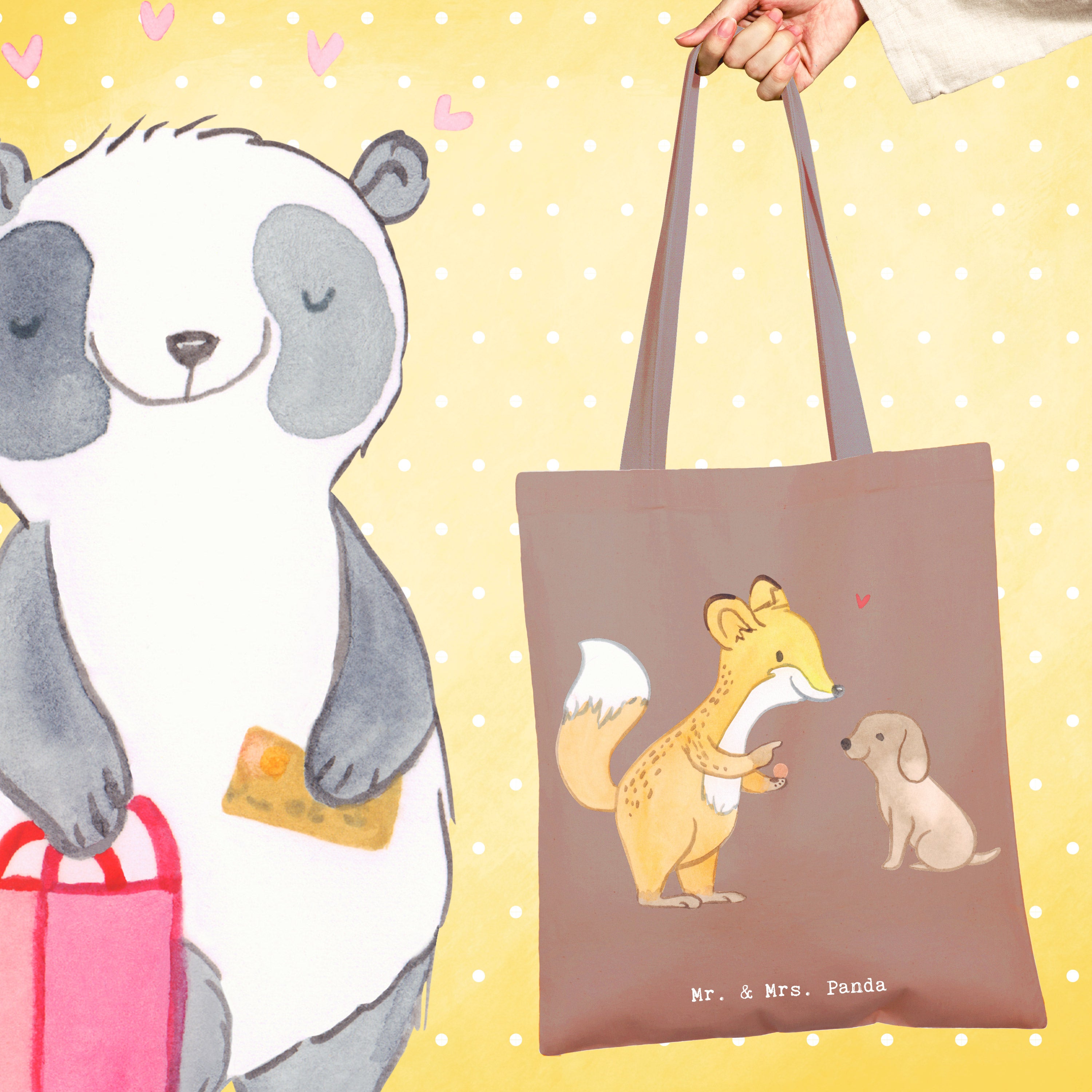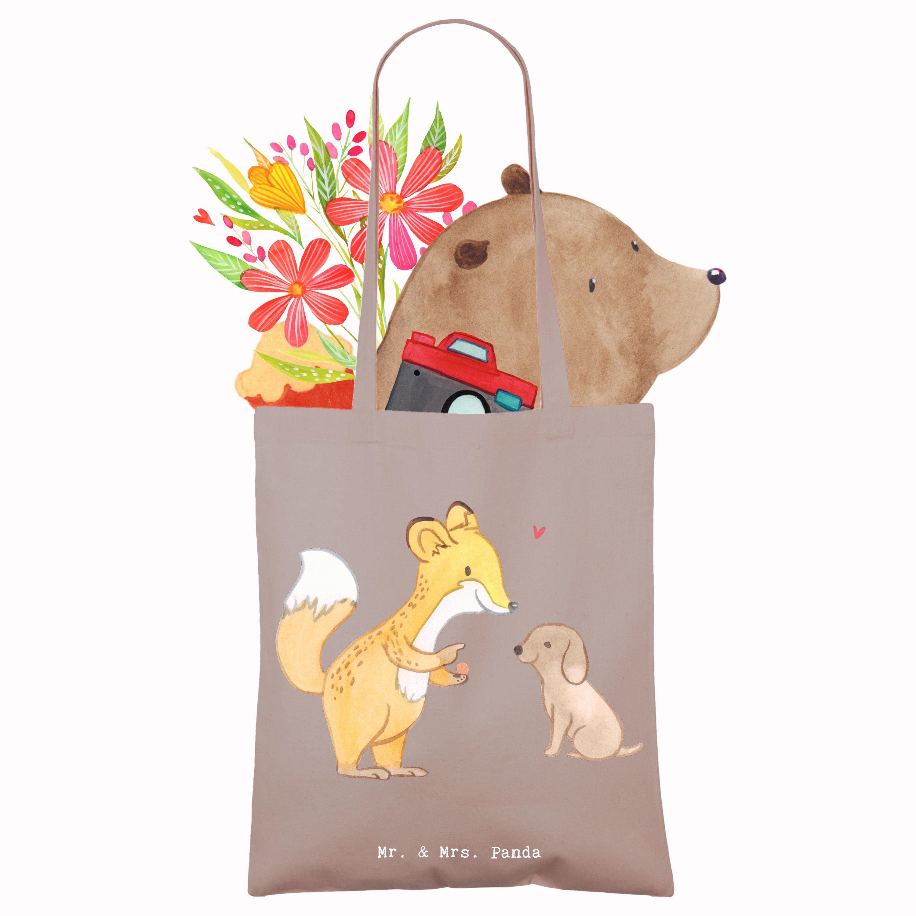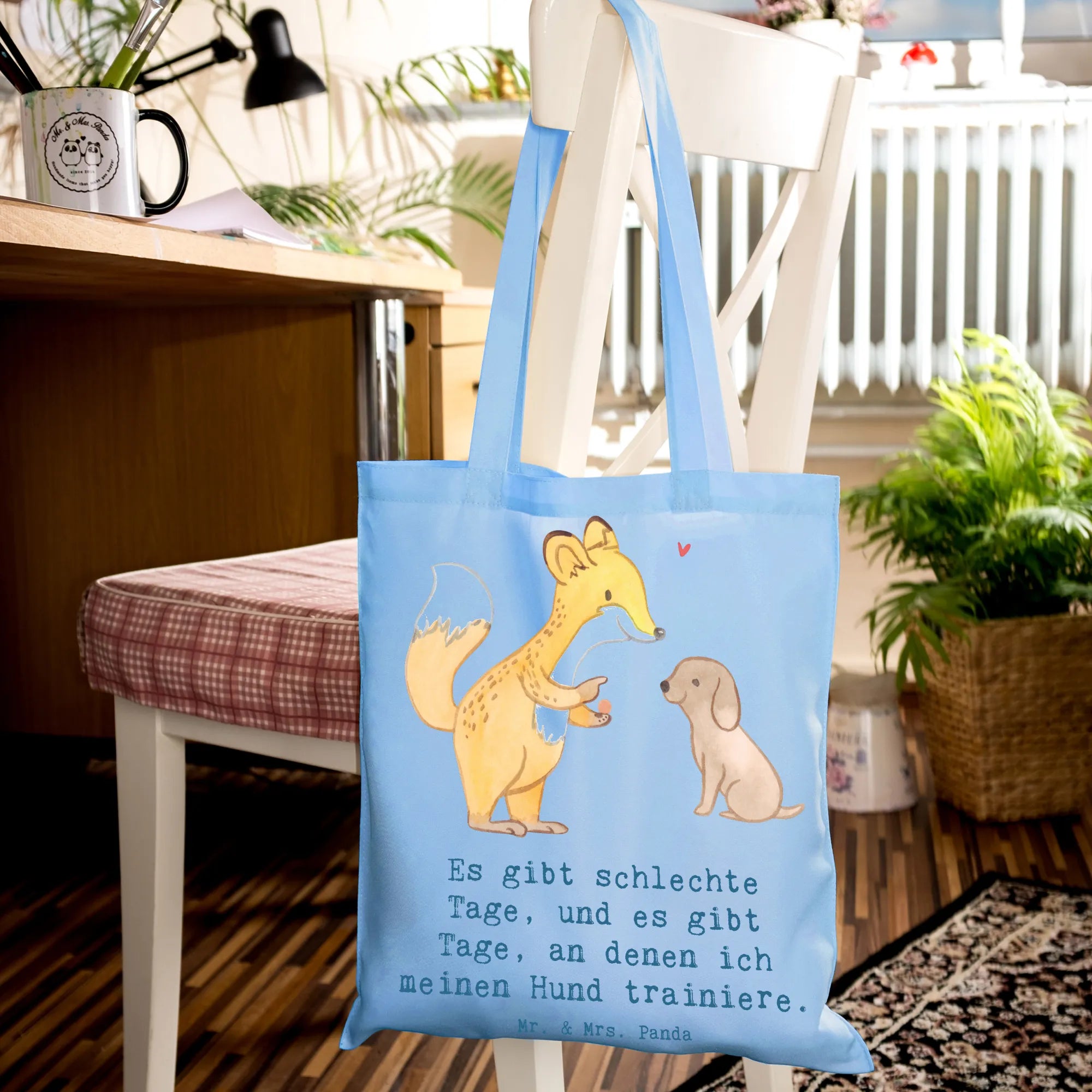 Entdecke die niedliche Tragetasche mit dem Motiv 'Fuchs Hundetraining Tage' von Mr. & Mrs. Panda! Diese wunderschöne Tragetasche ist nicht nur ein praktisches Accessoire, sondern auch das perfekte Geschenk für Hundeliebhaber und Sportbegeisterte. Der süße Fuchs, der einem kleinen Hund Kommandos gibt, bringt Freude und Motivation für alle, die sich mit Hundetraining beschäftigen. Egal, ob du deinen Hund zur Hundeschule bringst oder einfach nur mit ihm spielst, diese Tragetasche ist ideal, um alles Nötige mitzunehmen.