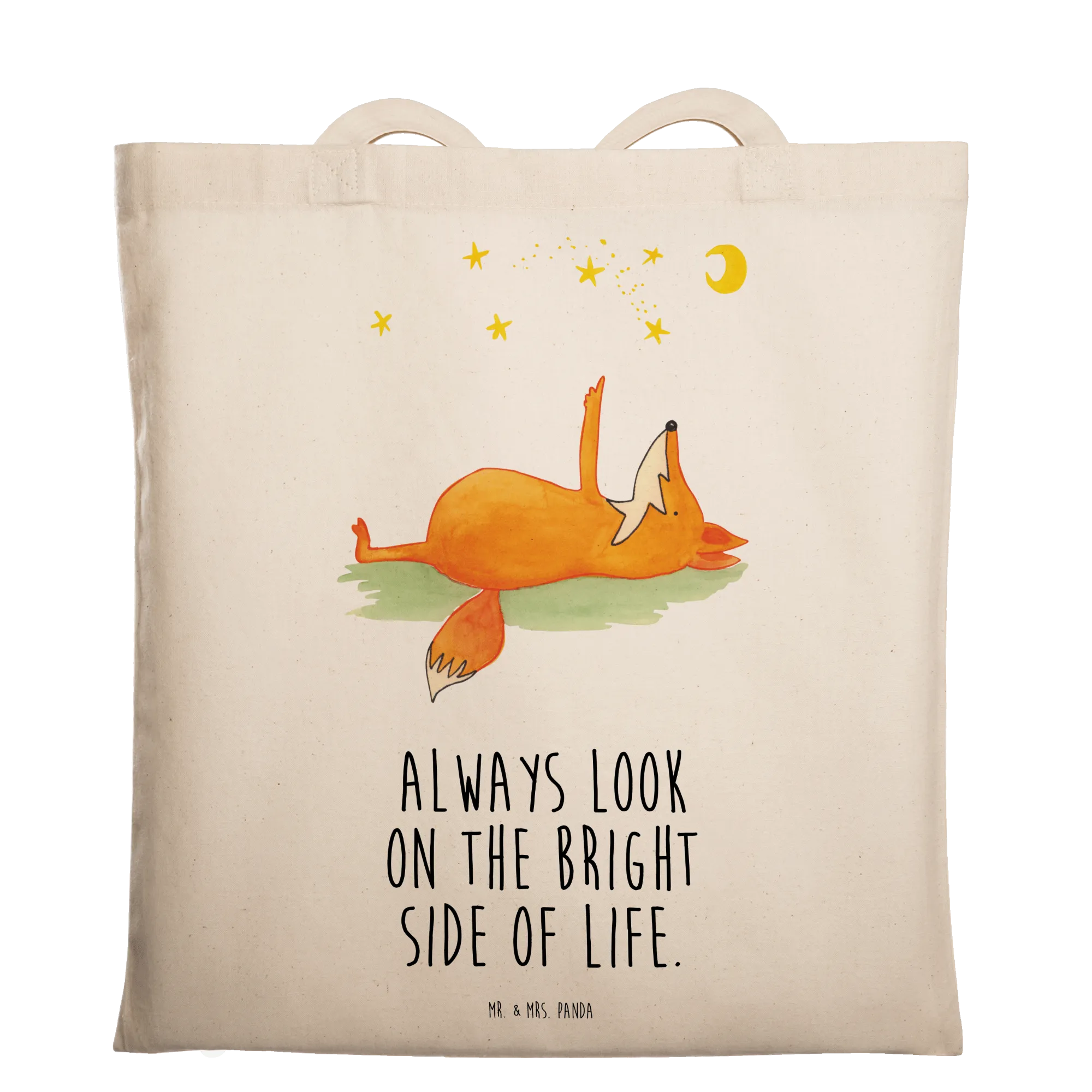 Die Tragetasche "Fuchs Sterne" von Mr. & Mrs. Panda ist das perfekte Accessoire für alle, die die Sterne lieben und täglich Freude verbreiten möchten. Hochwertig aus 100% Baumwolle gefertigt, vereint diese liebevoll gestaltete Tasche Funktionalität und Stil. Mit einem süßen Fuchs, der auf dem Rücken liegt und den Sternen zuschaut, bringt das Design Freude in deinen Alltag. Der Slogan "Always look on the bright side of life" erinnert dich daran, stets positiv zu bleiben, ganz gleich, was kommt.