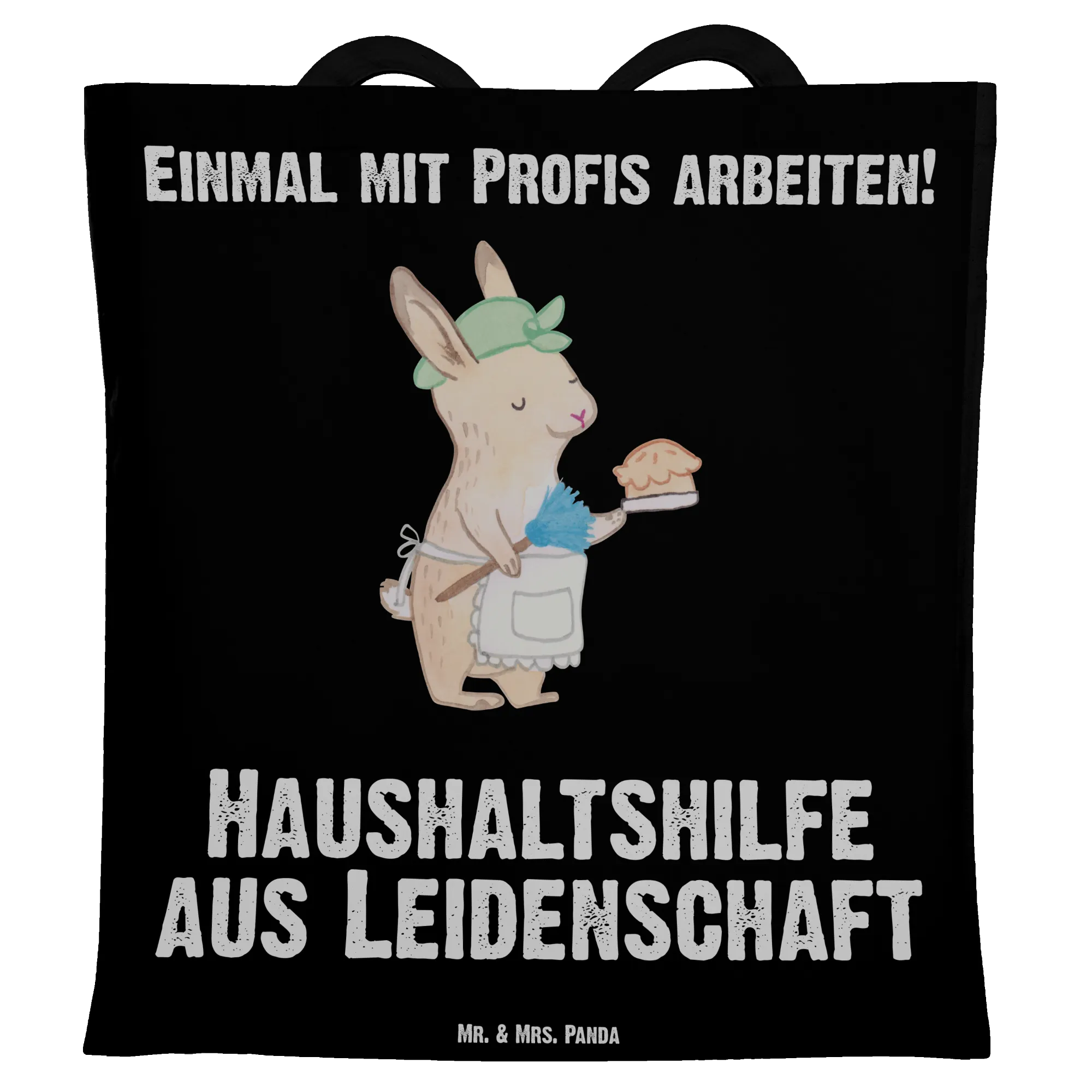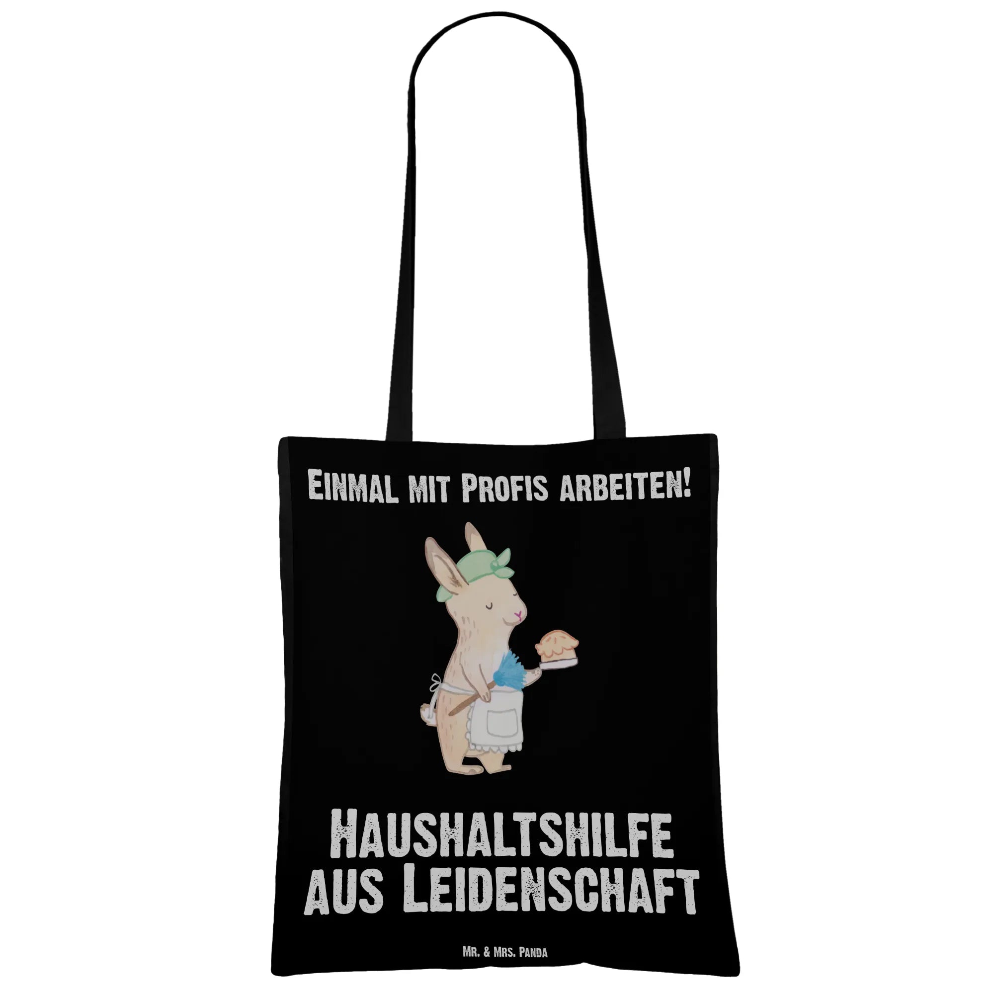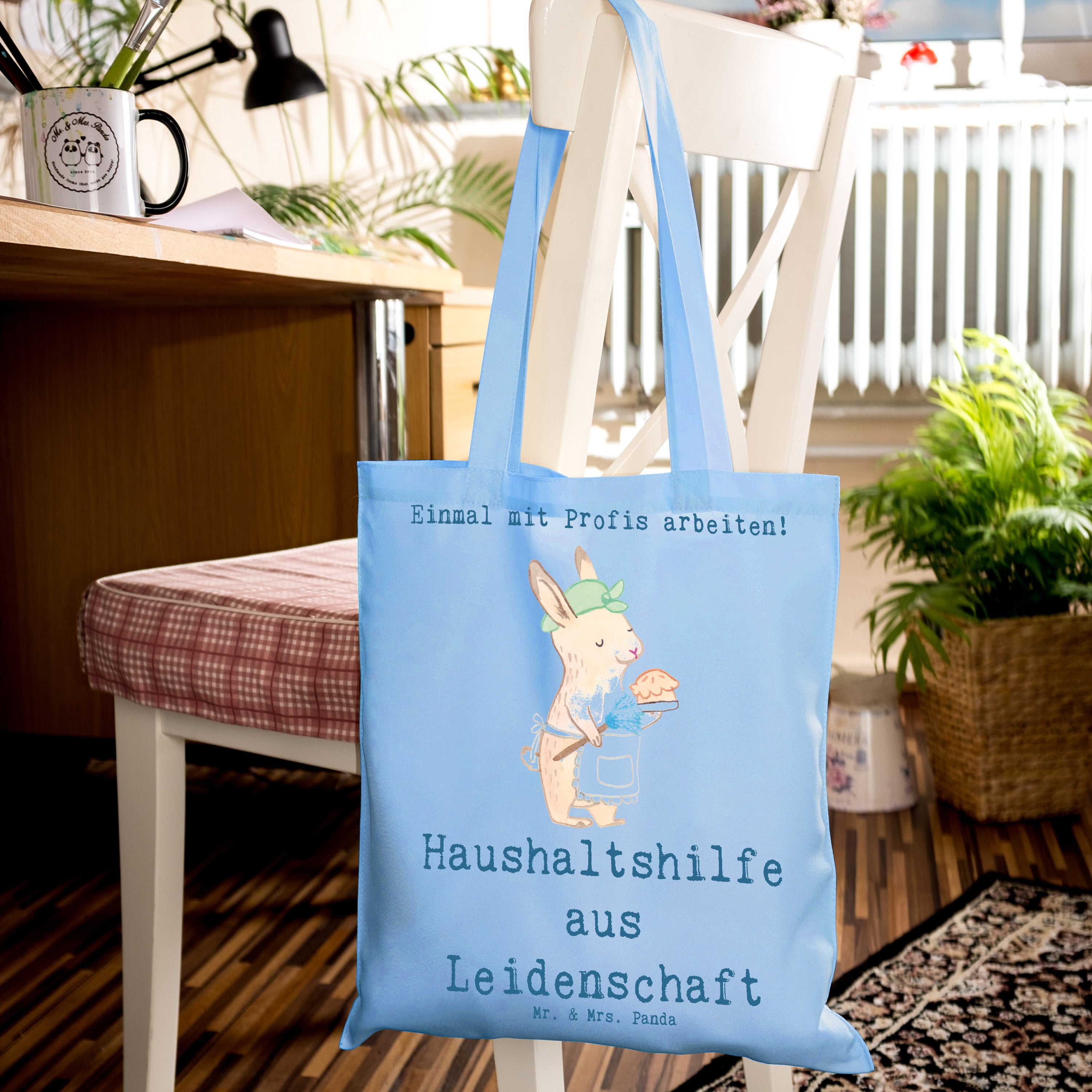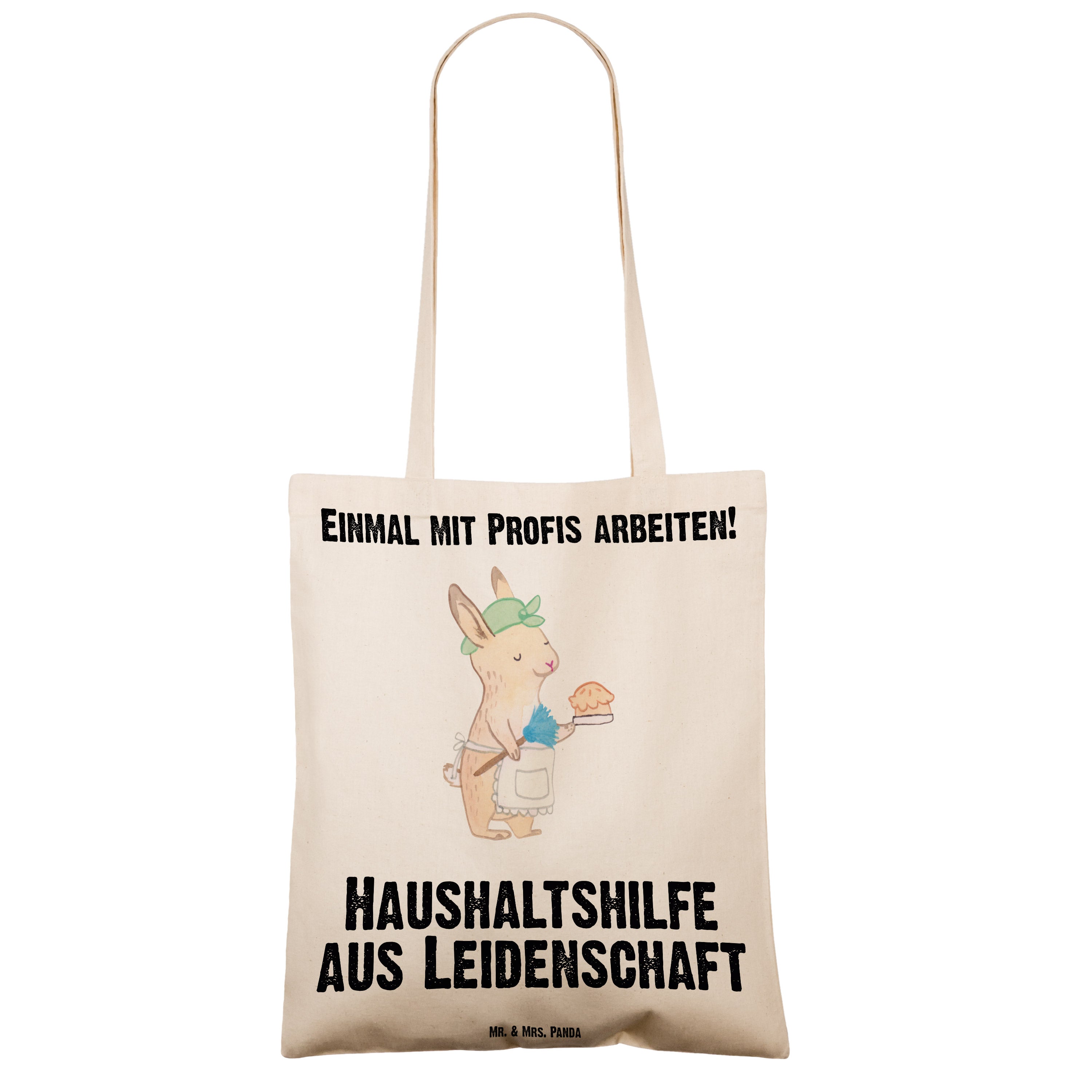 Die Tragetasche "Haushaltshilfe aus Leidenschaft" von Mr. & Mrs. Panda ist das perfekte Geschenk für alle, die im Haushalt helfen und dabei nicht nur ihre Aufgaben erfüllen, sondern das Ganze mit Leidenschaft machen. Mit einem süßen Design, das eine Haushaltshilfe mit einem Staubwedel und einem Hasen in einer Schürze zeigt, drückt diese Tasche Dankbarkeit aus, die jeder Hausfrau, Reinigungskraft oder Putzfrau gebührt.