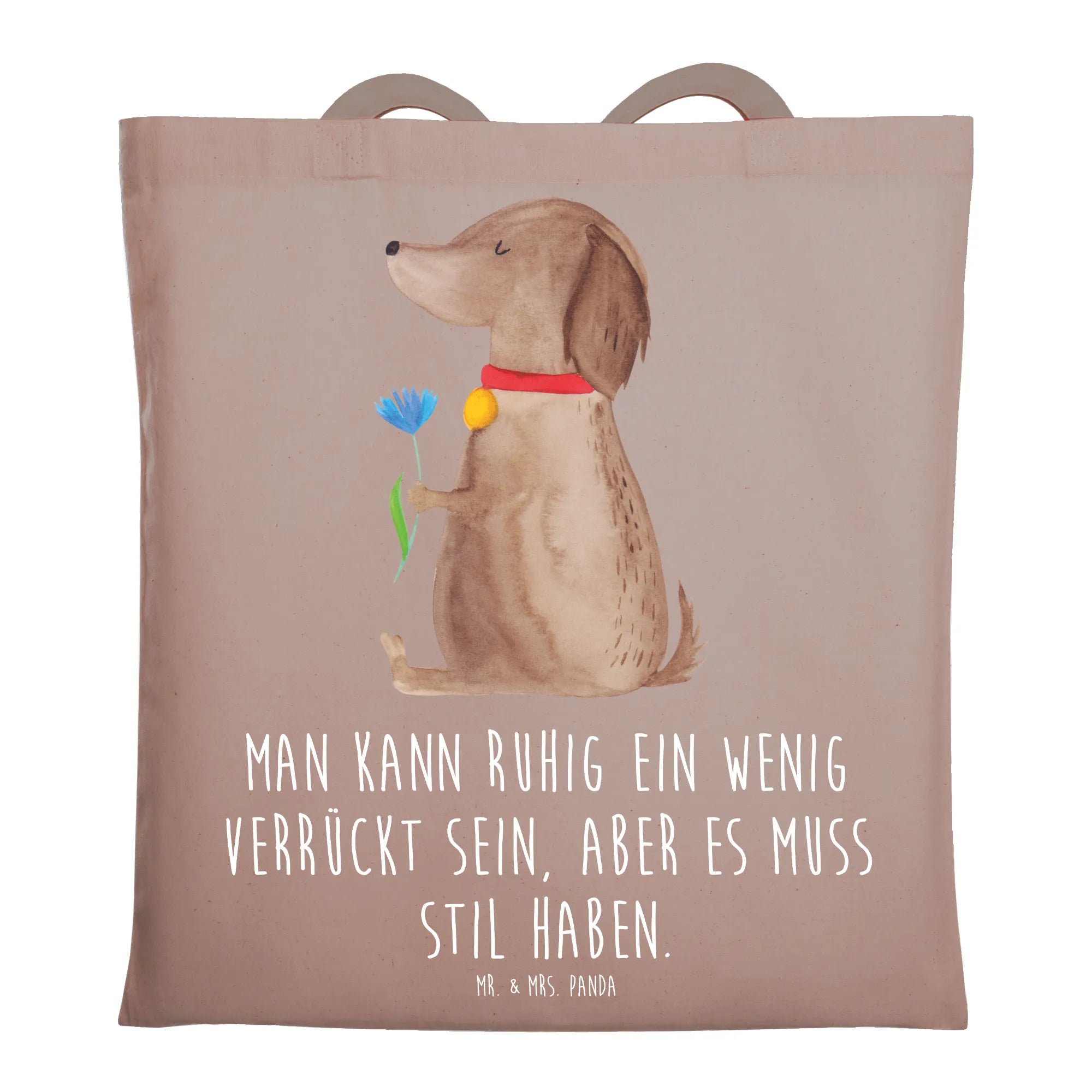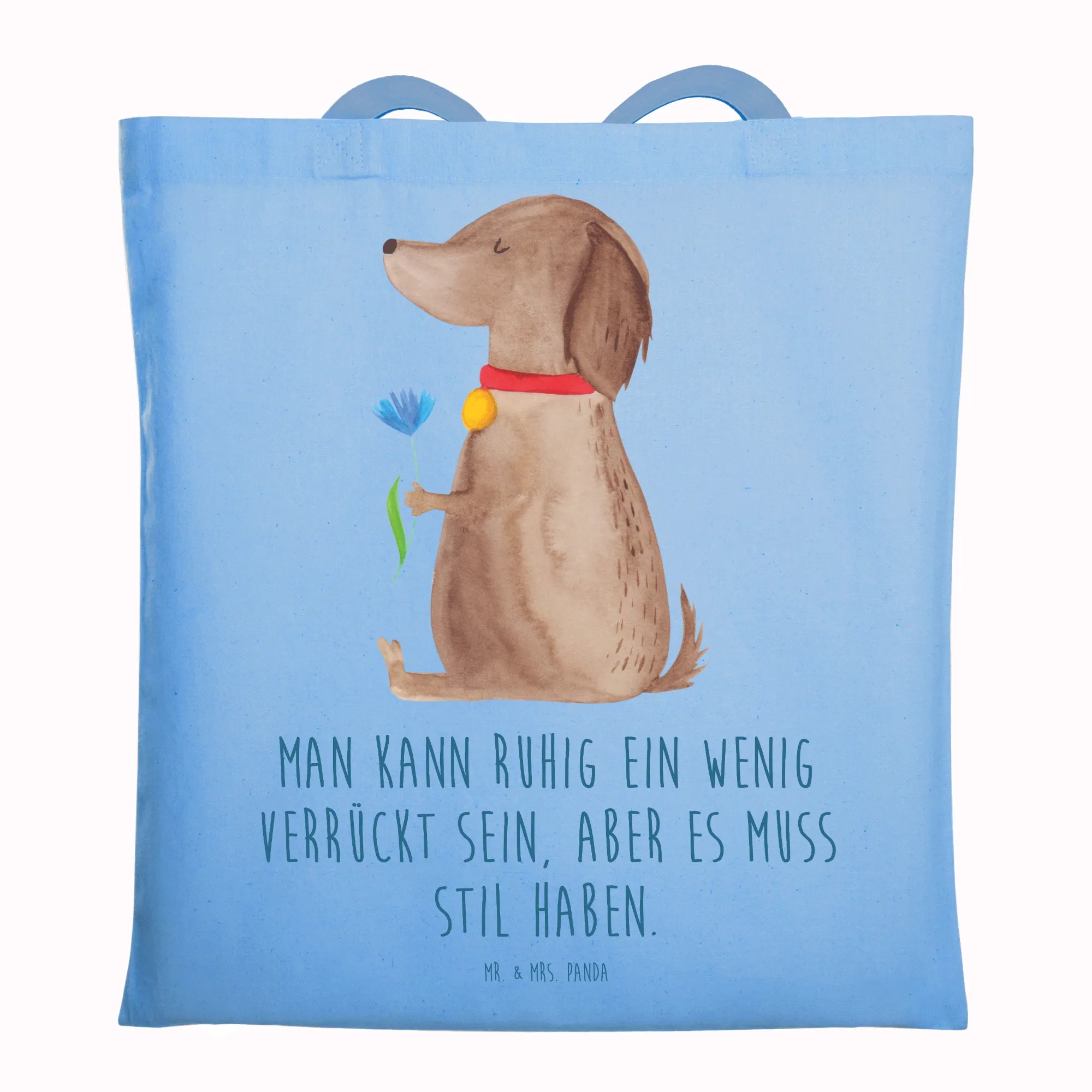 Diese hübsche Tragetasche aus unserer Hunde Kollektion vereint niedliches Design mit Alltagstauglichkeit. Das Motiv zeigt eine süße Hündin mit einer Blume im Fell vor einem ruhigen, himmelblauen Hintergrund – handgezeichnet von Mrs. Panda. Der liebevolle Spruch „Man kann ruhig ein wenig verrückt sein, aber es muss Stil haben." macht die Tasche zum perfekten Geschenk für alle Hundebesitzer und Frauchen, die Stil und Humor lieben. 🐶🌸
