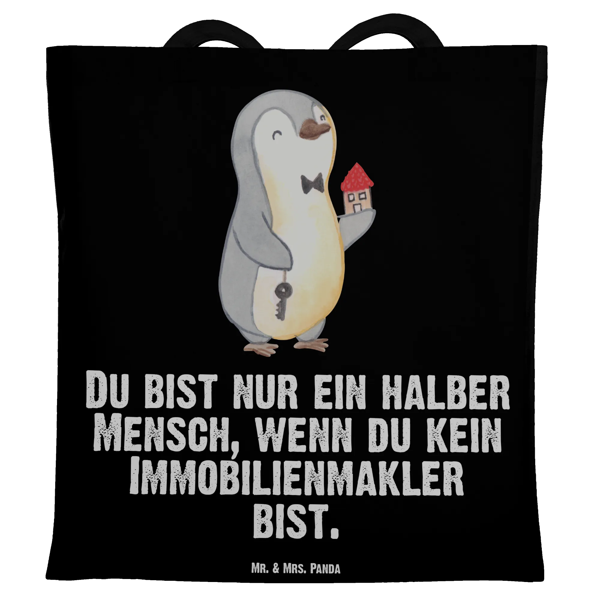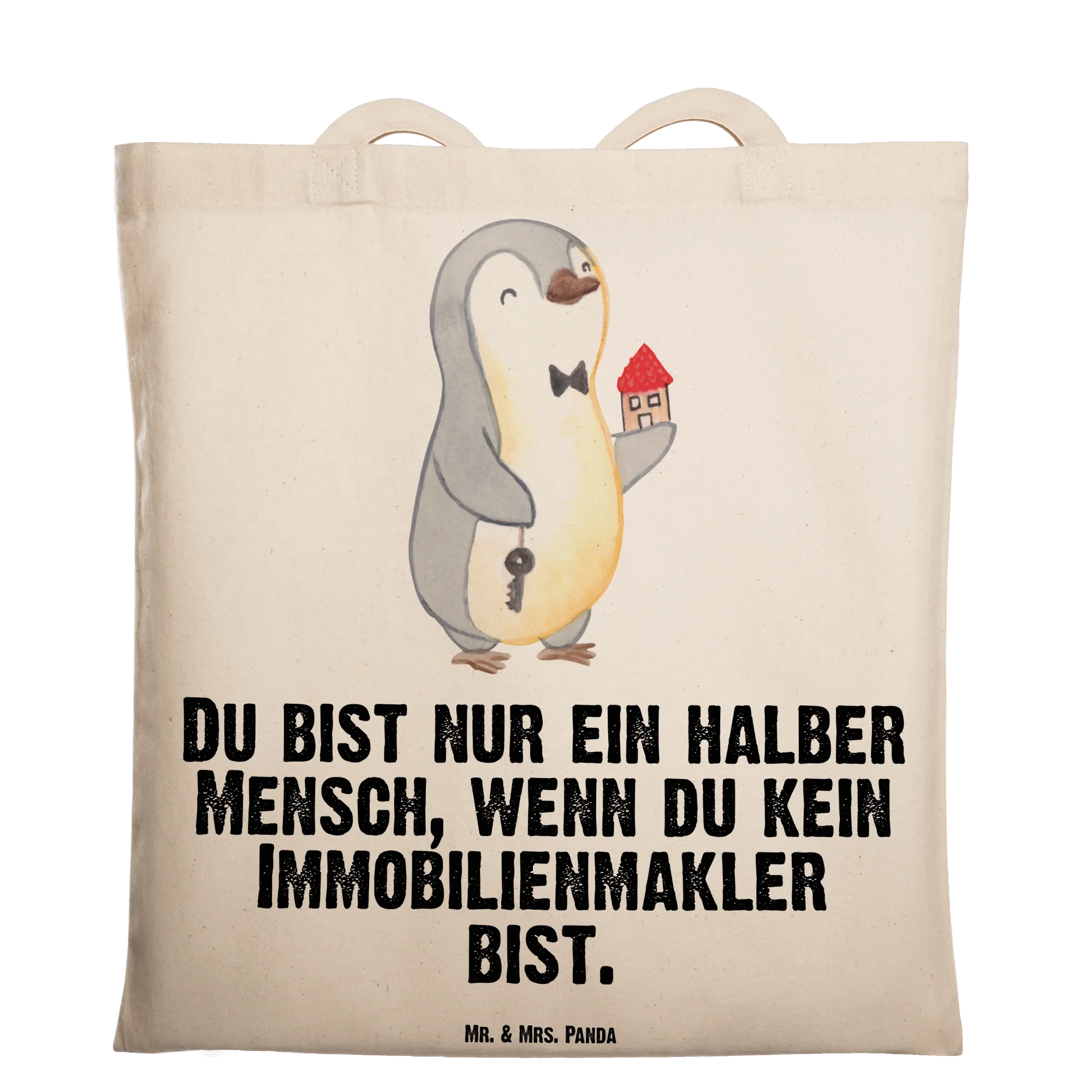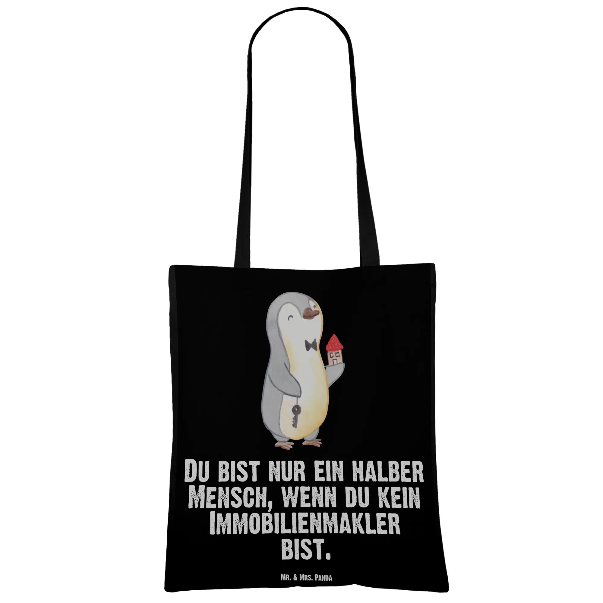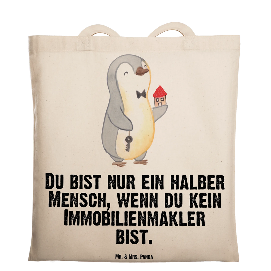 Mit einem süßen Pinguin, der in einer Hand einen Schlüssel und in der anderen Hand ein Haus hält, kombiniert mit dem witzigen Slogan "Du bist nur ein halber Mensch, wenn du kein Immobilienmakler bist", strahlt die Tasche eine fröhliche Energie aus. Sie ist ideal für verschiedene Anlässe, egal ob zum Berufsabschied, für das Jubiläum, als kleines Dankeschön für einen Kollegen oder einfach nur, um jemandem eine Freude zu machen.