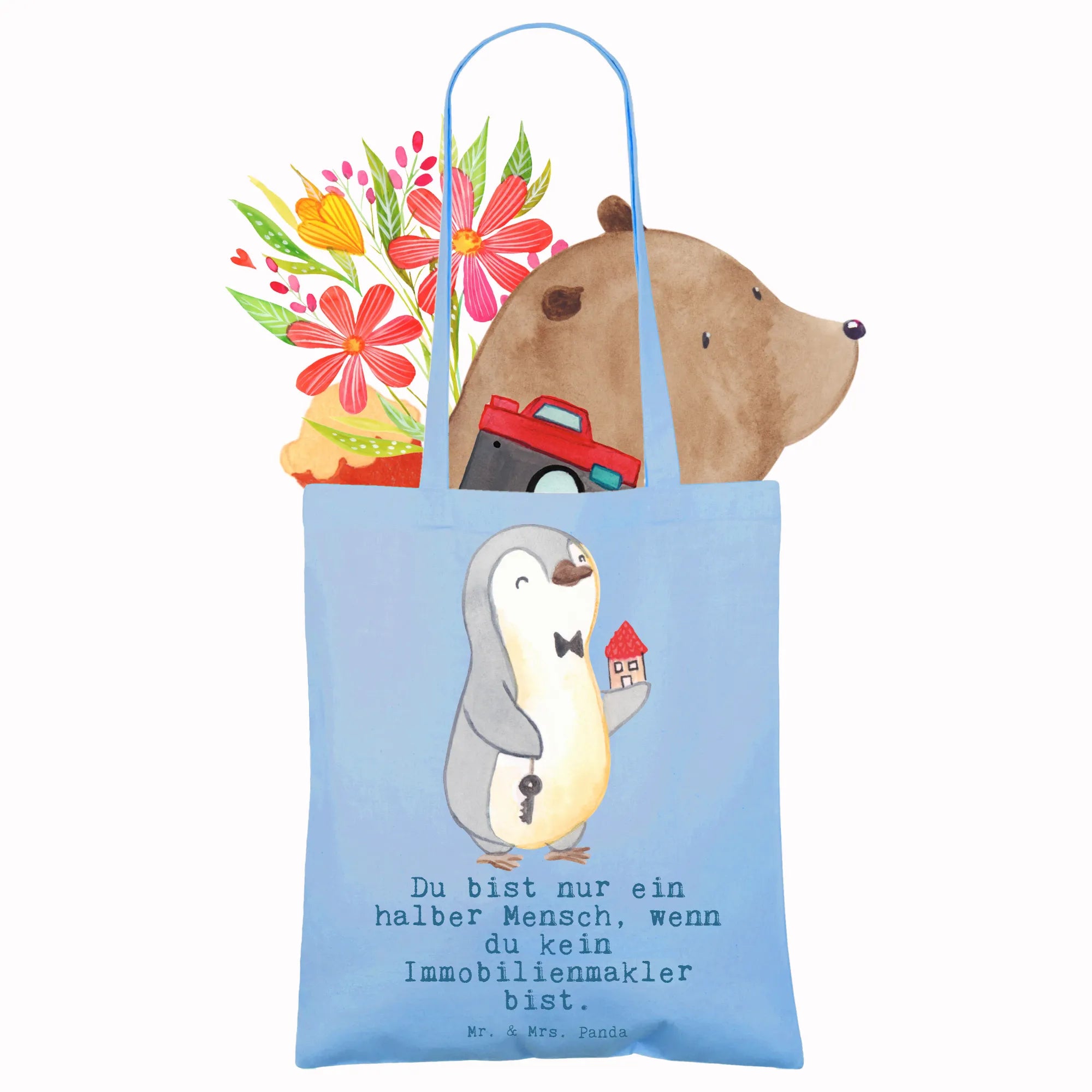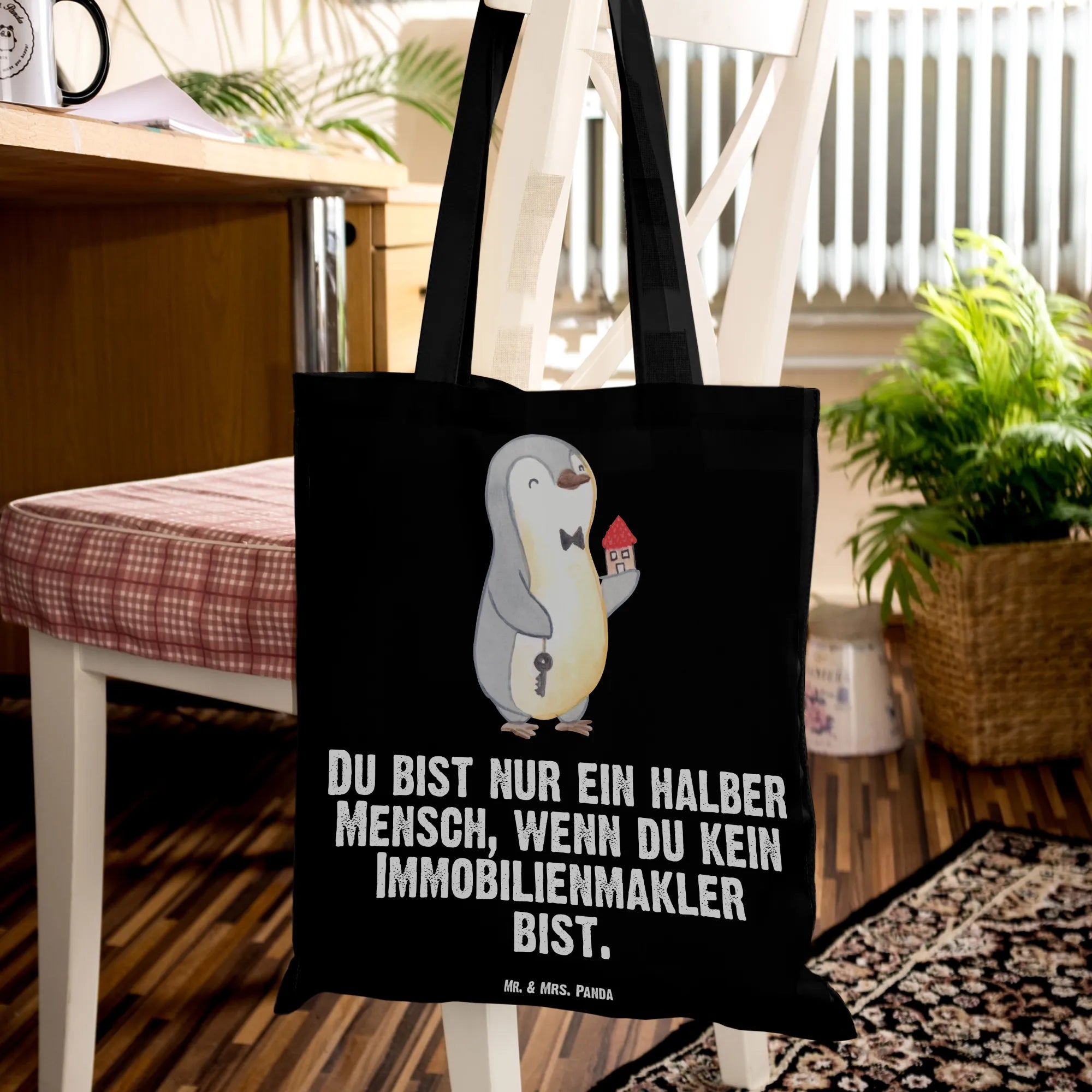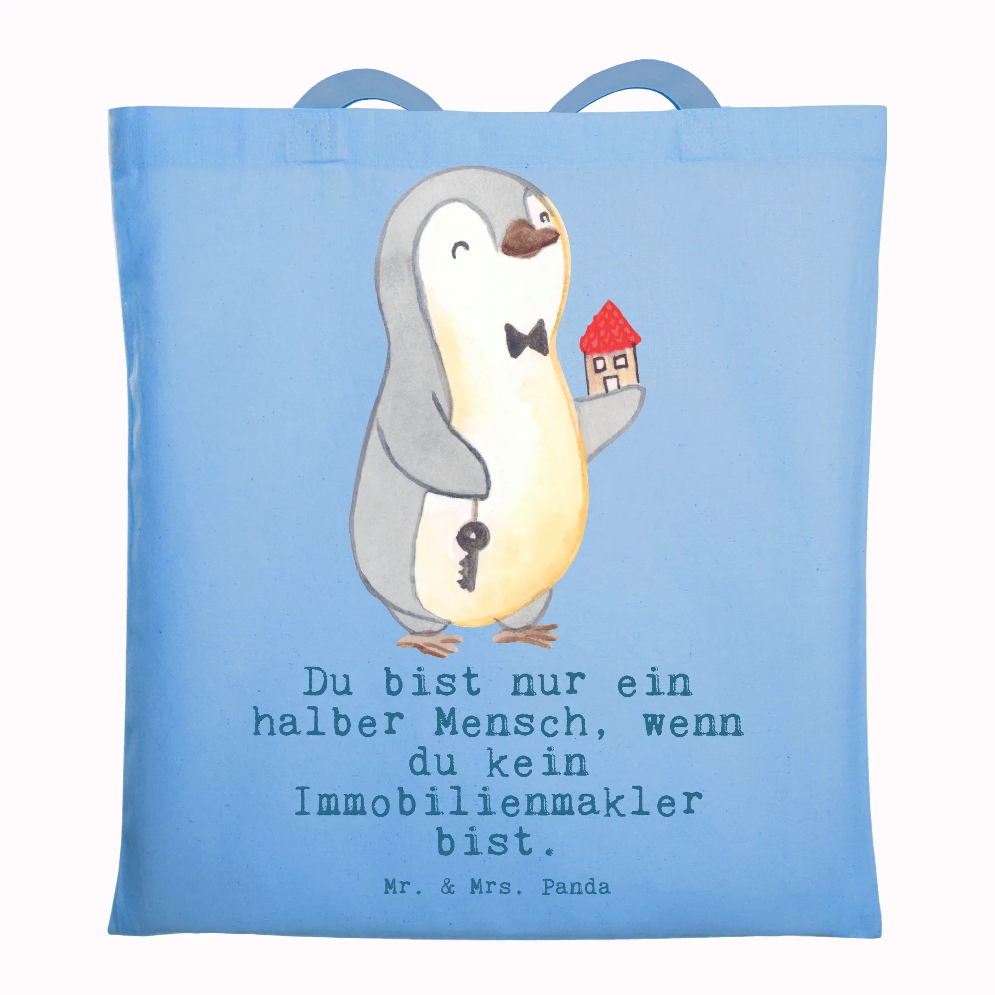 Mit einem süßen Pinguin, der in einer Hand einen Schlüssel und in der anderen Hand ein Haus hält, kombiniert mit dem witzigen Slogan "Du bist nur ein halber Mensch, wenn du kein Immobilienmakler bist", strahlt die Tasche eine fröhliche Energie aus. Sie ist ideal für verschiedene Anlässe, egal ob zum Berufsabschied, für das Jubiläum, als kleines Dankeschön für einen Kollegen oder einfach nur, um jemandem eine Freude zu machen.