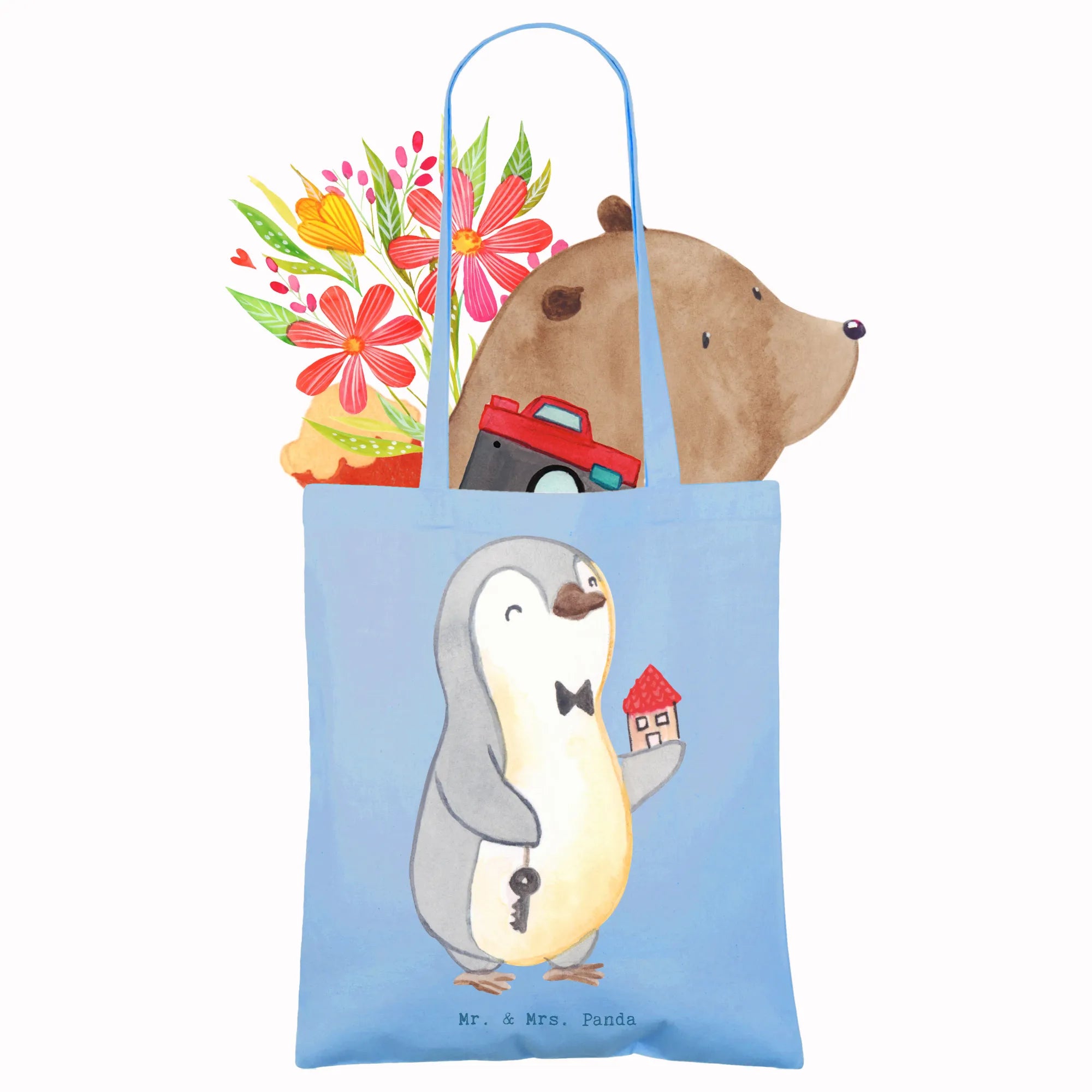Sorgenfalten? Nicht mit dieser Tasche! Sie ist pflegeleicht und lässt sich bei lauwarmen Handwäsche problemlos reinigen. Mach deinen Freunden oder Kollegen eine Freude und verschenke ein Stück Herzen von Mr. & Mrs. Panda. Diese Tasche ist der perfekte Begleiter für jeden Immobilienmakler oder Immobilienhändler, um seinen Alltag etwas bunter zu gestalten.