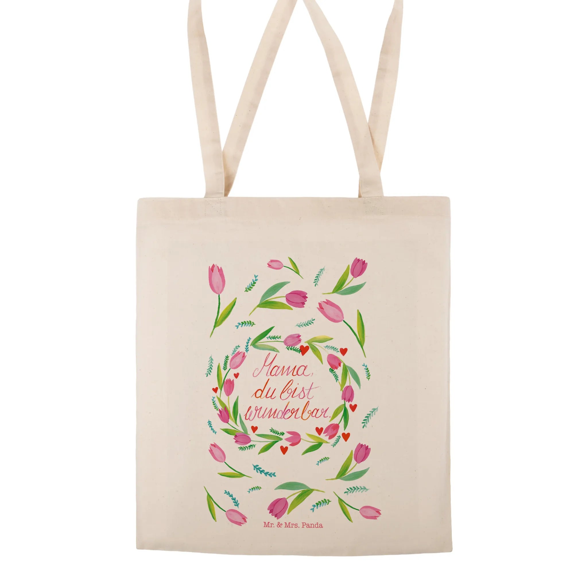 Die Tragetasche Mama Tulpen aus der Wild & Free Kollektion von Mr. & Mrs. Panda ist der perfekte Begleiter für jede Mama! Sie ist nicht nur hübsch, sondern auch äußerst praktisch. Hergestellt aus hochwertiger, naturbelassener Öko-Baumwolle, ist diese umweltfreundliche Tasche bei 140g/m² besonders leicht und doch robust.