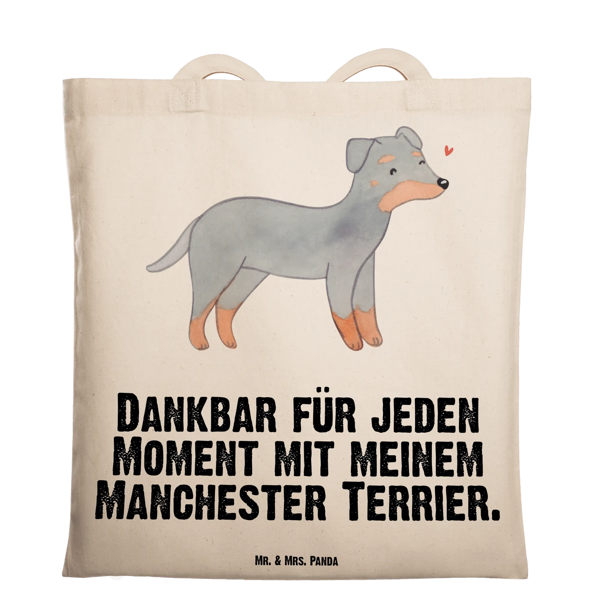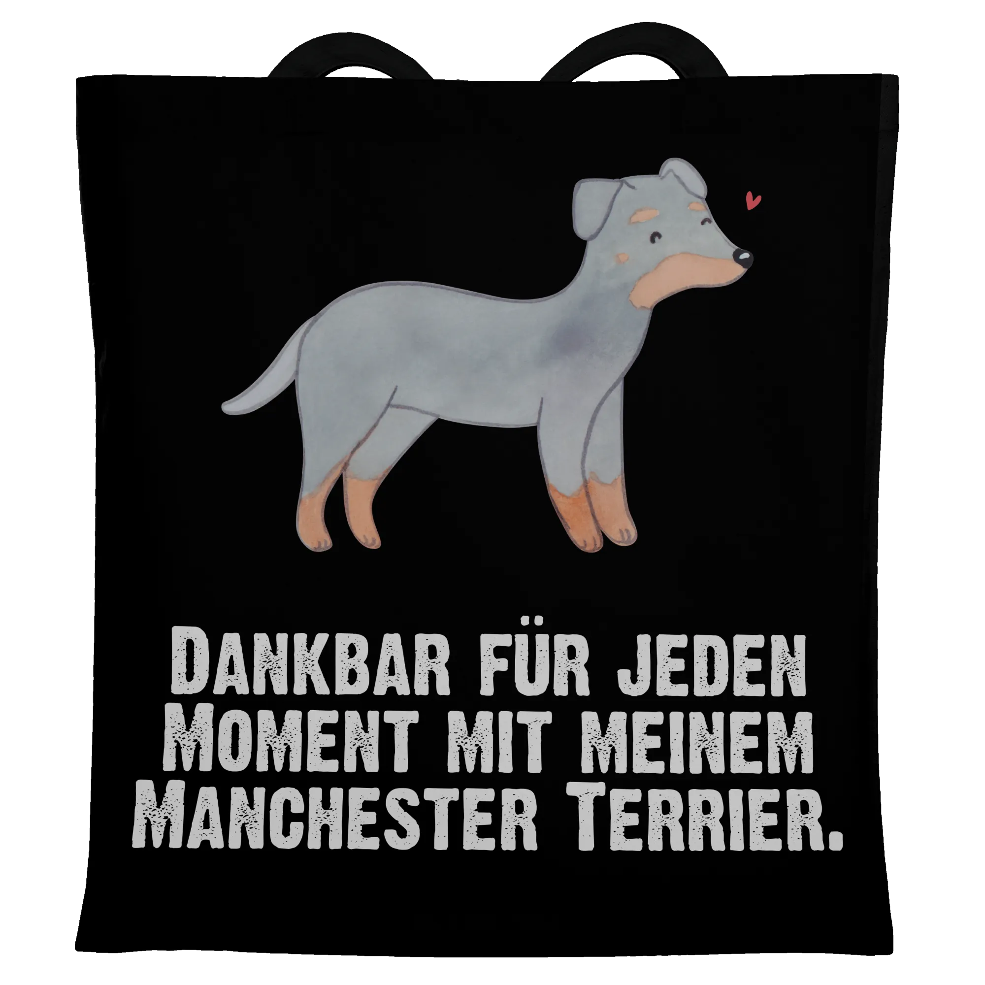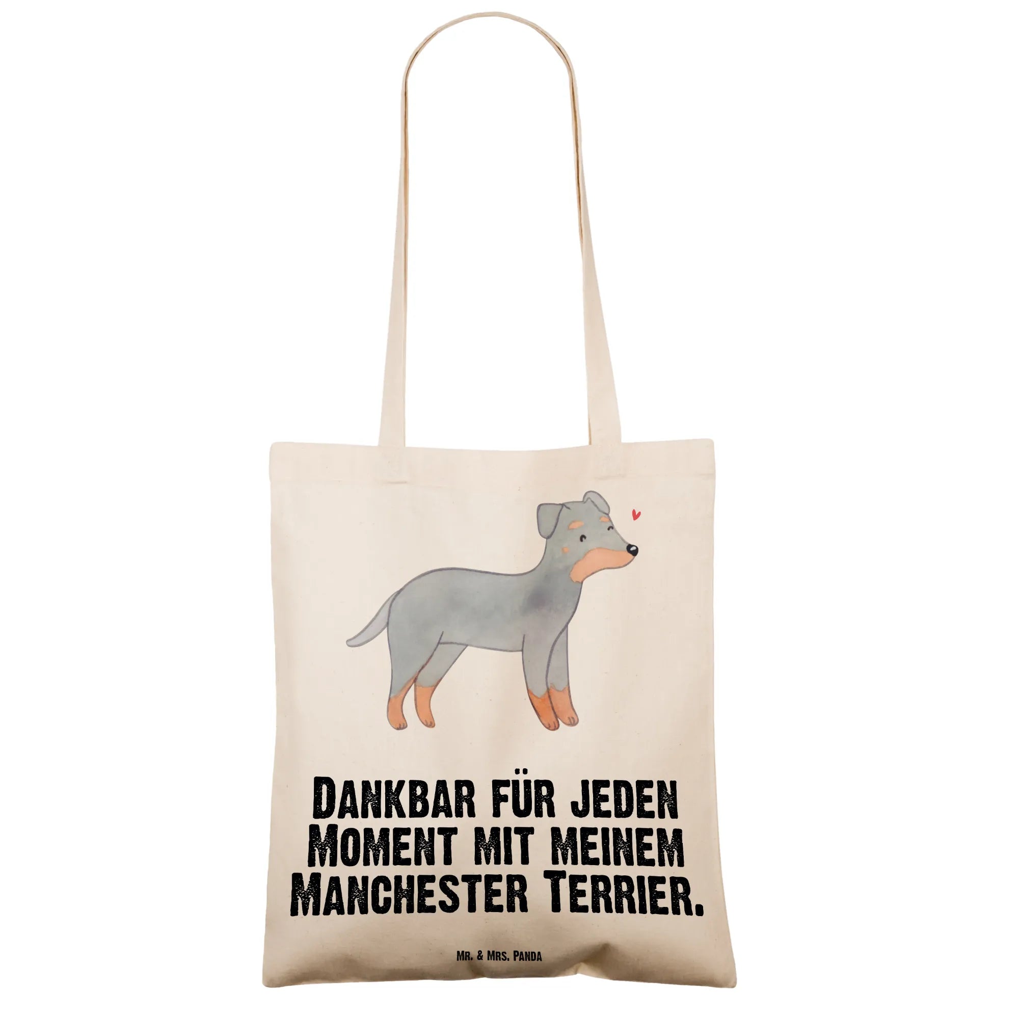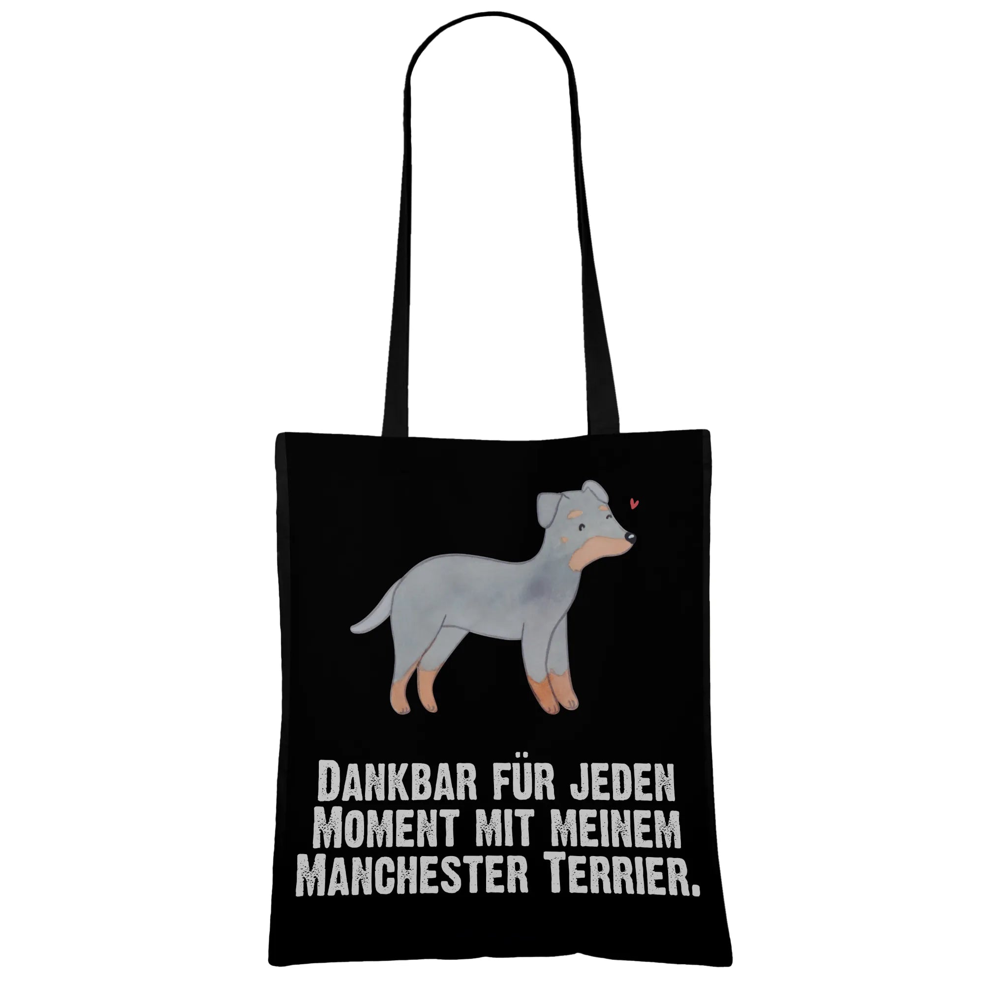 Suchst Du ein Geschenk, das täglich Freude macht? Unsere bedruckte Tragetasche mit dem liebevollen Manchester Terrier Motiv und dem Spruch „Dankbar für jeden Moment mit meinem Manchester Terrier.“ ist genau richtig. Die handgezeichnete Aquarell-Illustration fängt den wachsamen, freundlichen Ausdruck dieses eleganten Hundes wunderbar ein.