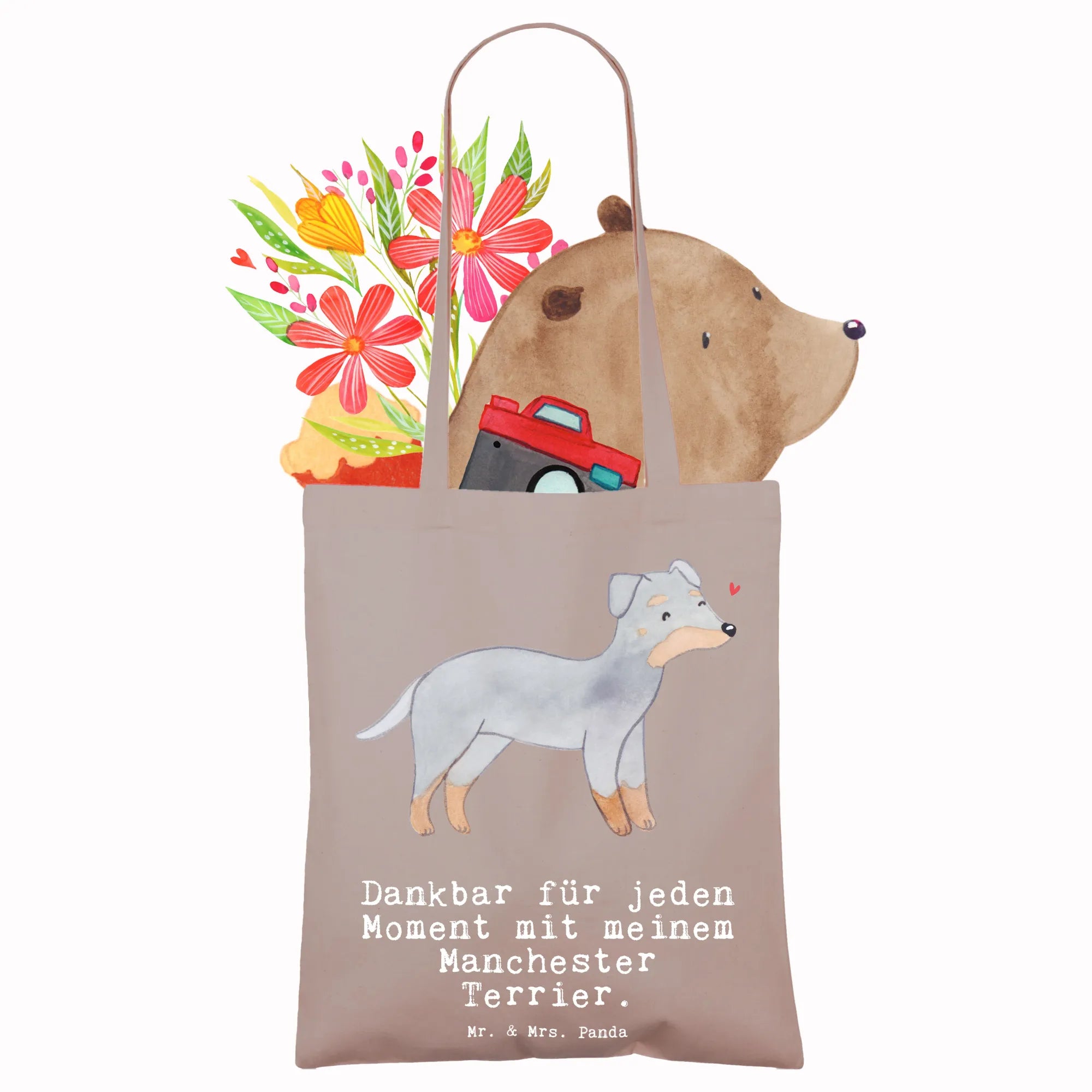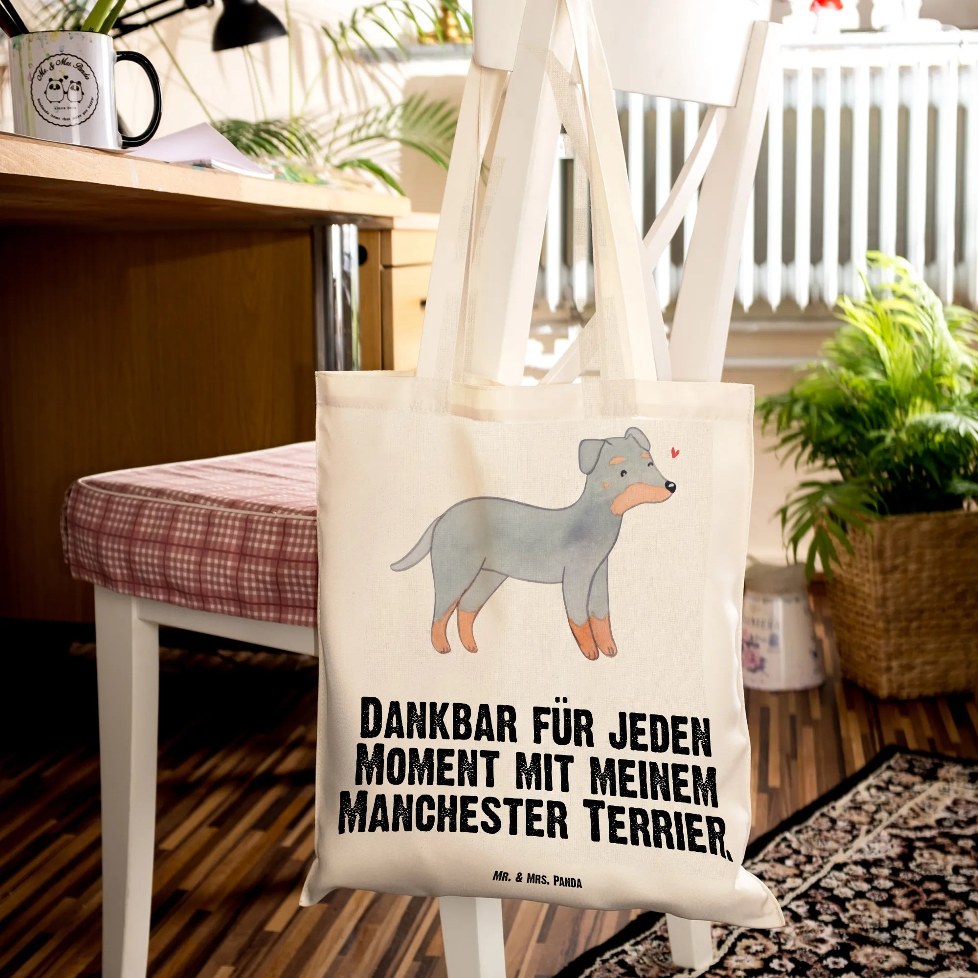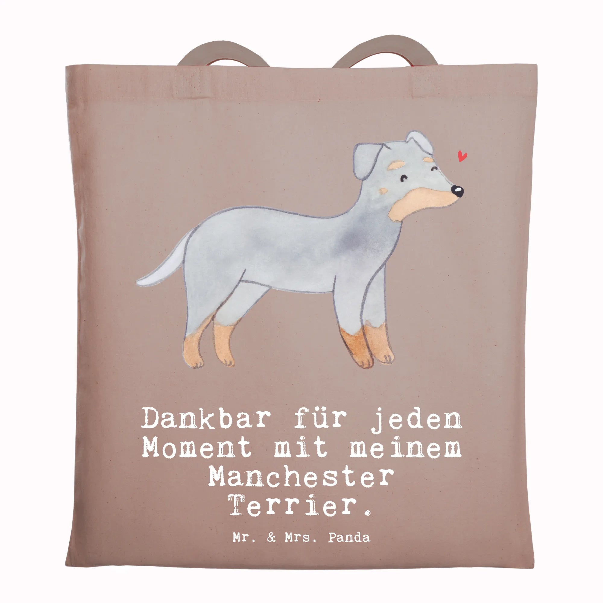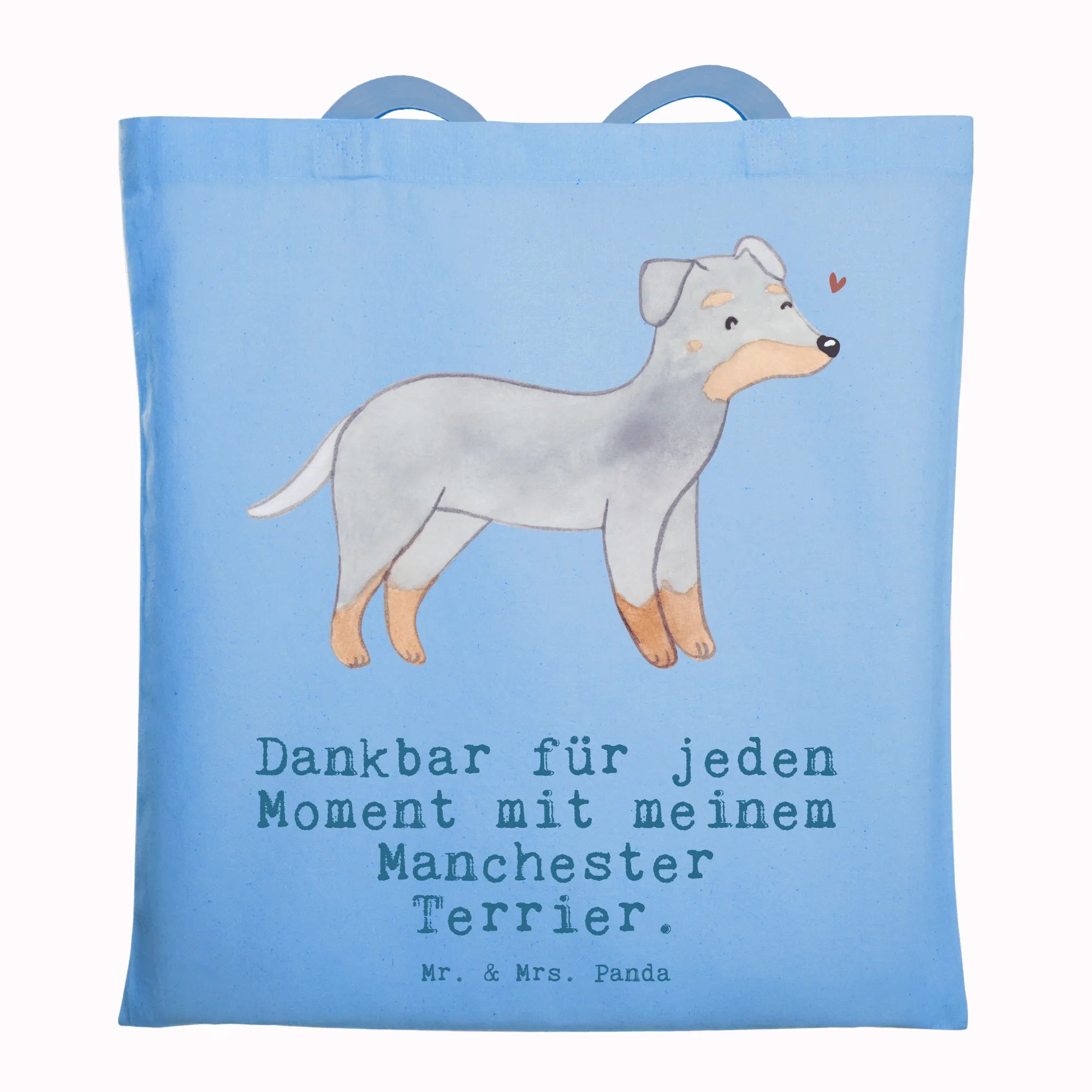 Suchst Du ein Geschenk, das täglich Freude macht? Unsere bedruckte Tragetasche mit dem liebevollen Manchester Terrier Motiv und dem Spruch „Dankbar für jeden Moment mit meinem Manchester Terrier.“ ist genau richtig. Die handgezeichnete Aquarell-Illustration fängt den wachsamen, freundlichen Ausdruck dieses eleganten Hundes wunderbar ein.