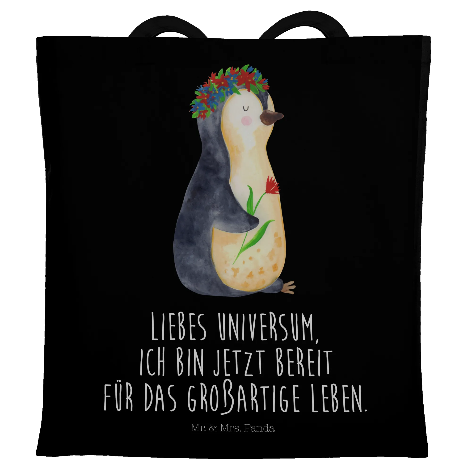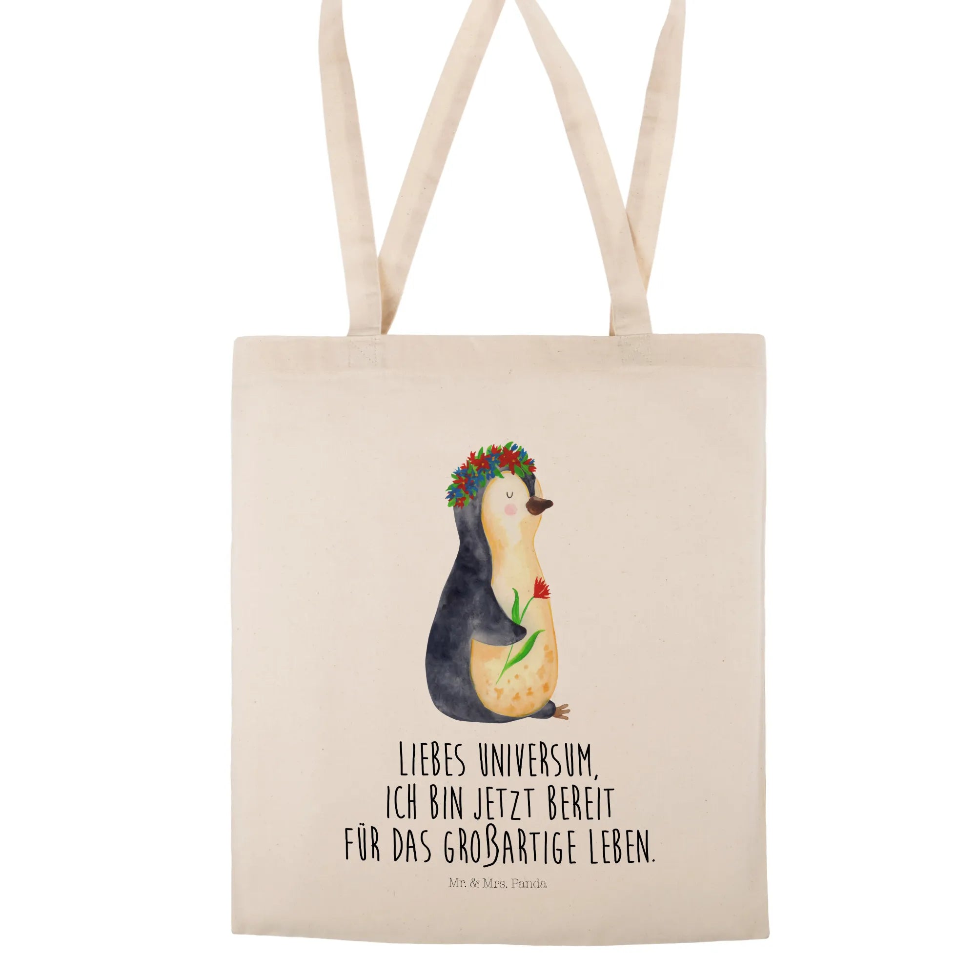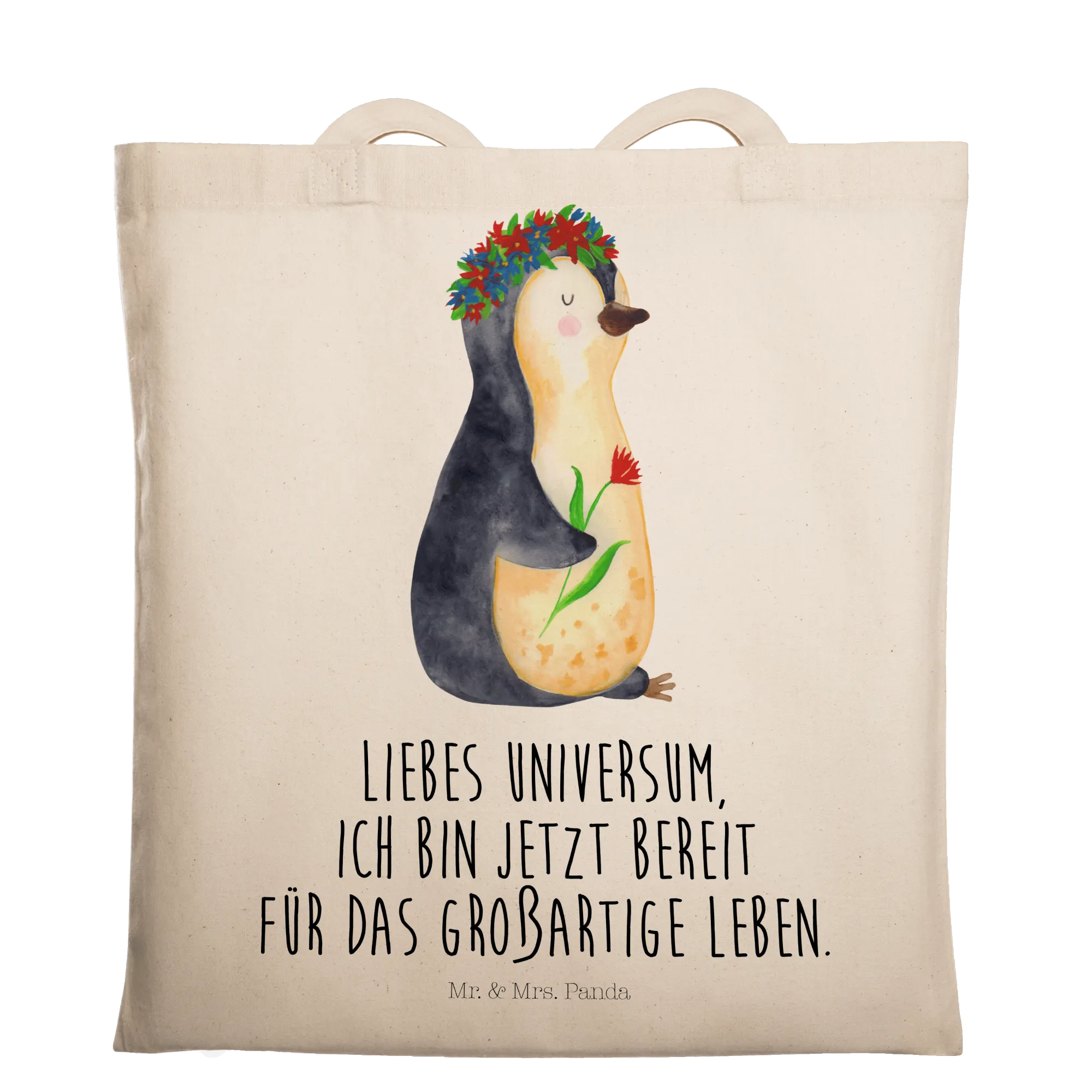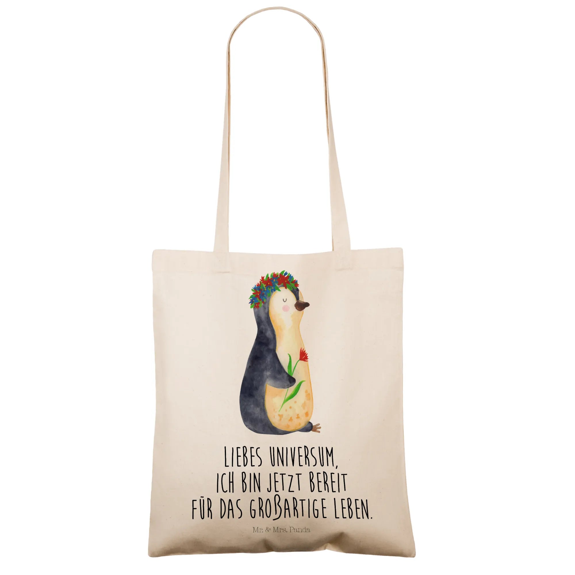 Mit einem süßen Pinguin, der einen Blumenkranz trägt und dabei lächelt, zaubert diese Tragetasche jedem ein Lächeln ins Gesicht. Der liebevolle Slogan „Liebes Universum, ich bin jetzt bereit für das großartige Leben.“ inspiriert und motiviert dich, jeden Tag dein Beste zu geben. Diese Botschaft wird nicht nur dich, sondern auch deine Mitmenschen erfreuen und motivieren.