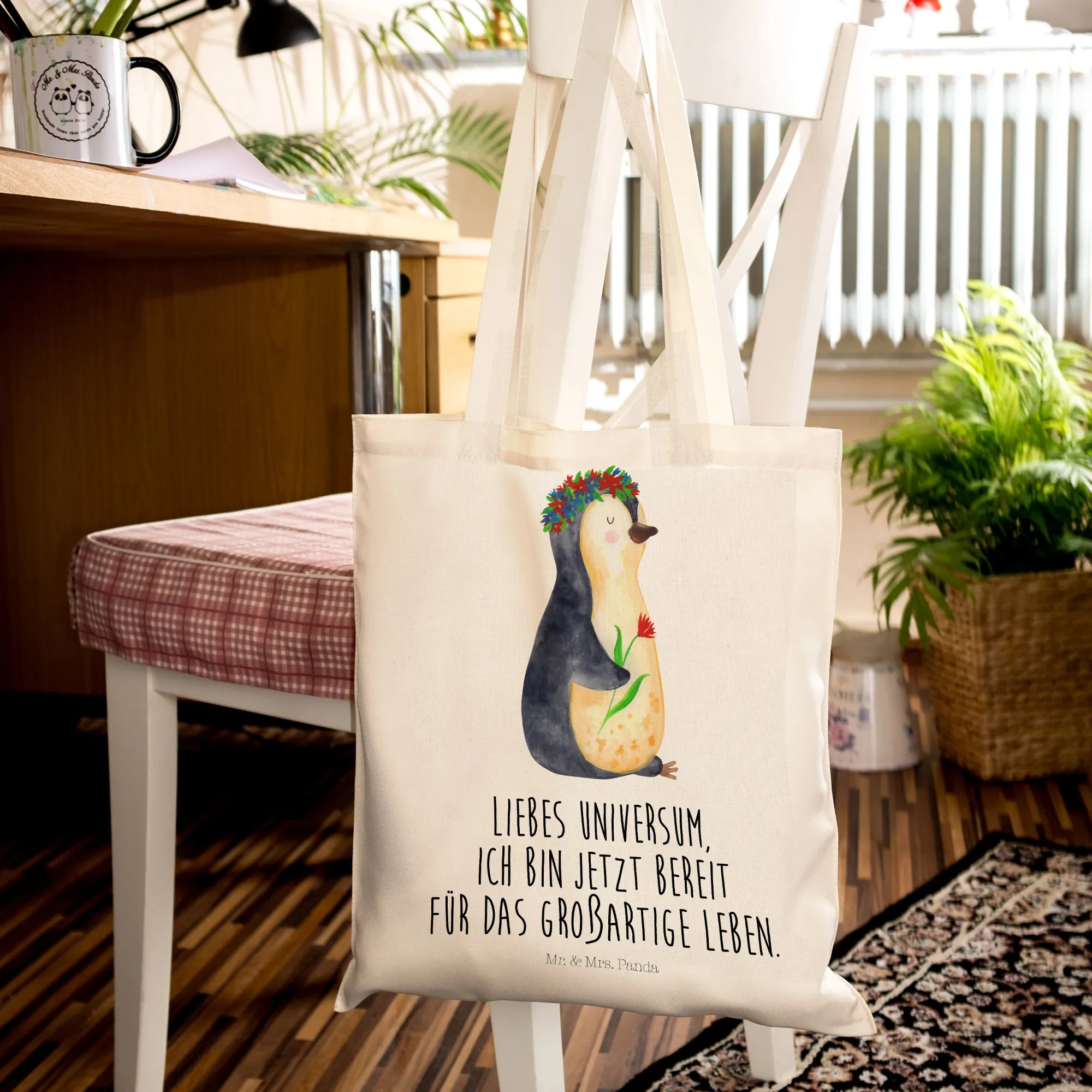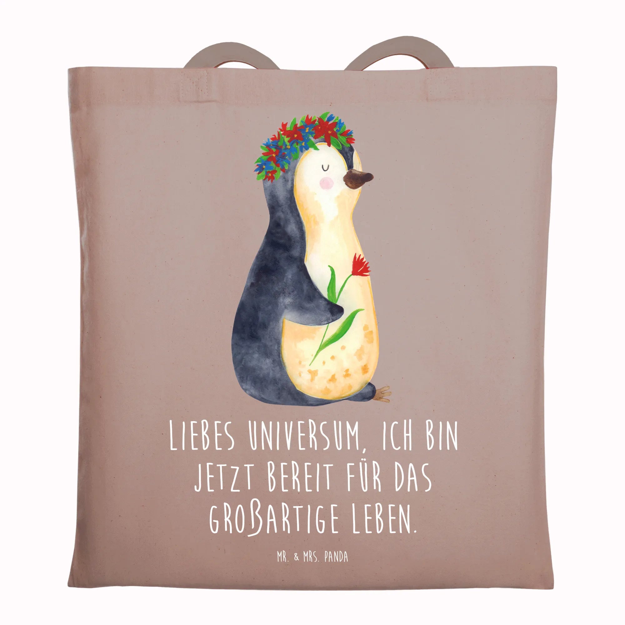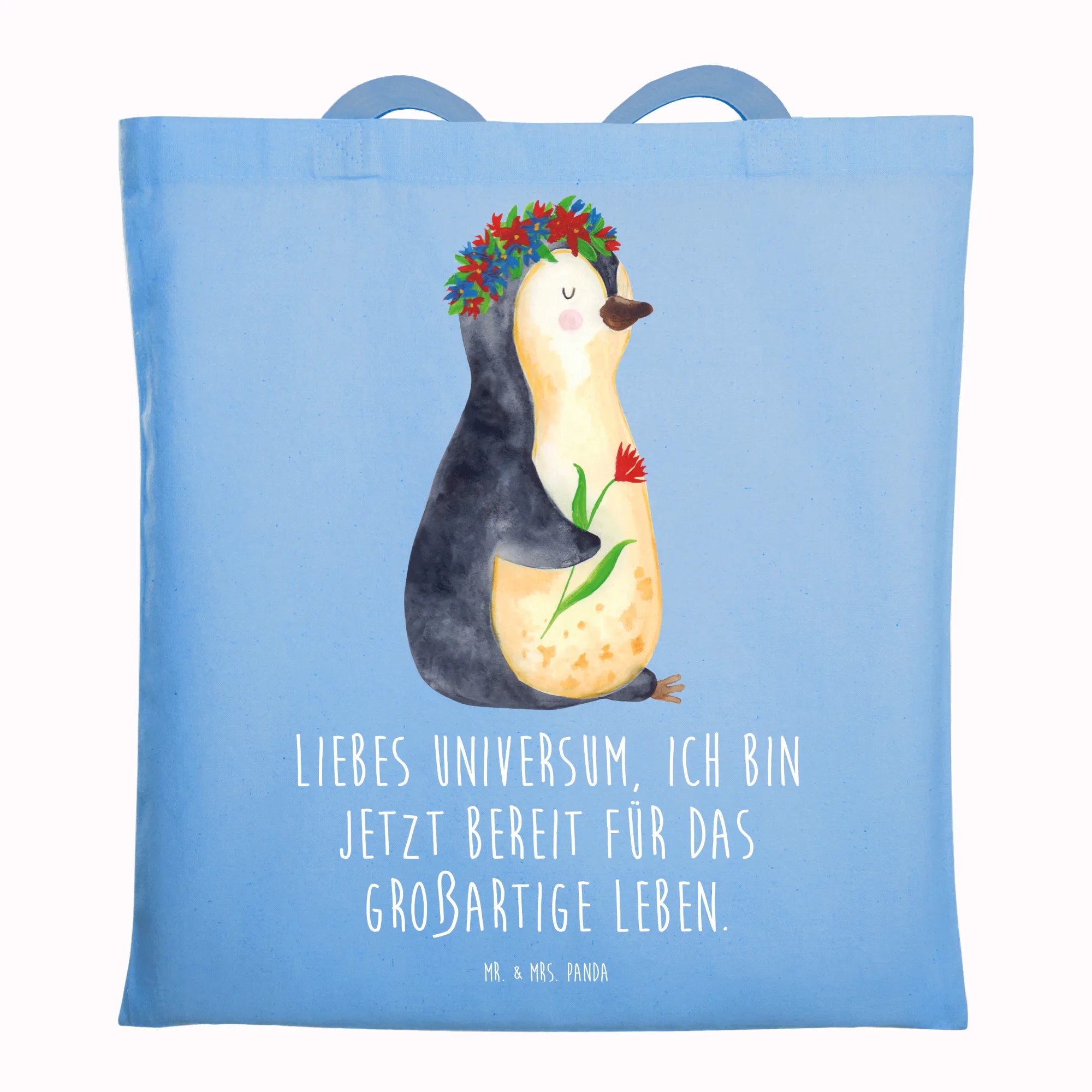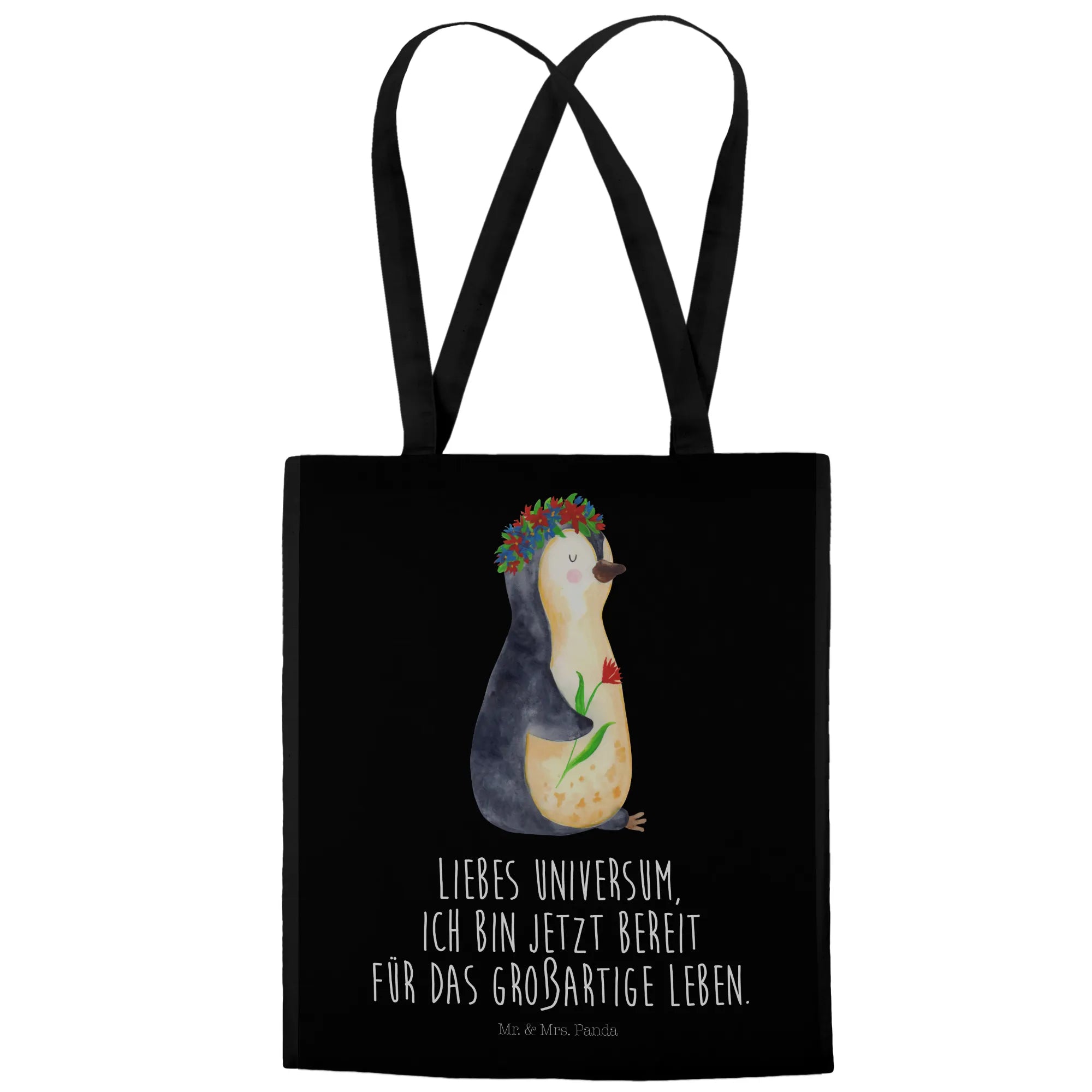 Mit einem süßen Pinguin, der einen Blumenkranz trägt und dabei lächelt, zaubert diese Tragetasche jedem ein Lächeln ins Gesicht. Der liebevolle Slogan „Liebes Universum, ich bin jetzt bereit für das großartige Leben.“ inspiriert und motiviert dich, jeden Tag dein Beste zu geben. Diese Botschaft wird nicht nur dich, sondern auch deine Mitmenschen erfreuen und motivieren.