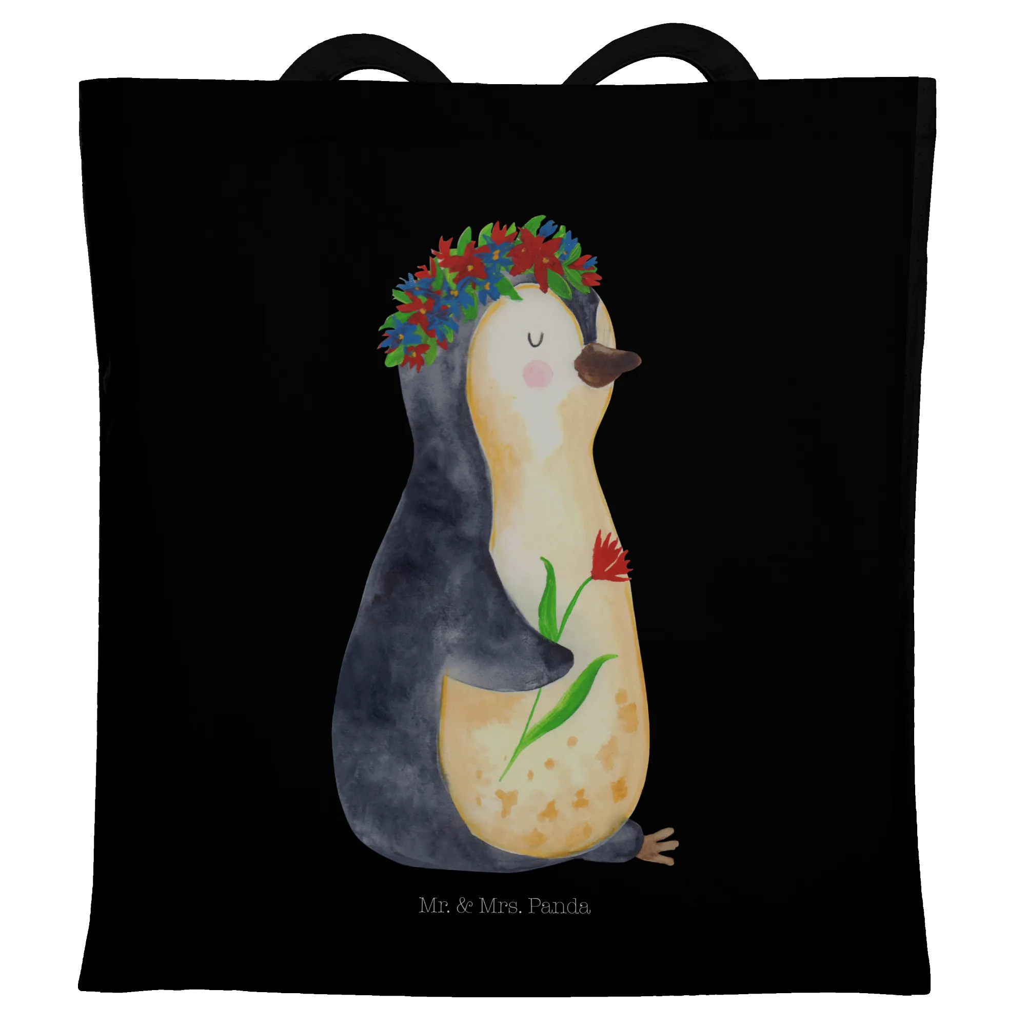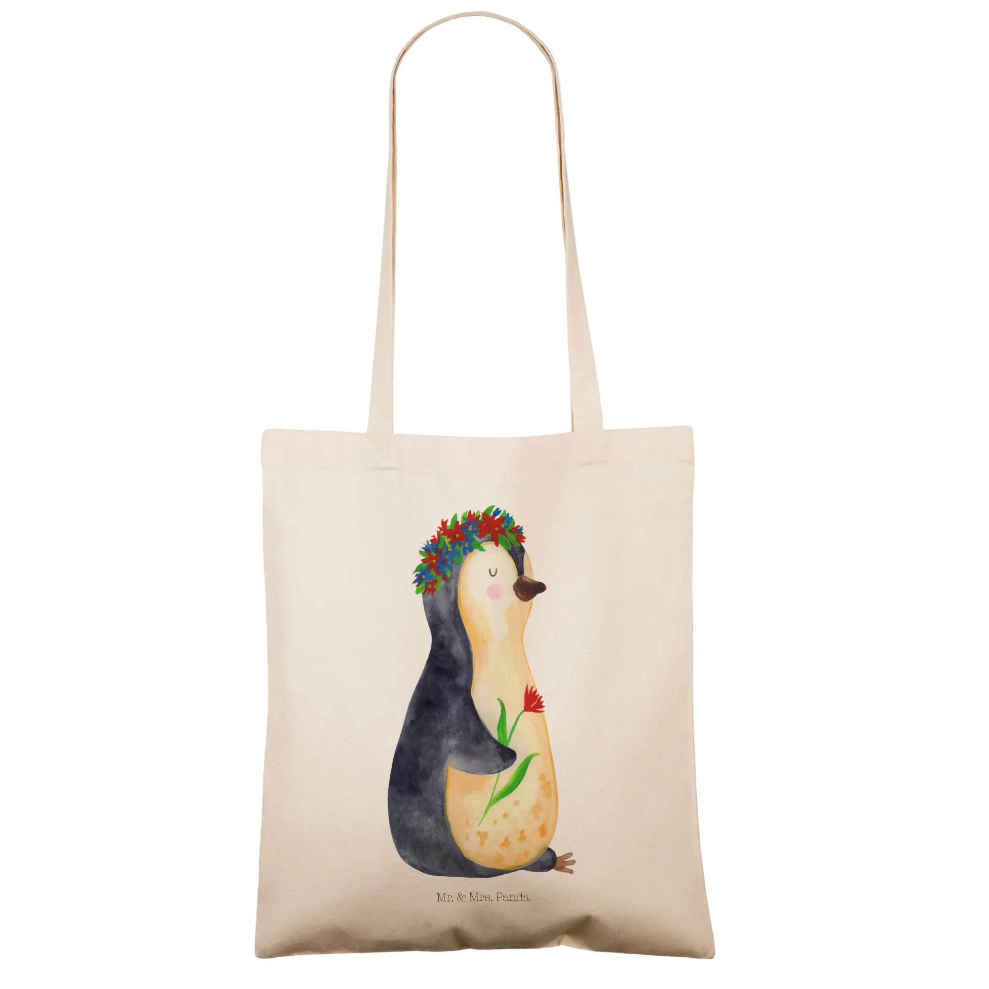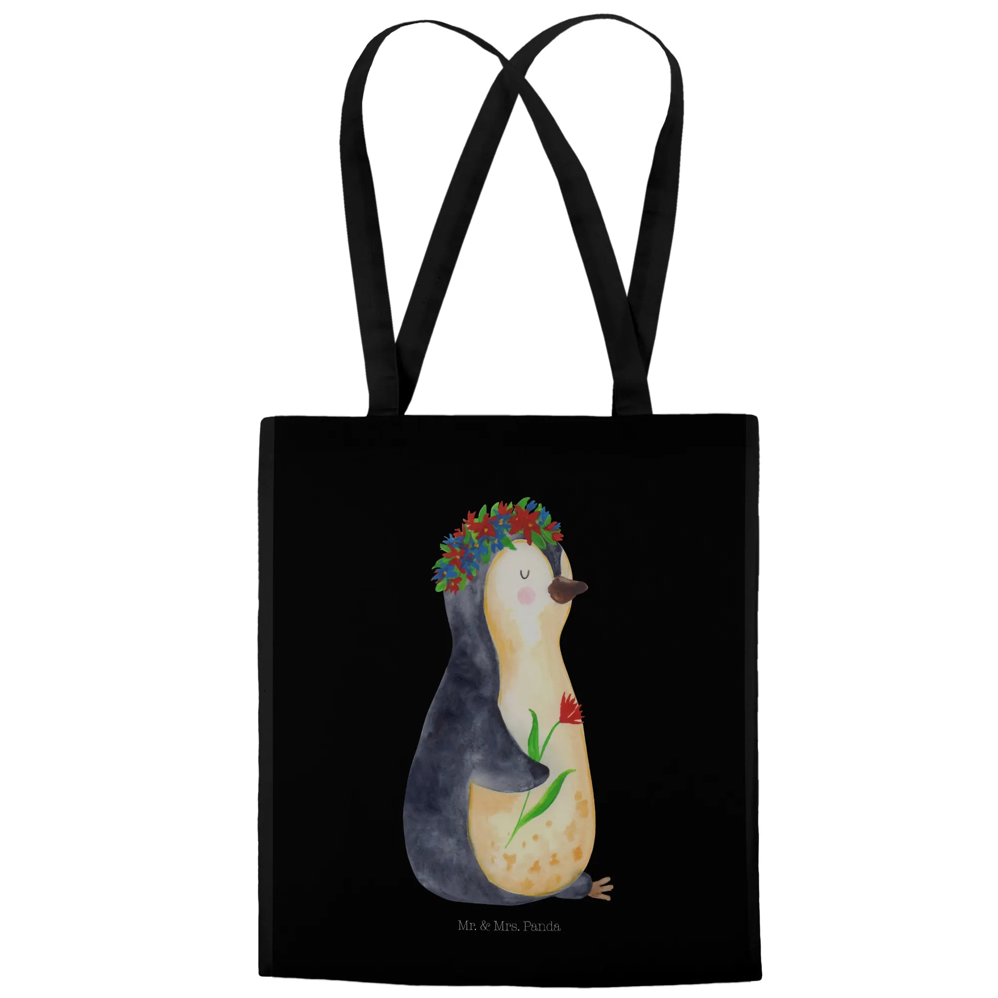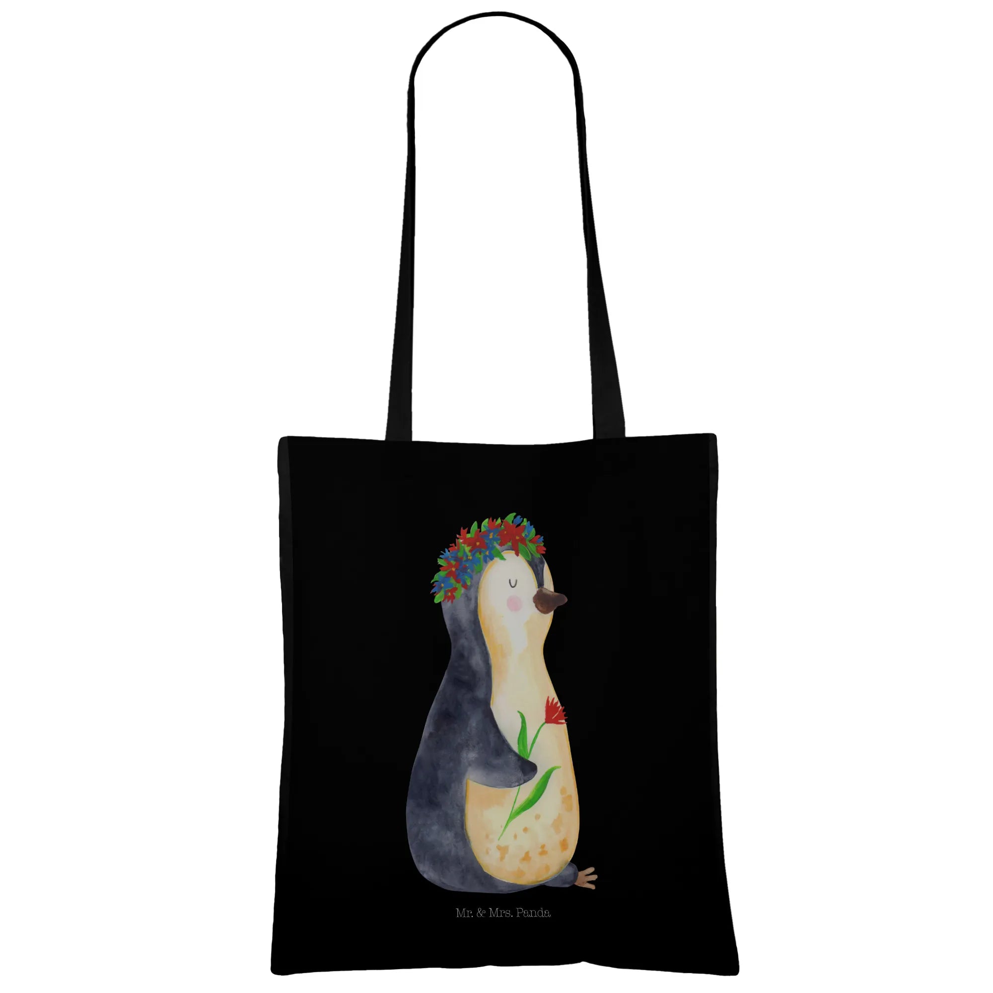 Entdecke die zauberhafte Tragetasche mit dem süßen Pinguin Blumenkranz von Mr. & Mrs. Panda!