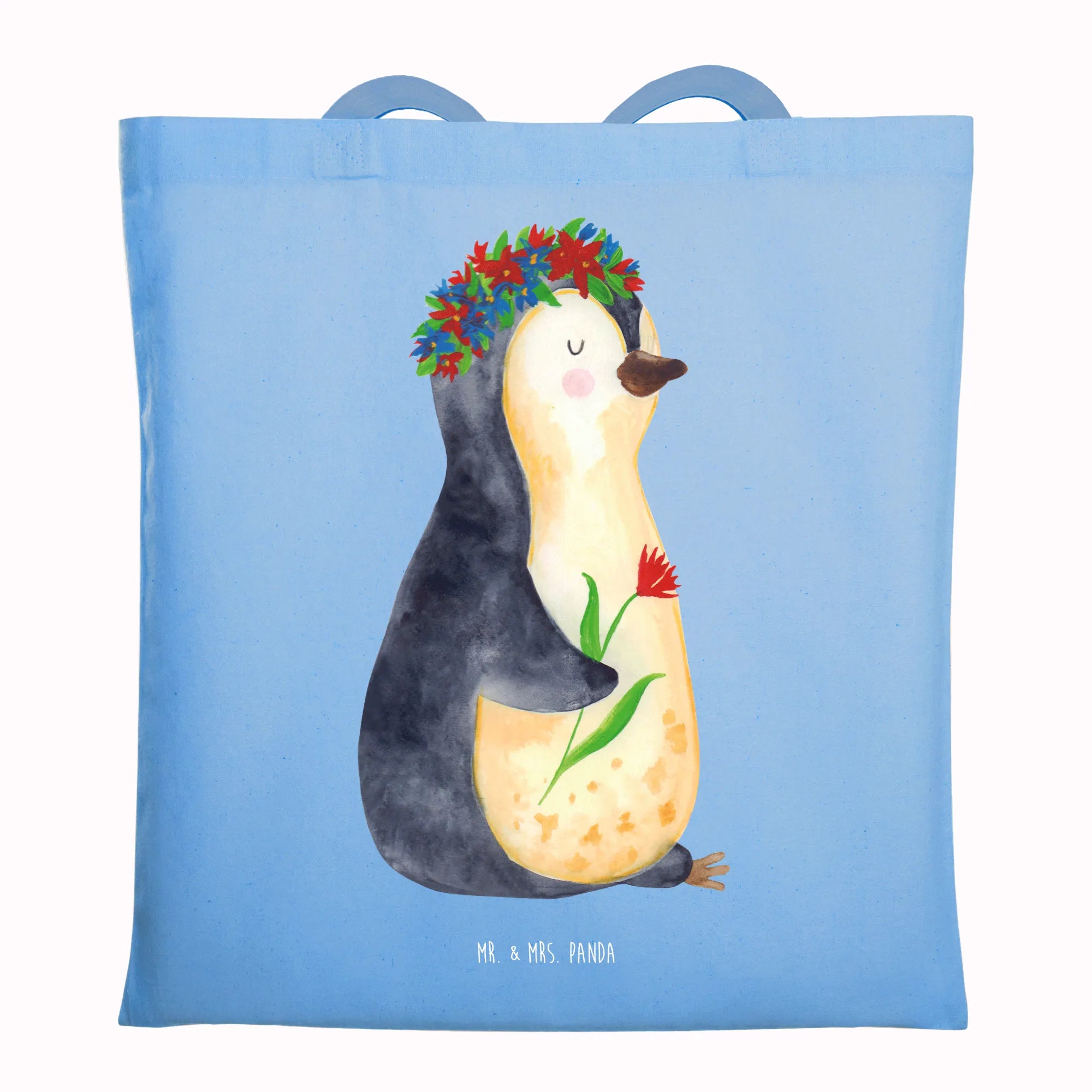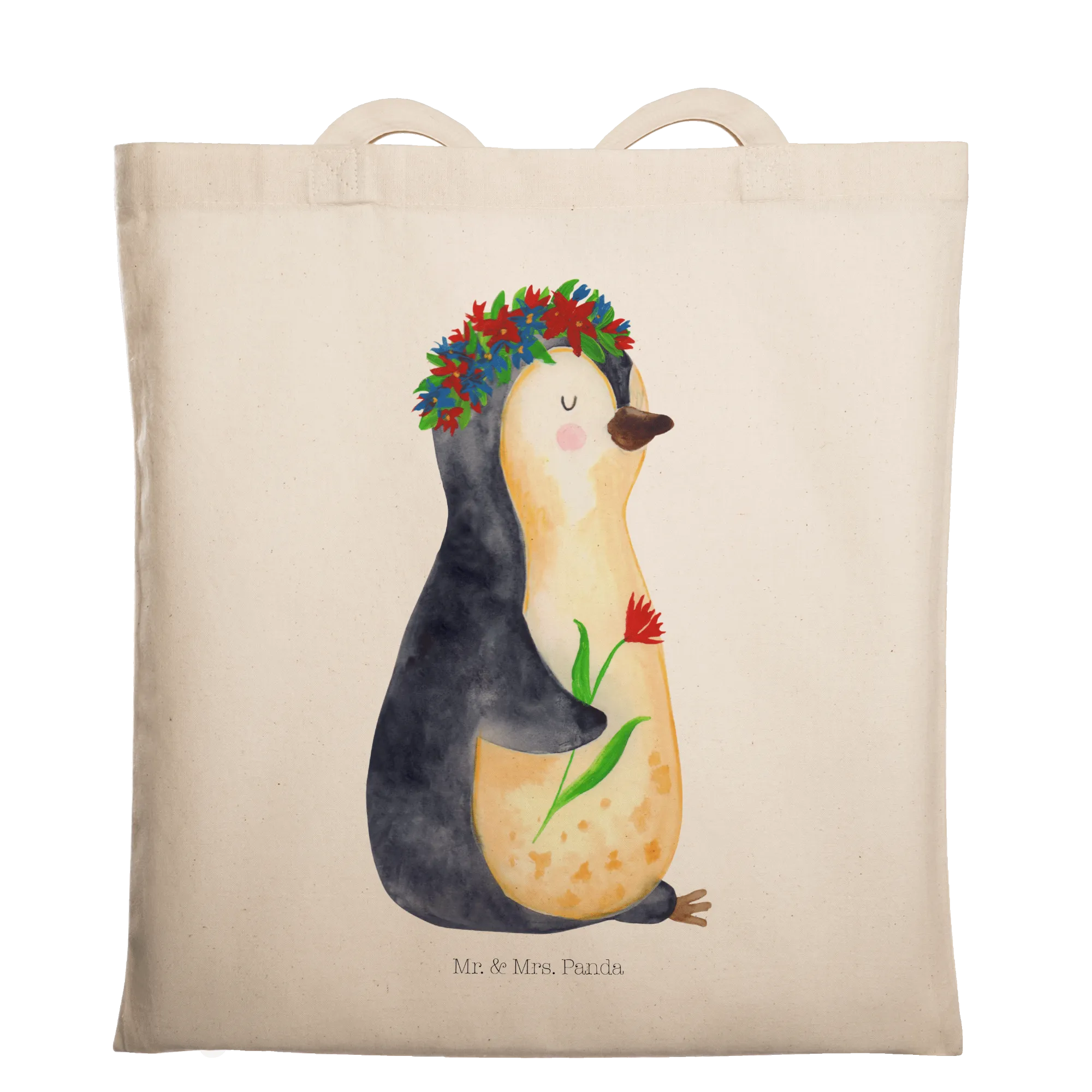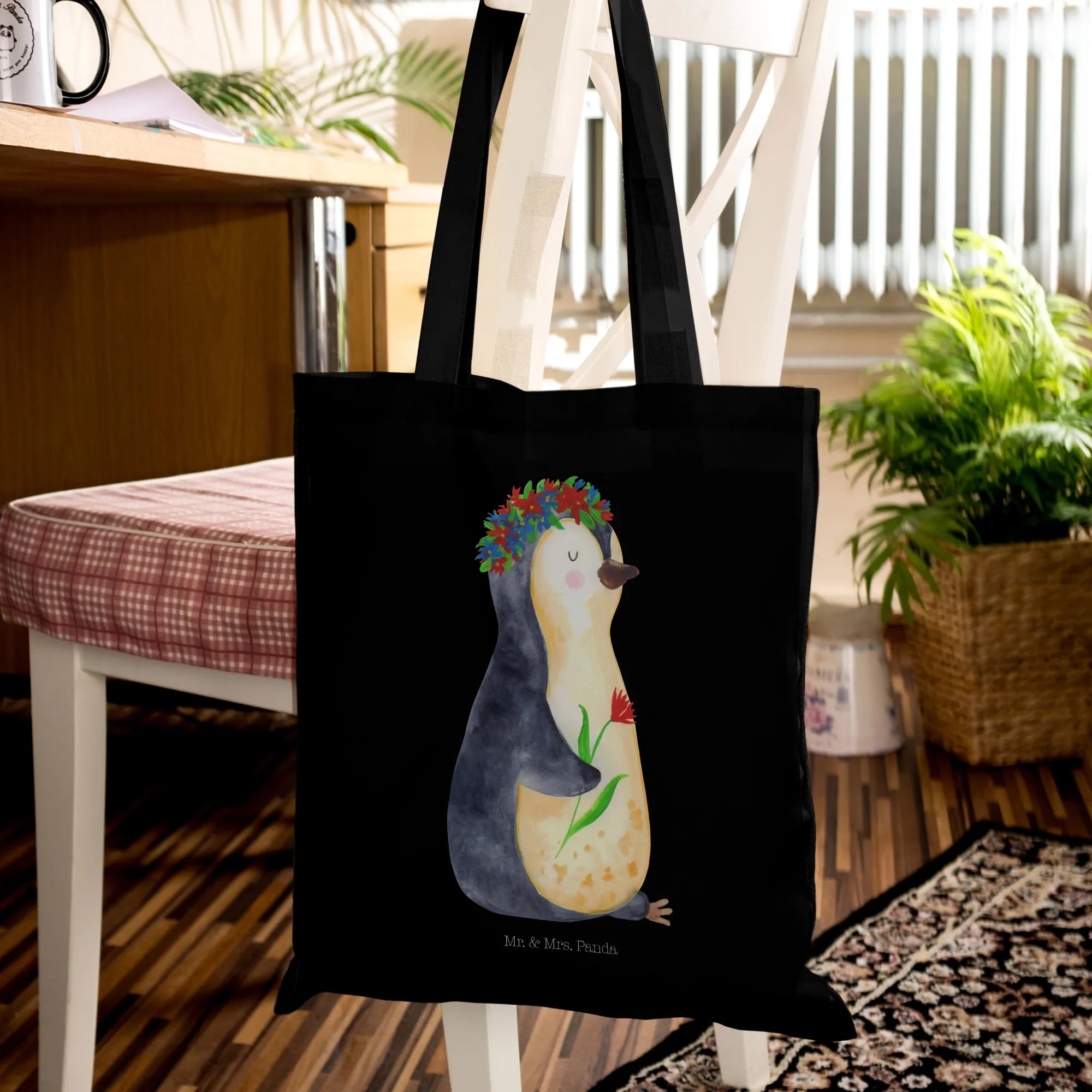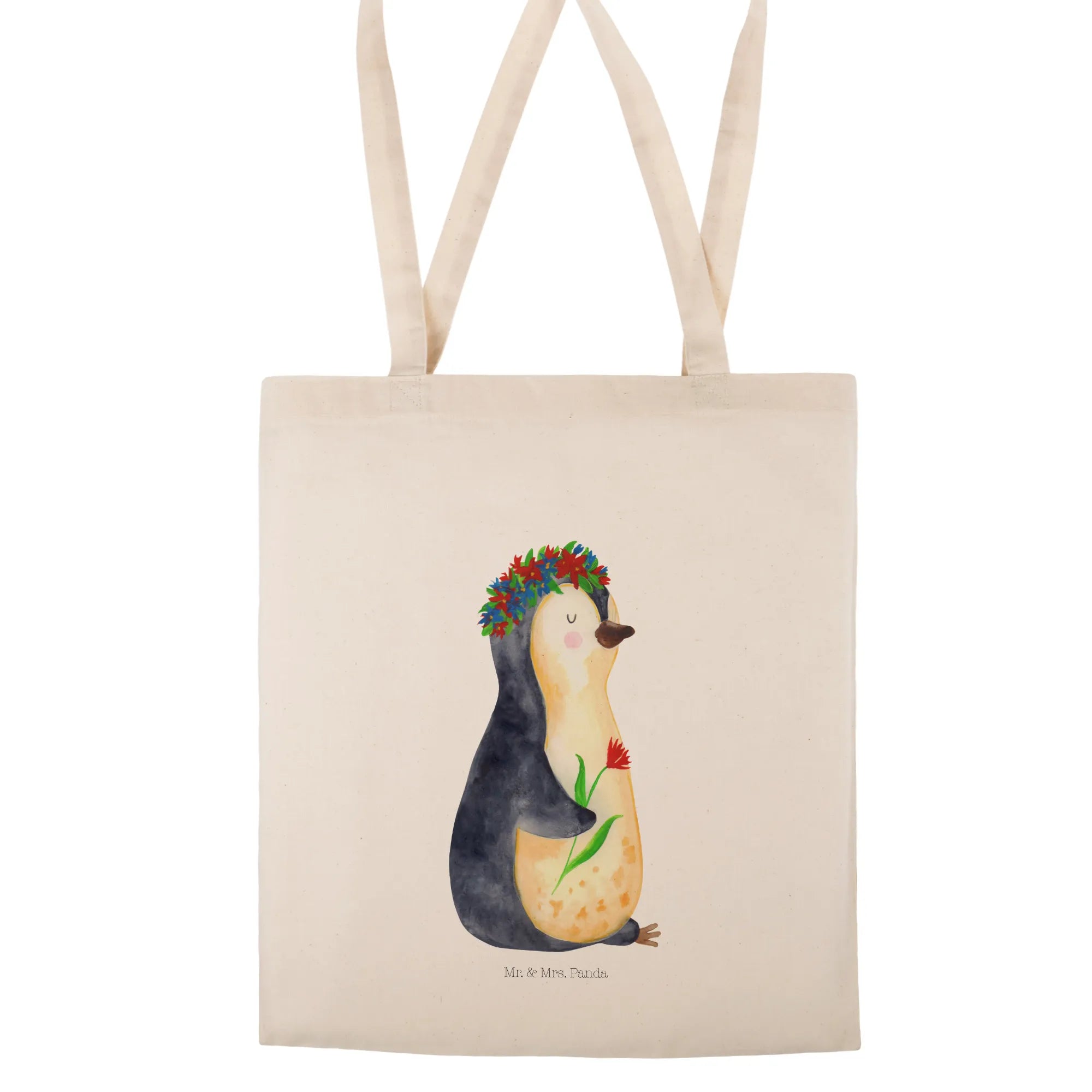 Entdecke die zauberhafte Tragetasche mit dem süßen Pinguin Blumenkranz von Mr. & Mrs. Panda!