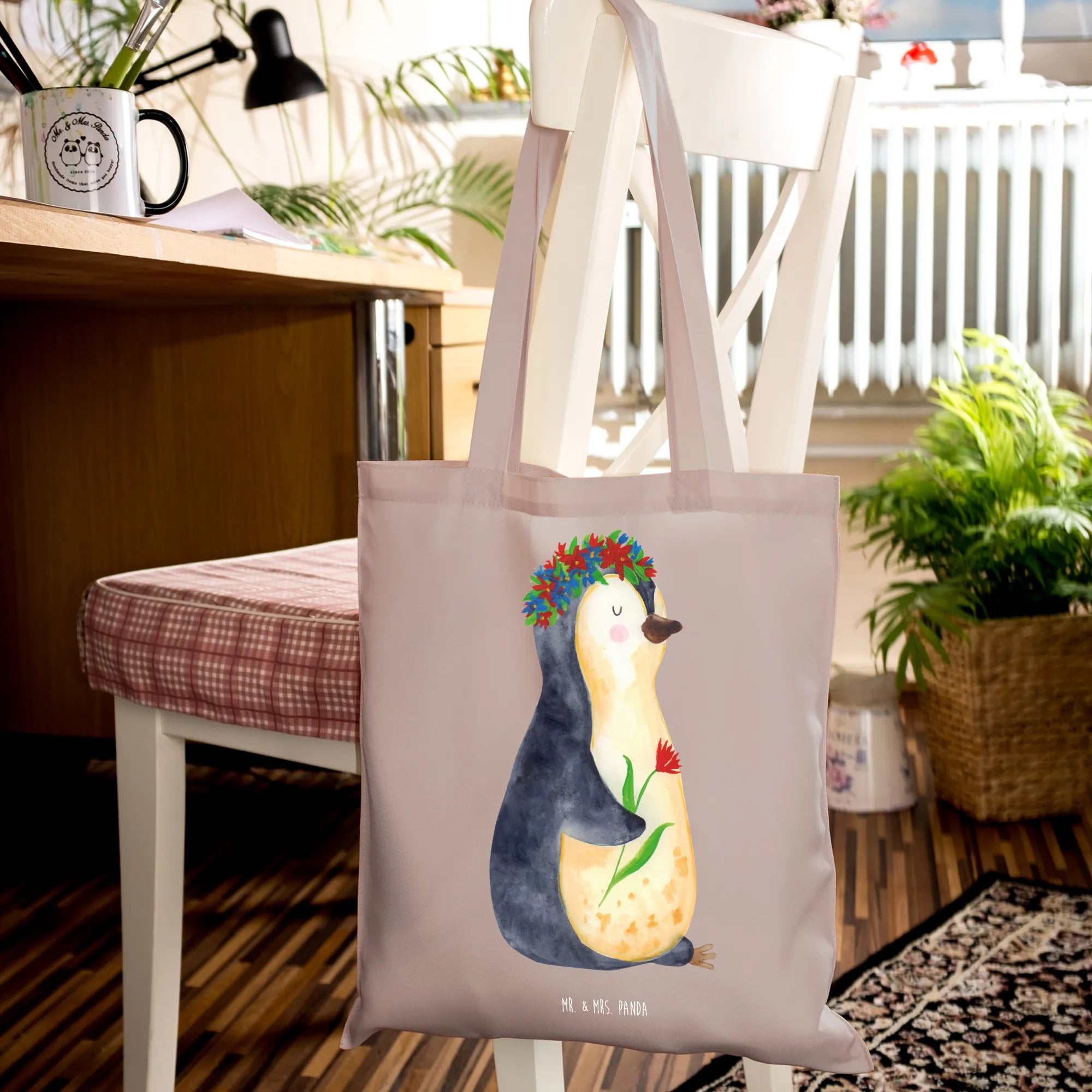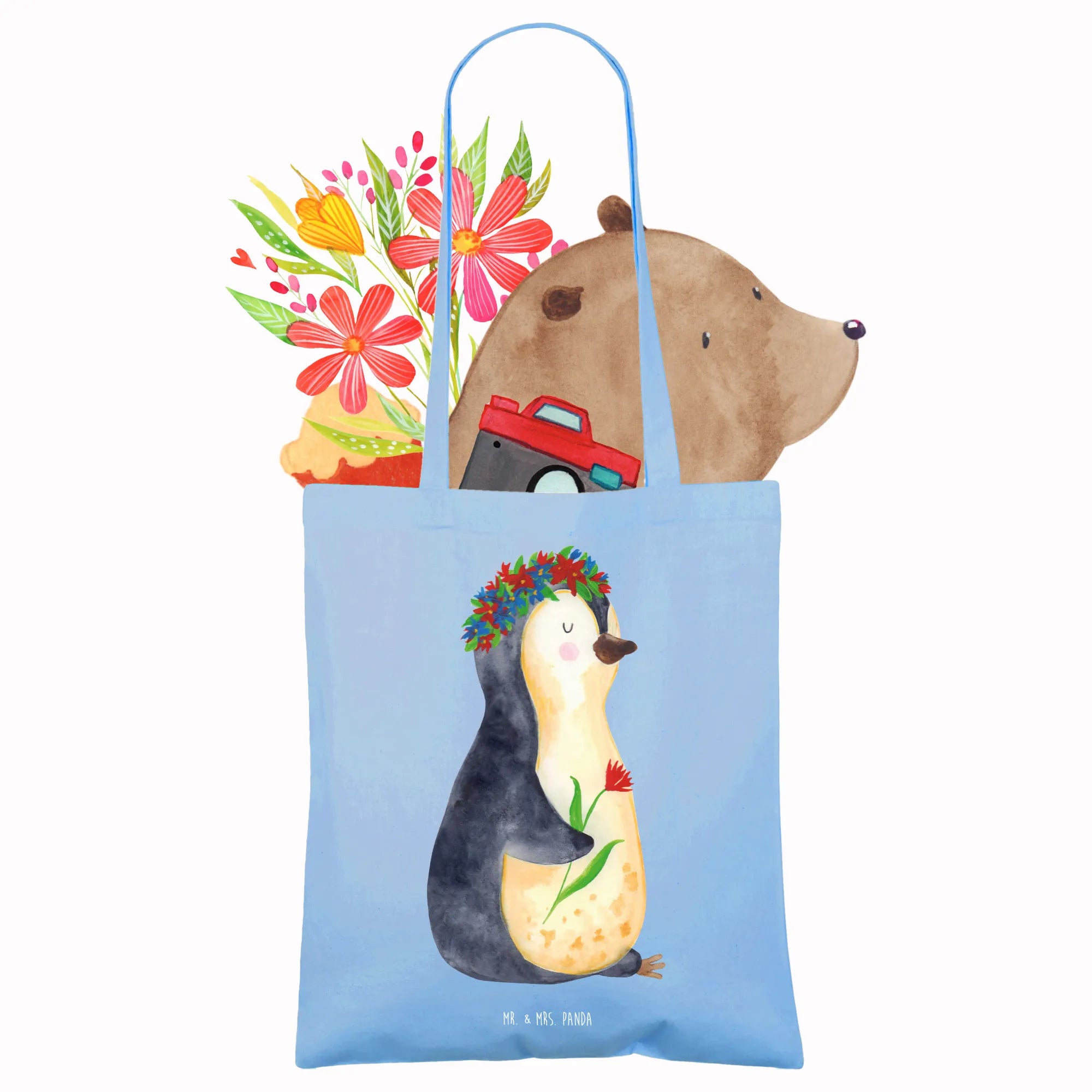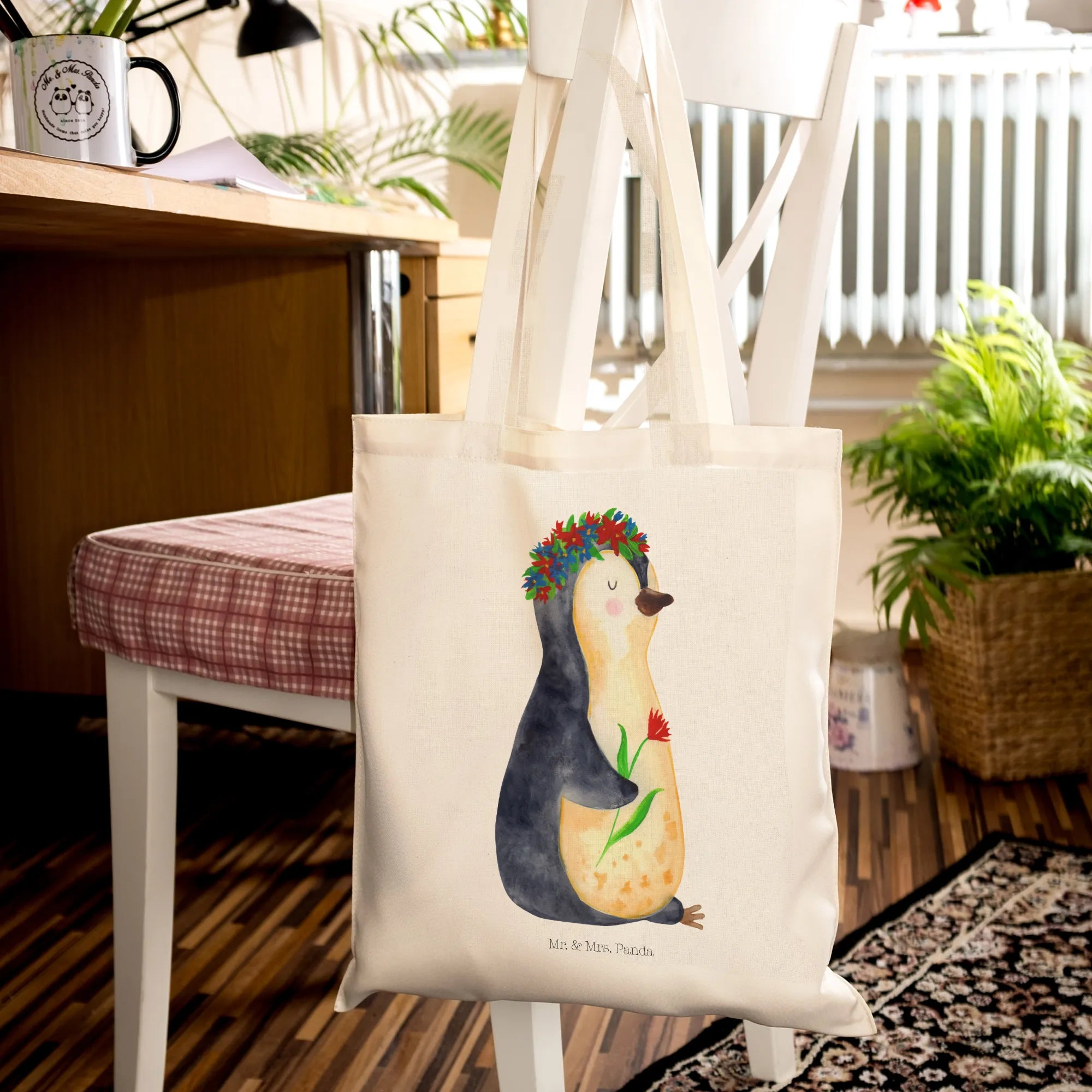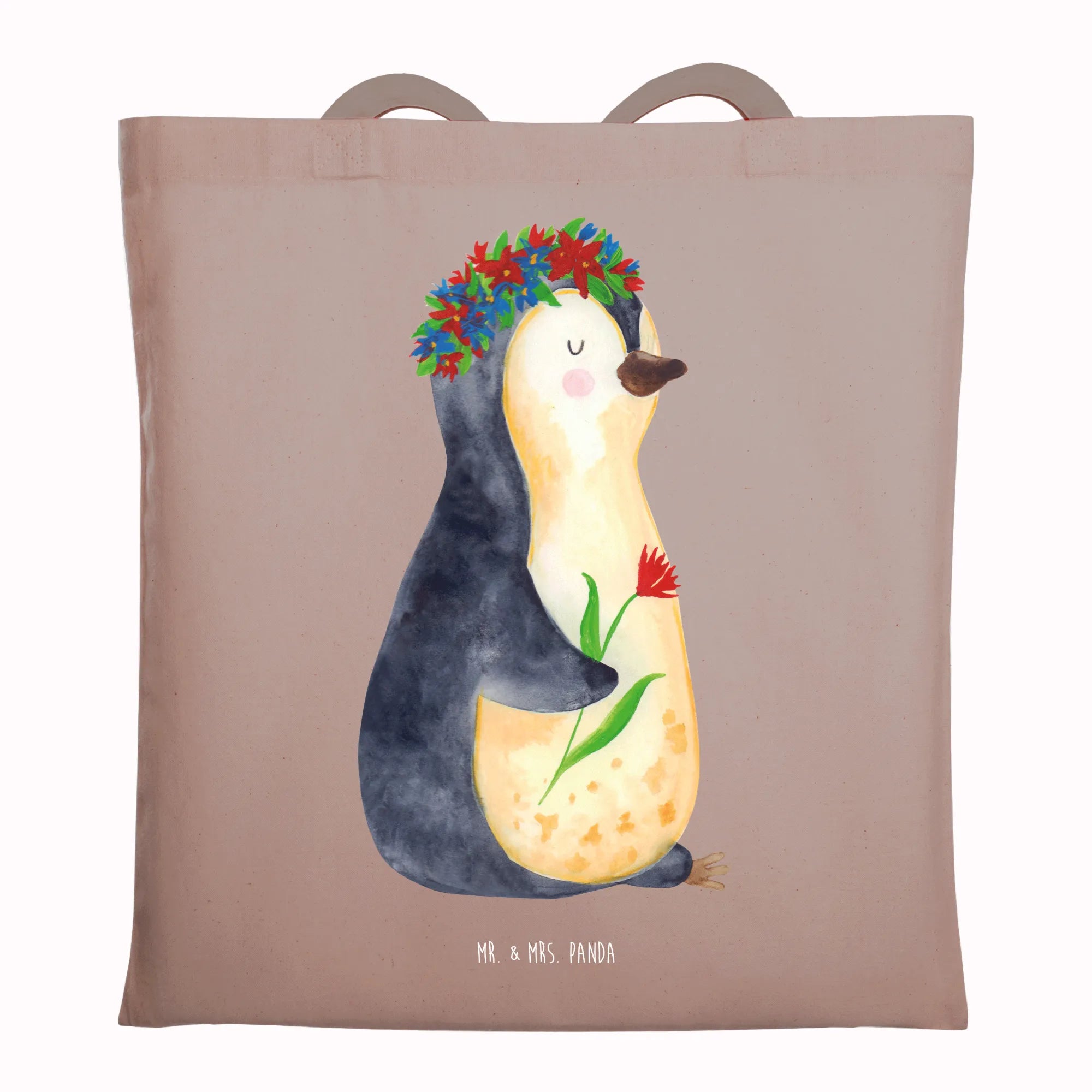 Entdecke die zauberhafte Tragetasche mit dem süßen Pinguin Blumenkranz von Mr. & Mrs. Panda!