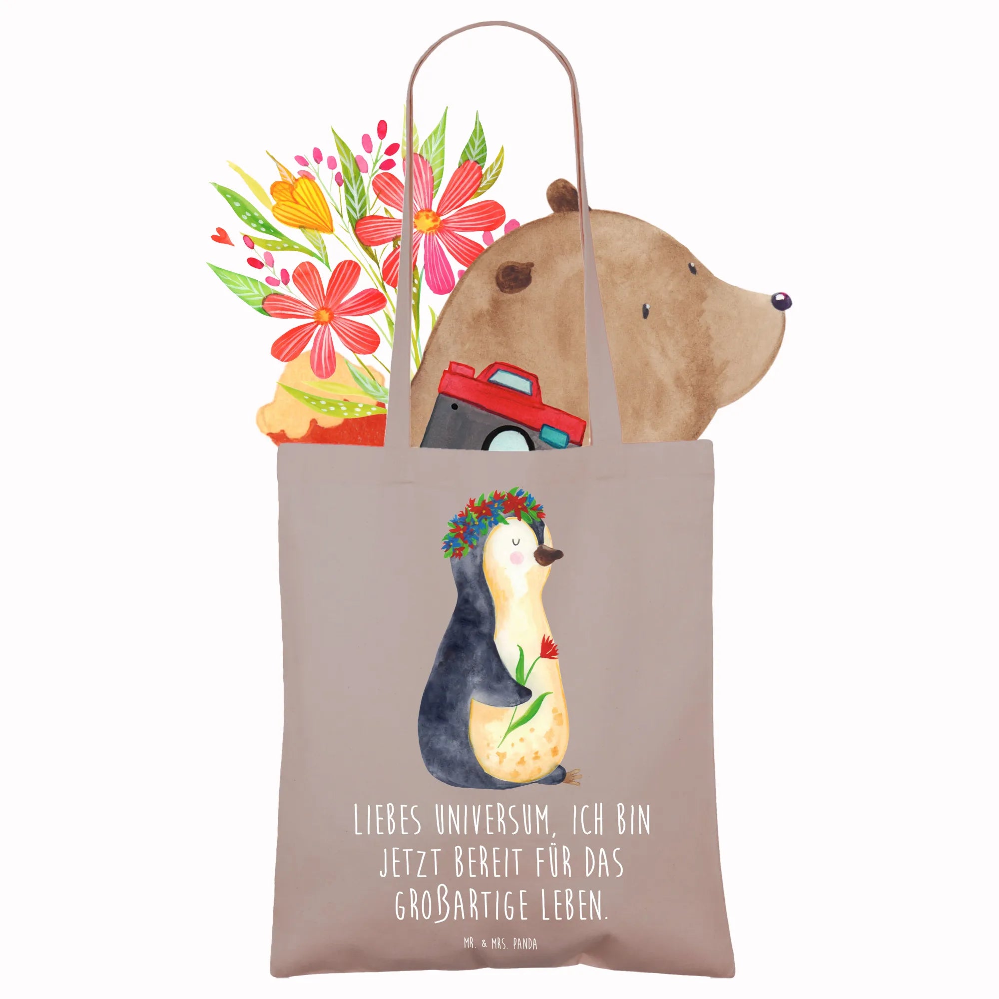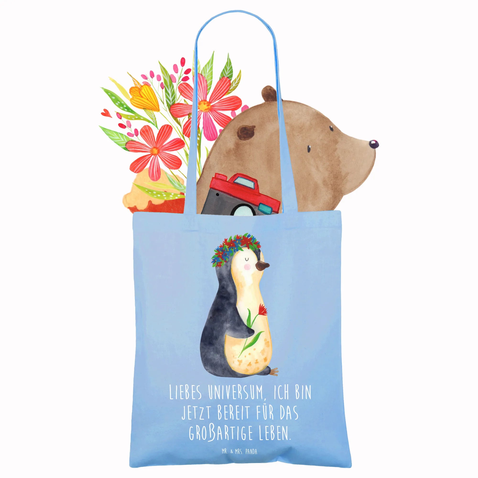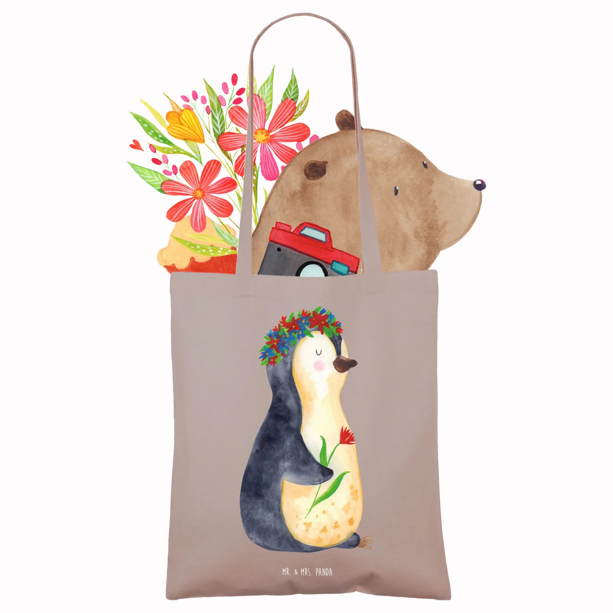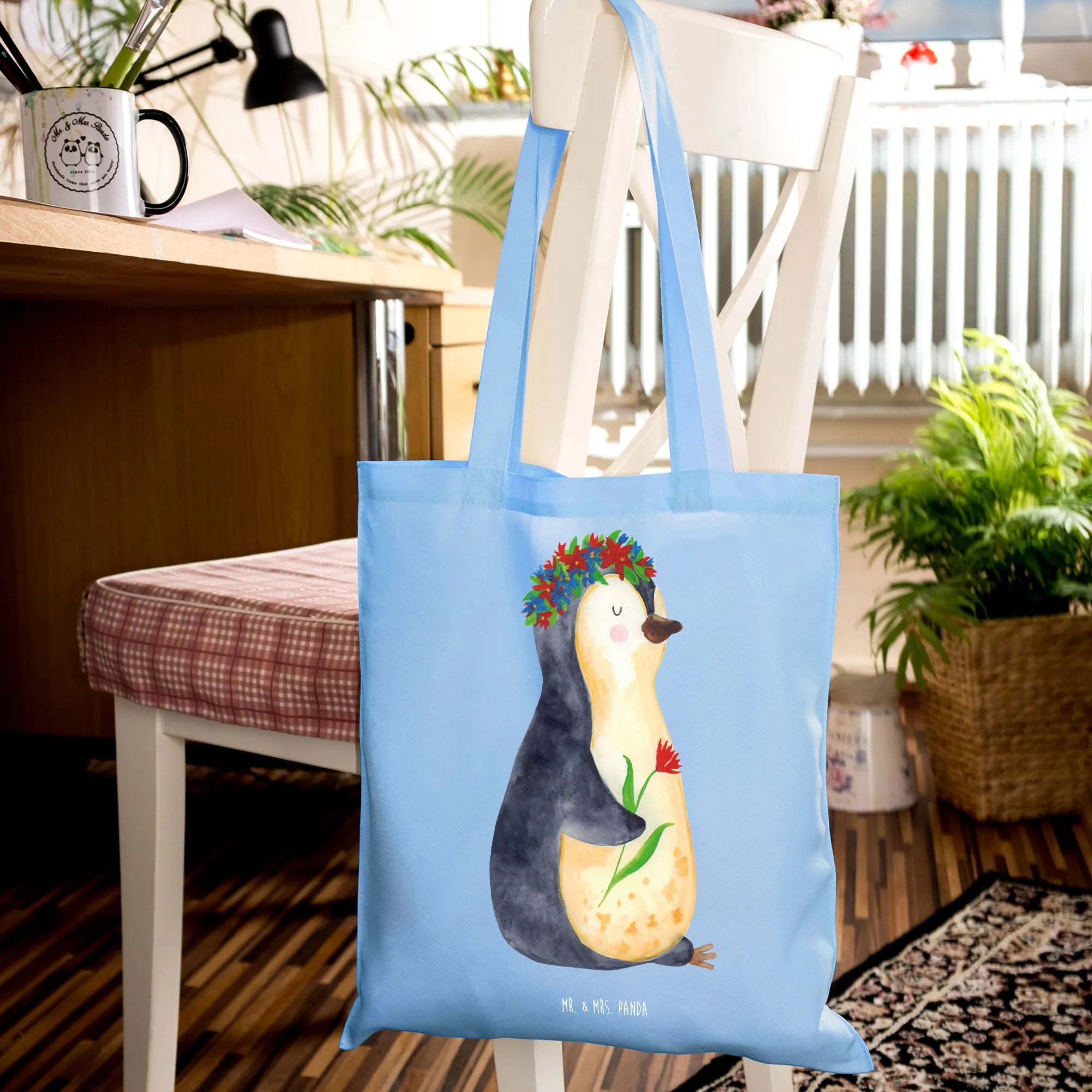 Entdecke die zauberhafte Tragetasche mit dem süßen Pinguin Blumenkranz von Mr. & Mrs. Panda!