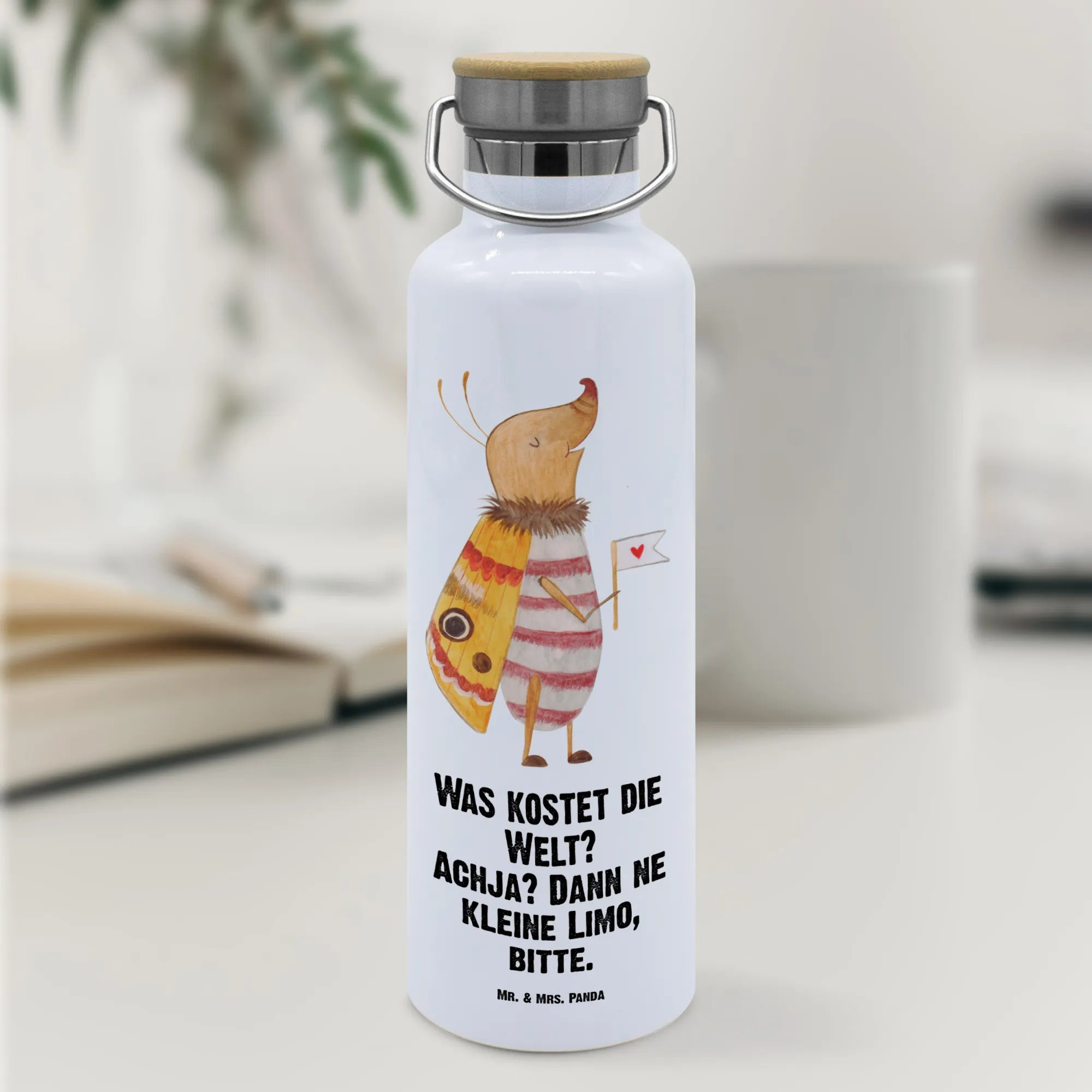 Gönn dir oder deinen Liebsten eine Portion Small World Magie im Alltag – mit der Trinkflasche "Nachtfalter mit Fähnchen" von Mr. & Mrs. Panda.