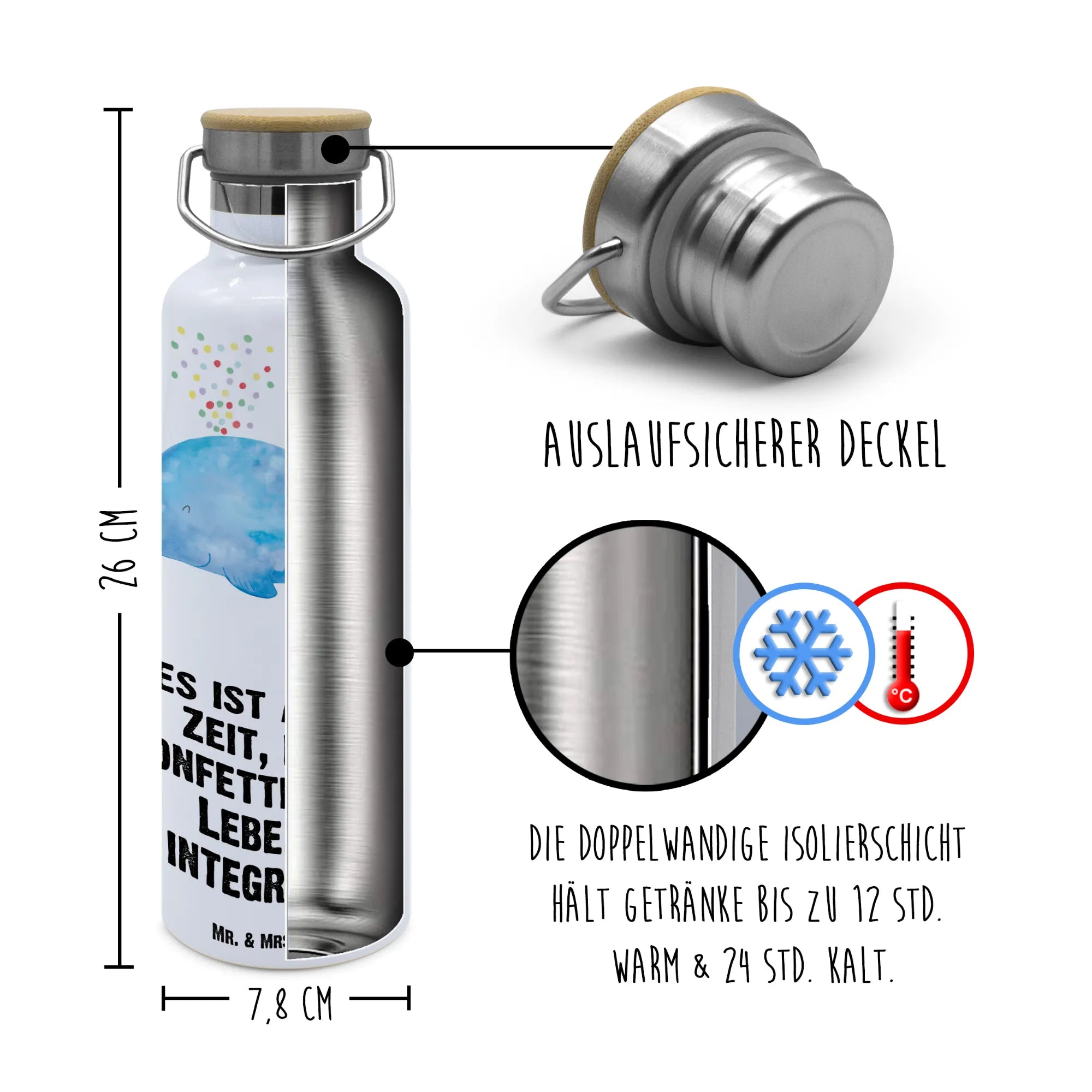Die Trinkflasche von Mr. & Mrs. Panda ist das perfekte Accessoire für alle, die Wert auf Stil und Funktion legen! Ihre Abmessungen von 255 mm x 78 mm und das Volumen von 750 ml machen sie zum idealen Begleiter für alle Abenteuer. Hergestellt aus doppelwandigem Edelstahl hält sie deine heißen und kalten Getränke lange frisch. Der hübsche Bambusdeckel setzt einen tollen Akzent. Egal, ob du deinen Kaffee zur Arbeit mitnehmen möchtest oder Erfrischungsgetränke für einen Ausflug planst, diese Flasche ist die Antwort auf all deine Bedürfnisse. Ihre bezaubernden Sprüche und Designs bringen jeden dazu, ein Lächeln zu tragen. Bitte verwende bei der Pflege nur eine sanfte Handwäsche, um die Schönheit deiner Flasche zu bewahren.