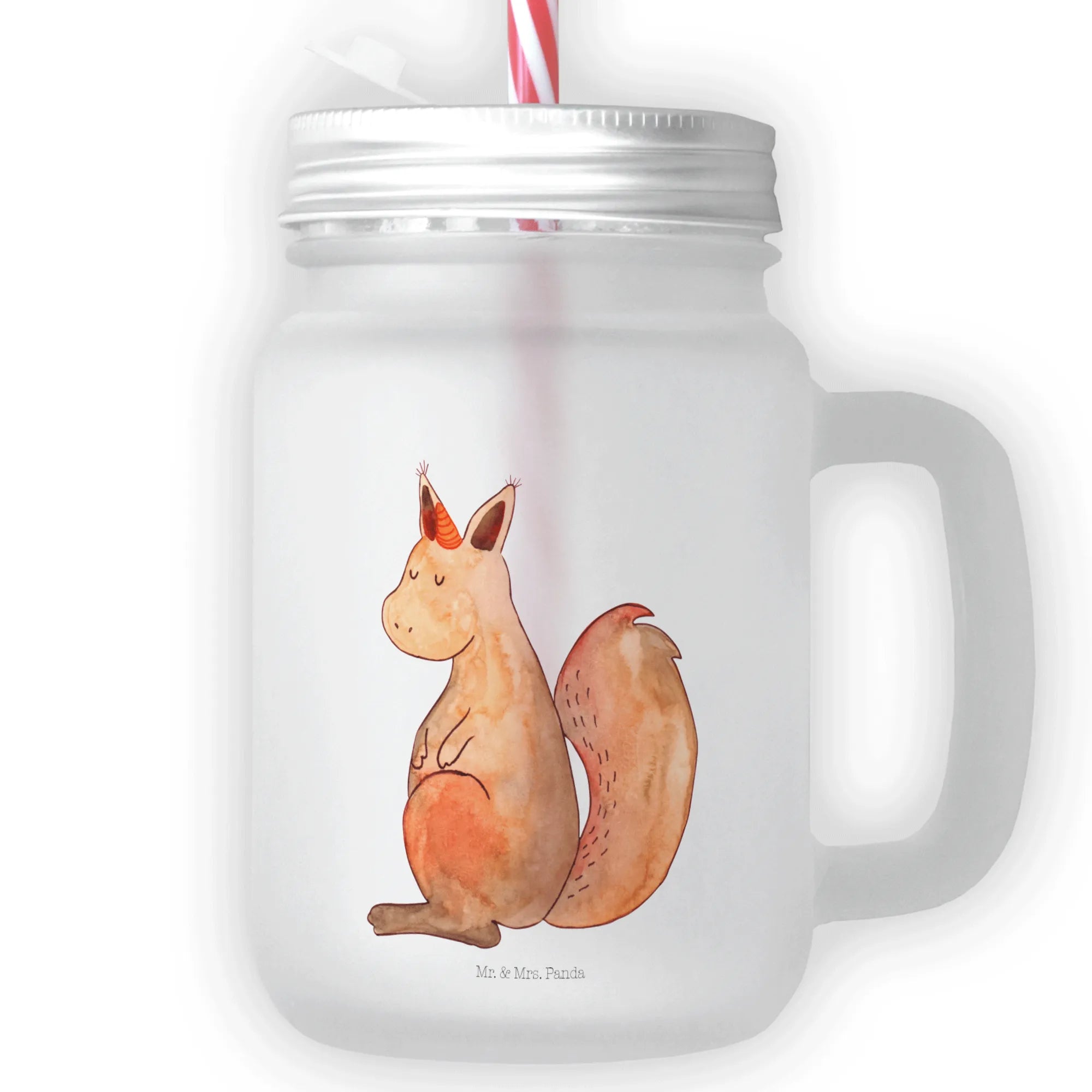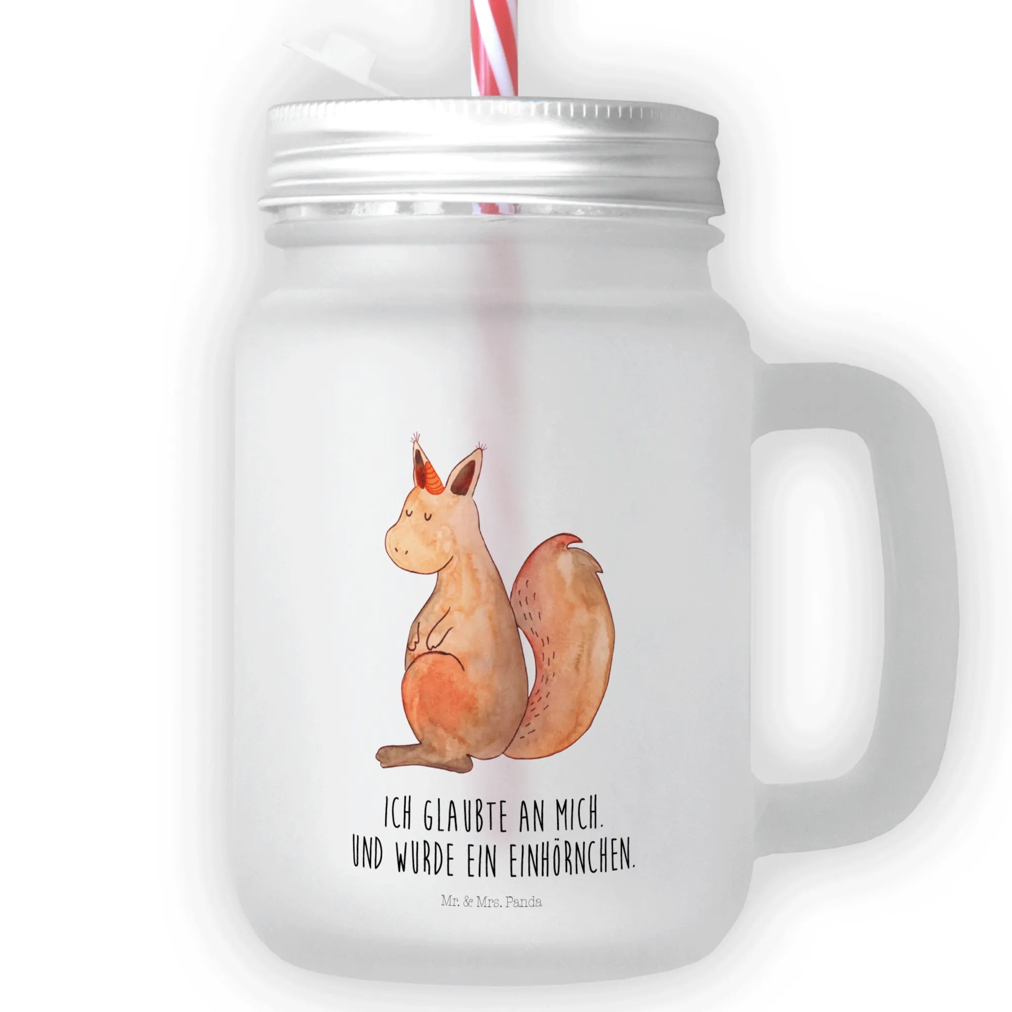 Das Trinkglas Mason Jar mit dem zauberhaften Motiv "Einhörnchen Glaube" aus der Einhorn-Kollektion von Mr. & Mrs. Panda ist die perfekte Wahl für alle, die das Besondere lieben. Dieses edle und sommerliche Trinkglas begeistert nicht nur durch sein einzigartiges Design, sondern auch durch seine Funktionalität. Mit seinem Handgriff und dem hochwertigen, satinierten Premiumglas fühlt es sich nicht nur großartig an, sondern zieht auch alle Blicke auf sich. Ob für kühle Sommergetränke, selbstgemachte Cocktails oder einen erfrischenden Eistee – dieses Glas ist der perfekte Begleiter für deine nächste Sommerparty.