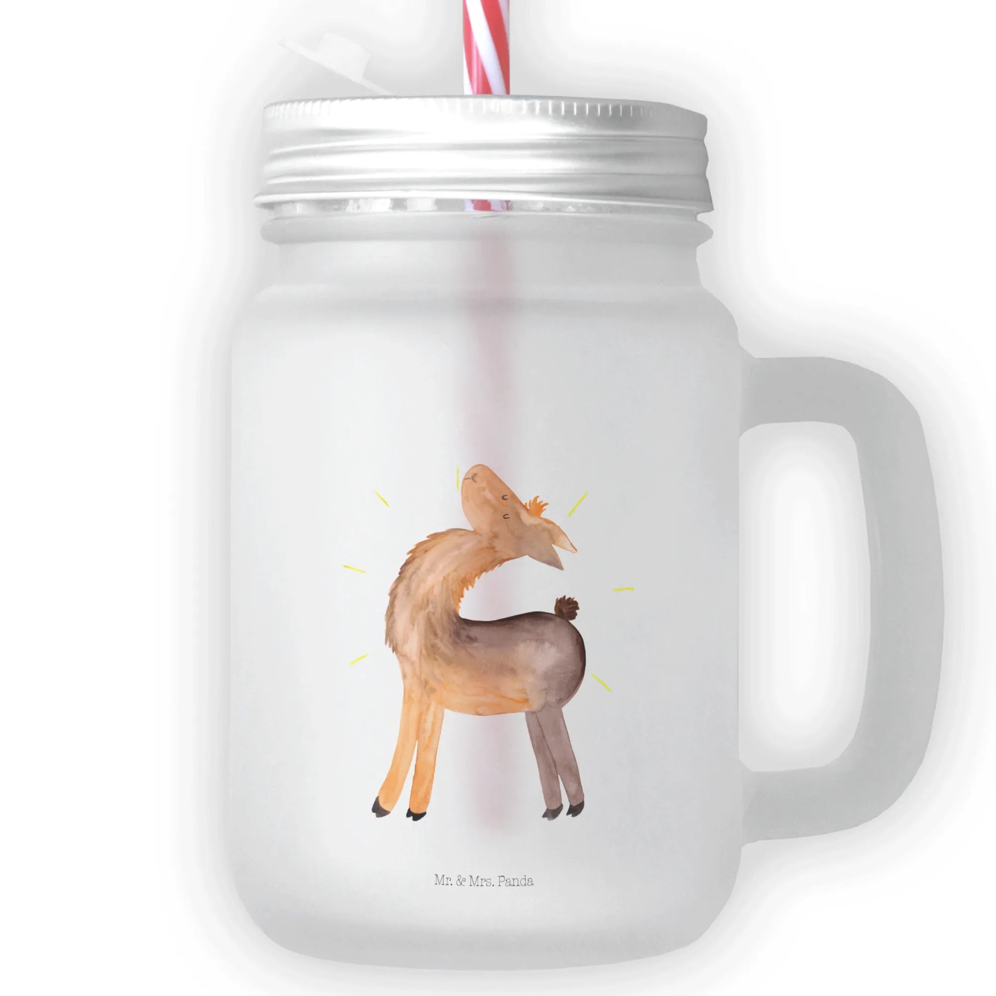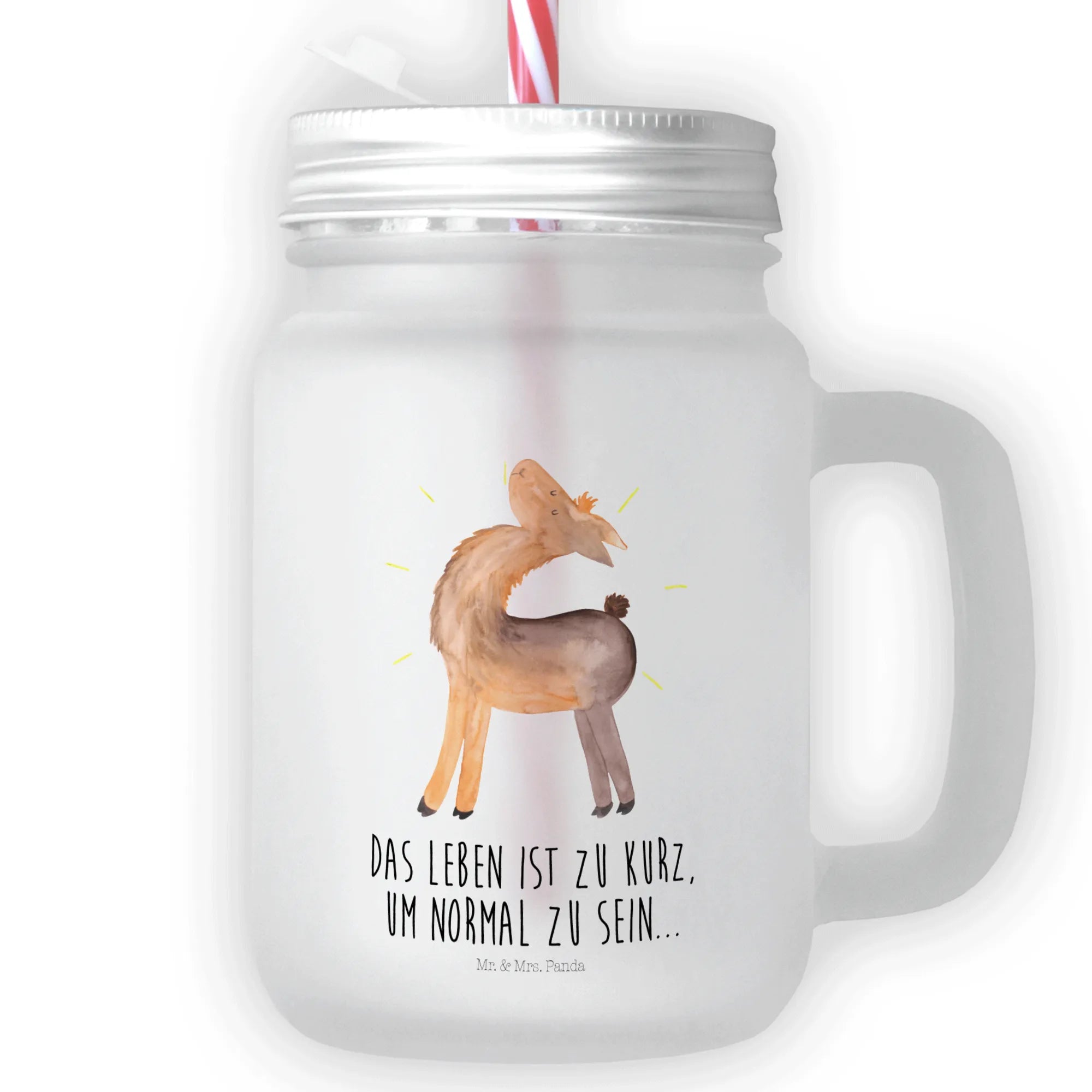 Das edle und sommerliche Trinkglas Mason Jar von Mr. & Mrs. Panda ist einfach perfekt für all deine leckeren Kaltgetränke. Mit dem süßen Motiv des stolzen Lamas bringt es Freude in jeden Schluck. Ob für selbstgemachte Limonade, erfrischende Cocktails oder einfach nur eisgekühltes Wasser – dieses Henkelglas ist ein echtes Must-Have.