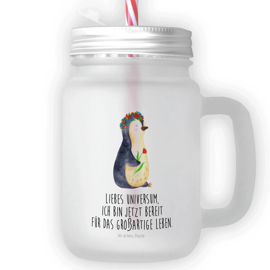 Das Trinkglas Mason Jar mit dem zauberhaften Pinguin Blumenkranz Motiv von Mr. & Mrs. Panda ist mehr als nur ein Trinkgefäß – es ist ein Statement für Lebensfreude und Kreativität!